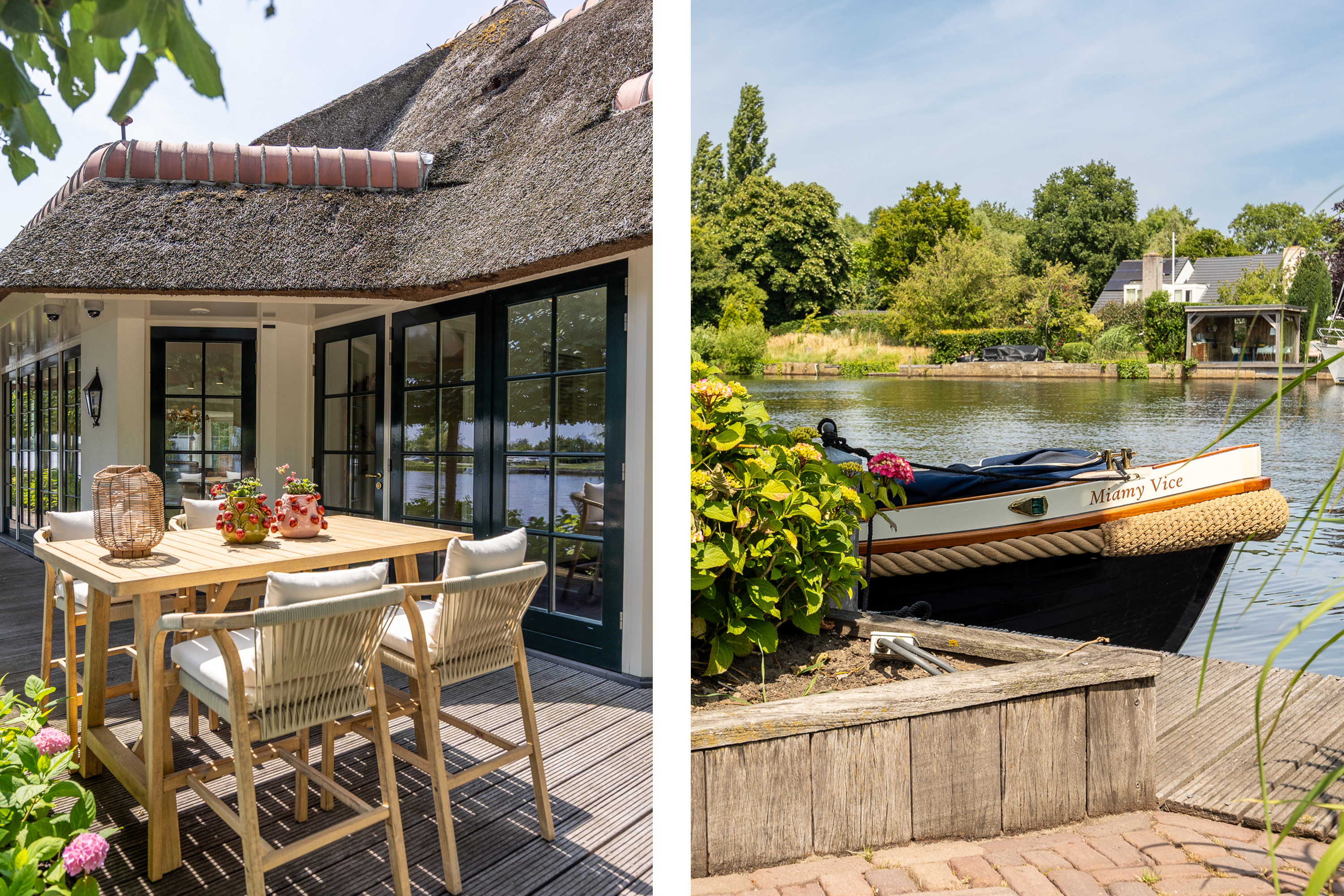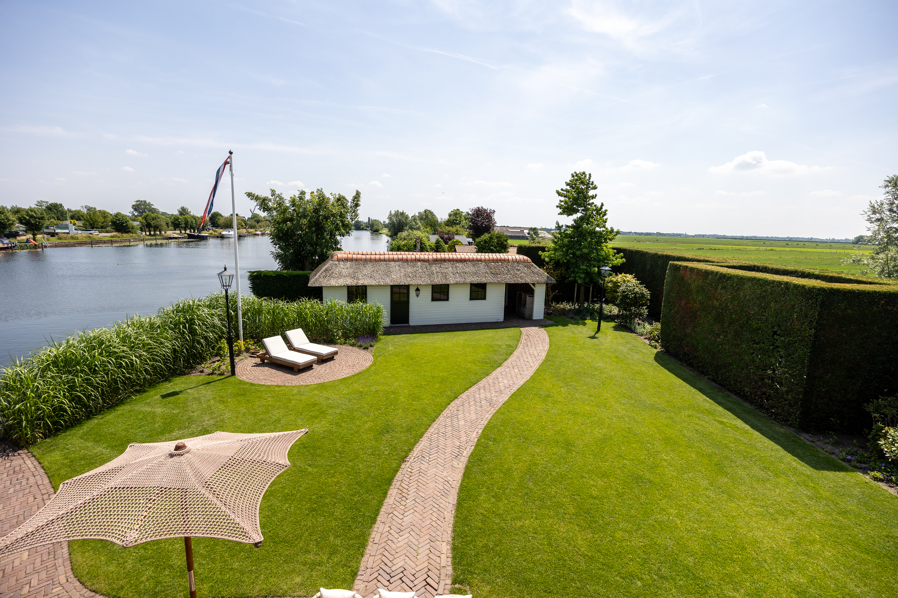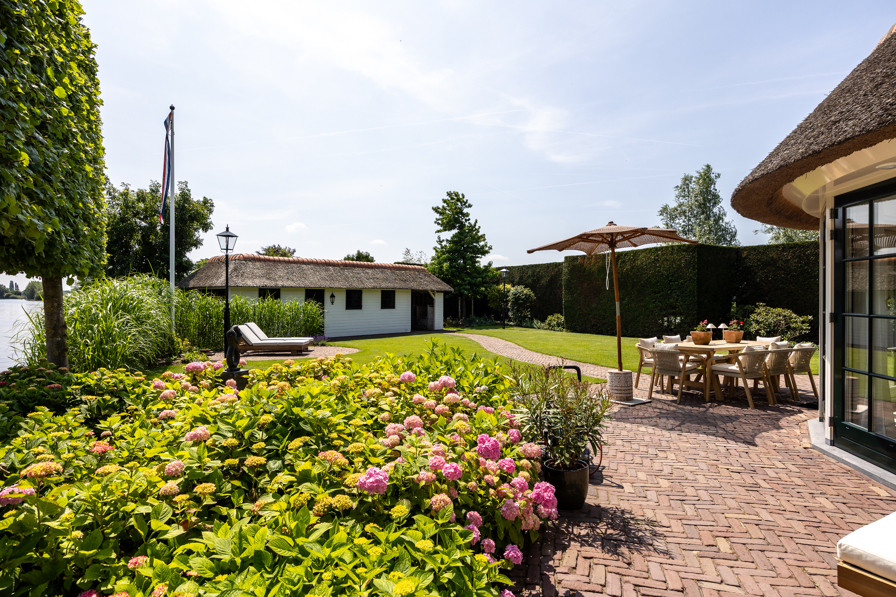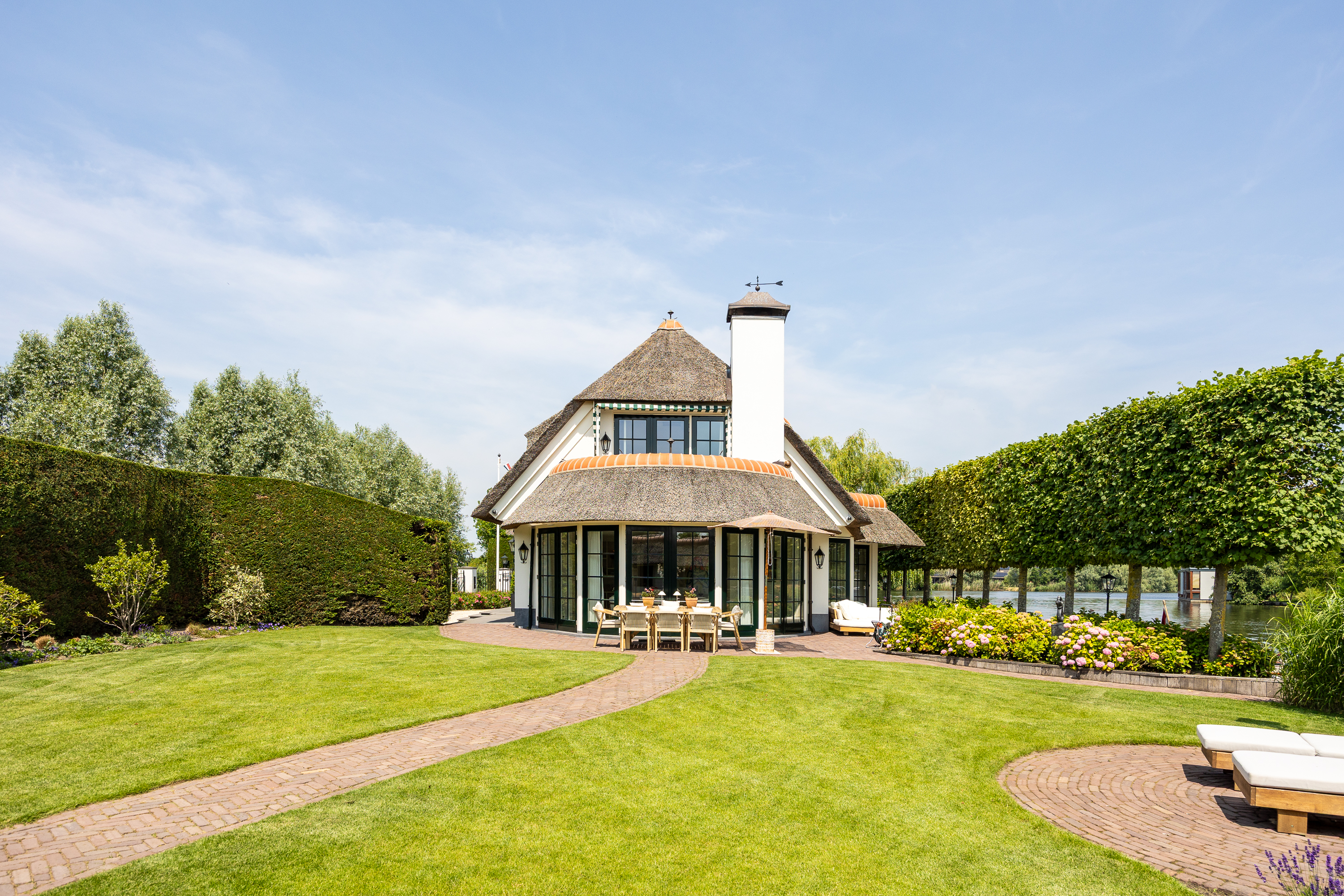 Vreelandseweg 99 in Nigtevecht - A beautiful, modern (completely renovated in 2023), luxurious, thatched villa on the majestic River Vecht, just outside Amsterdam. Living here means endless enjoyment with family and friends of the beautiful nature, the conviviality of water sports on the river, but also the ultimate peace and privacy that this magnificent place has to offer. And all this just a stone's throw (20 minutes) from Amsterdam and the charming villages of Nigtevecht and Vreeland (5 minutes).