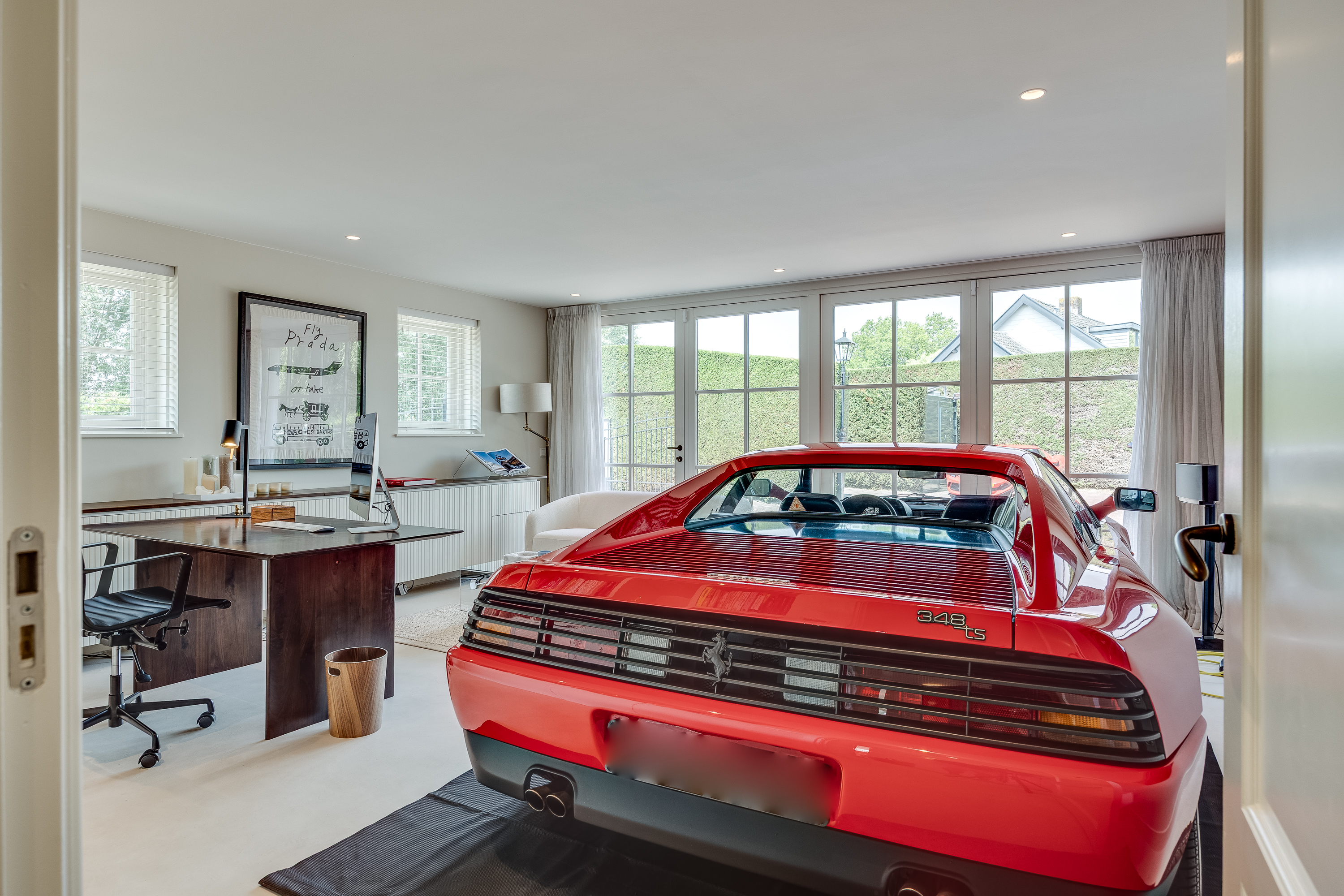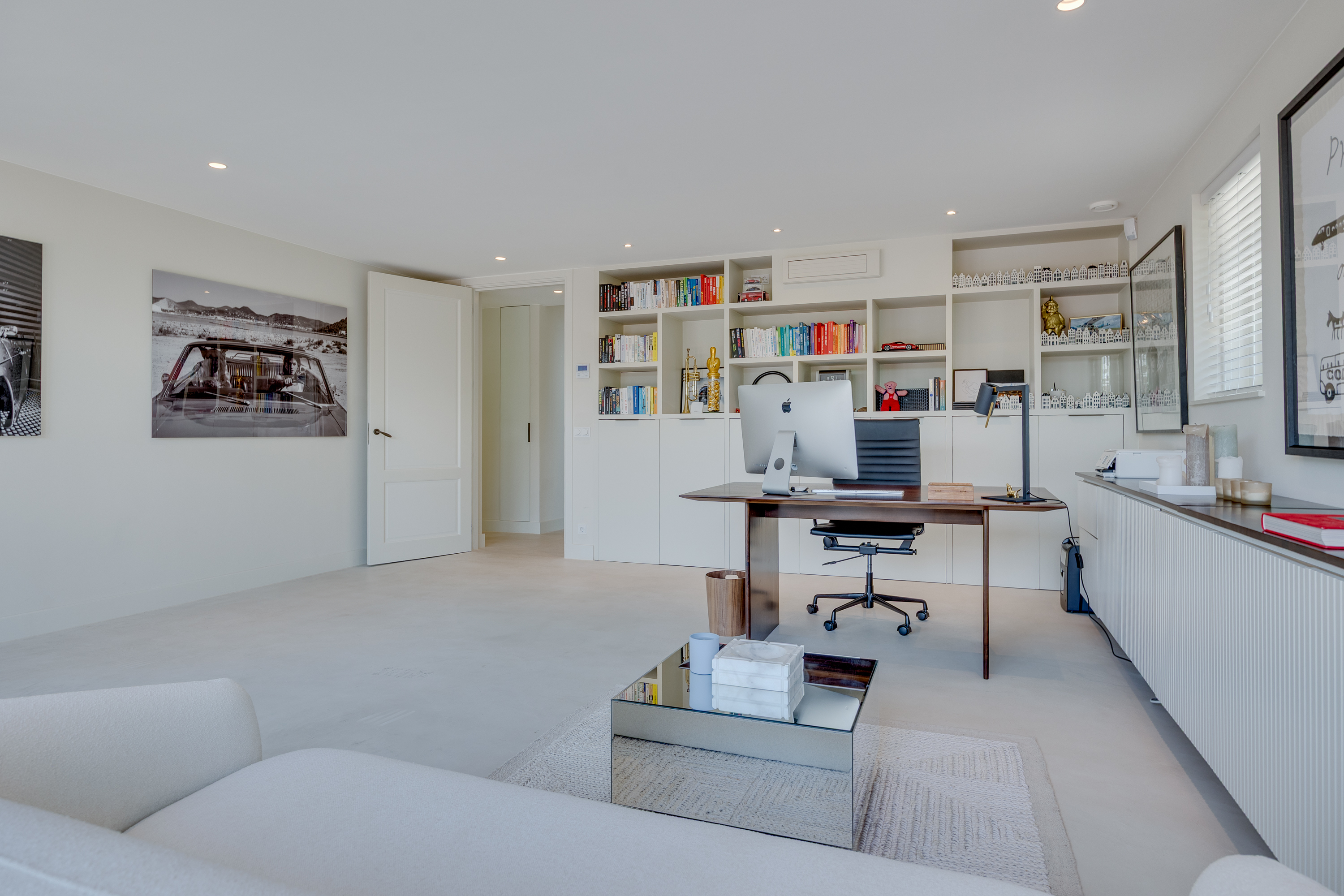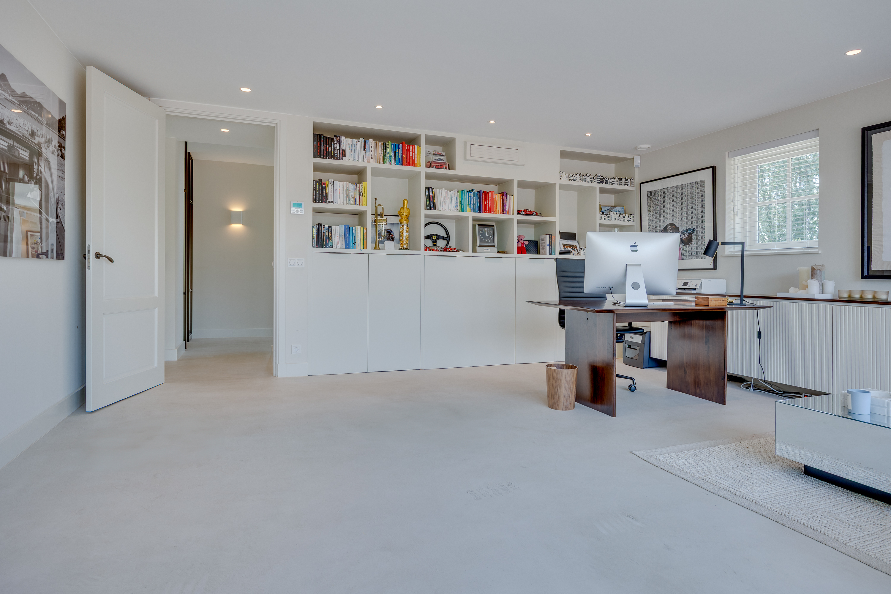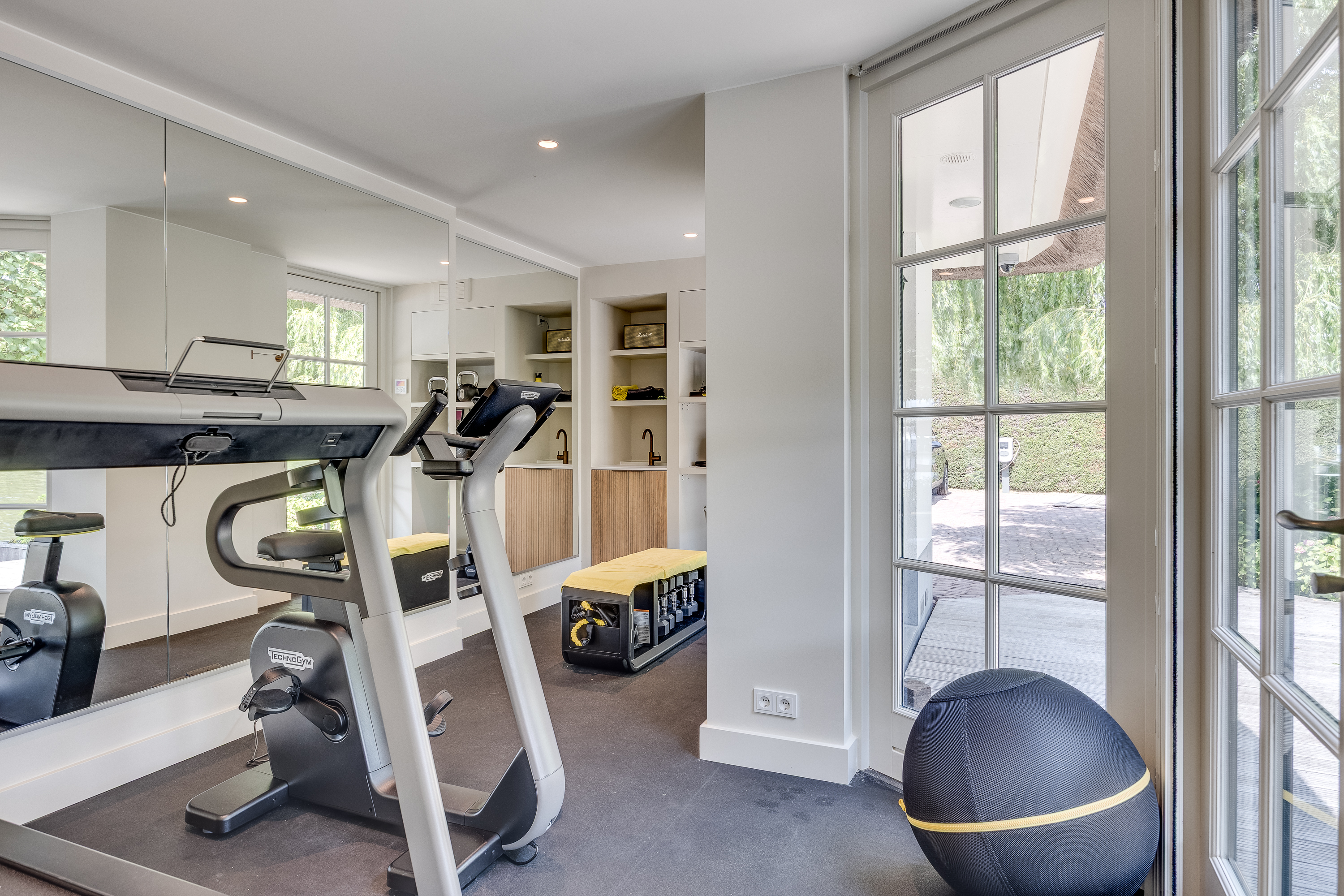 The delightful, spacious study where work and relaxation go hand in hand. Here you can concentrate on your work, and then just as easily do a few squats in the adjacent gym. The study is equipped with custom-made cupboards and, above all, lots of light. Thanks to the large double French doors, you can even park your car inside as a work of art! If you wish to live here for the rest of your life, the study can easily be converted into an extra bedroom with en-suite bathroom with a few adjustments.