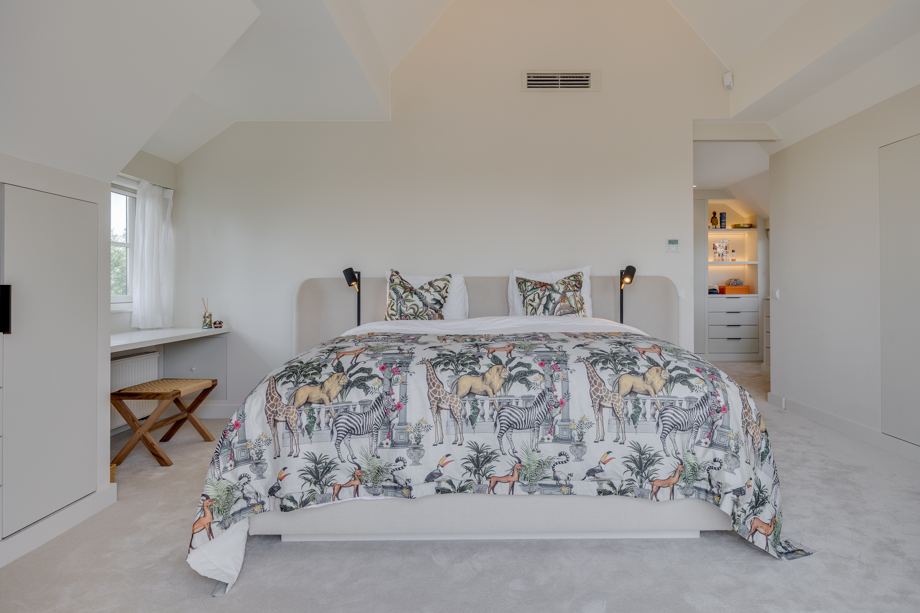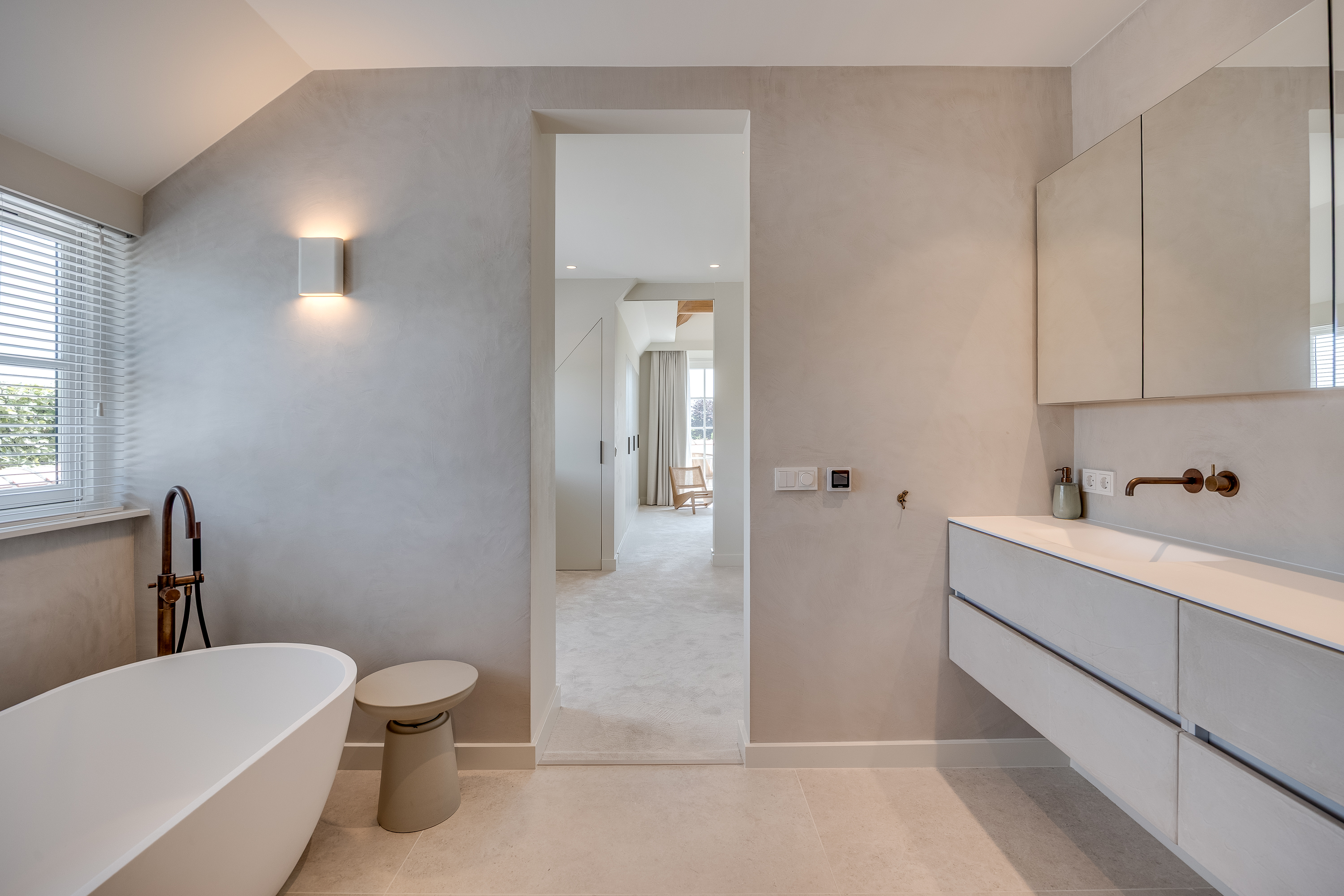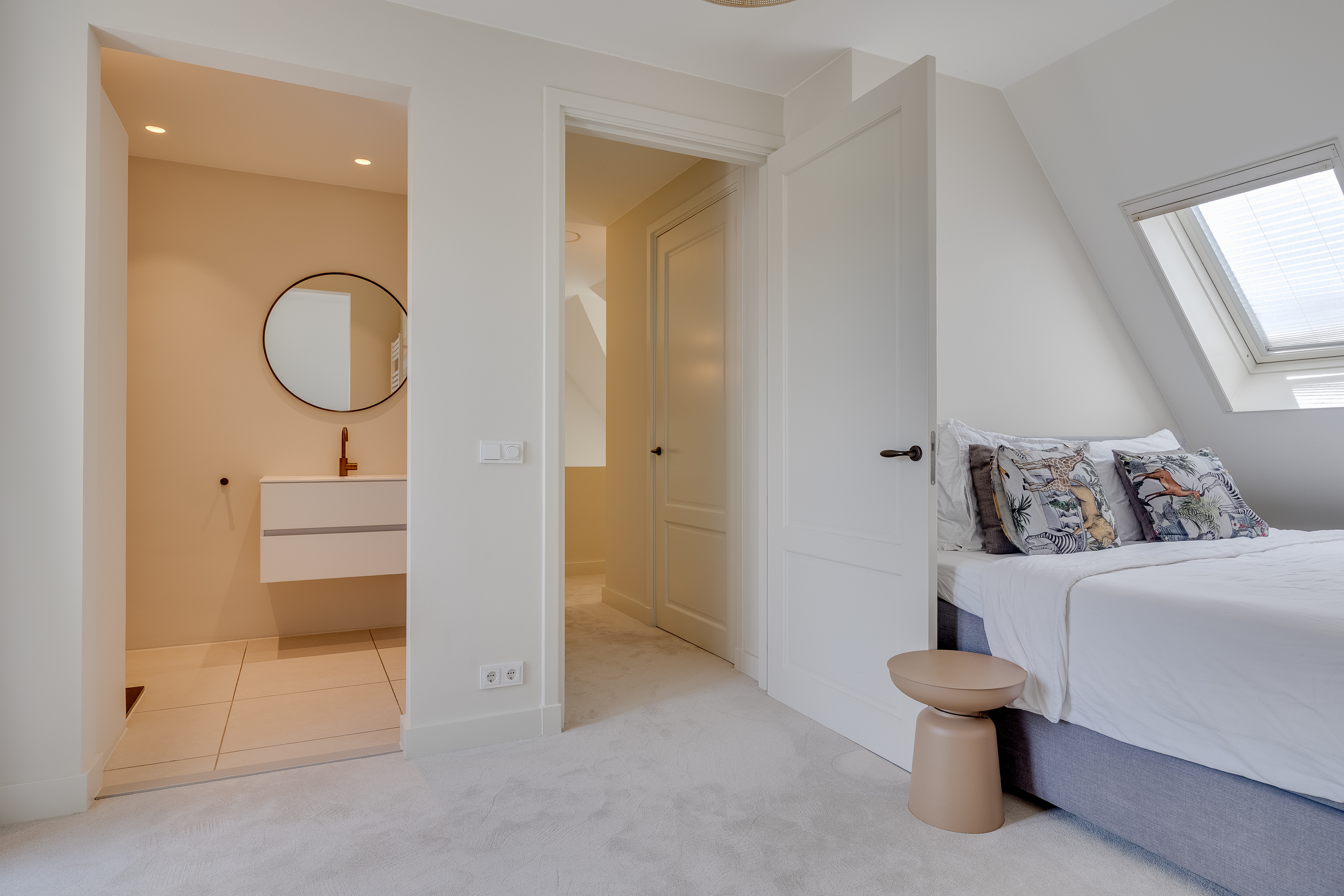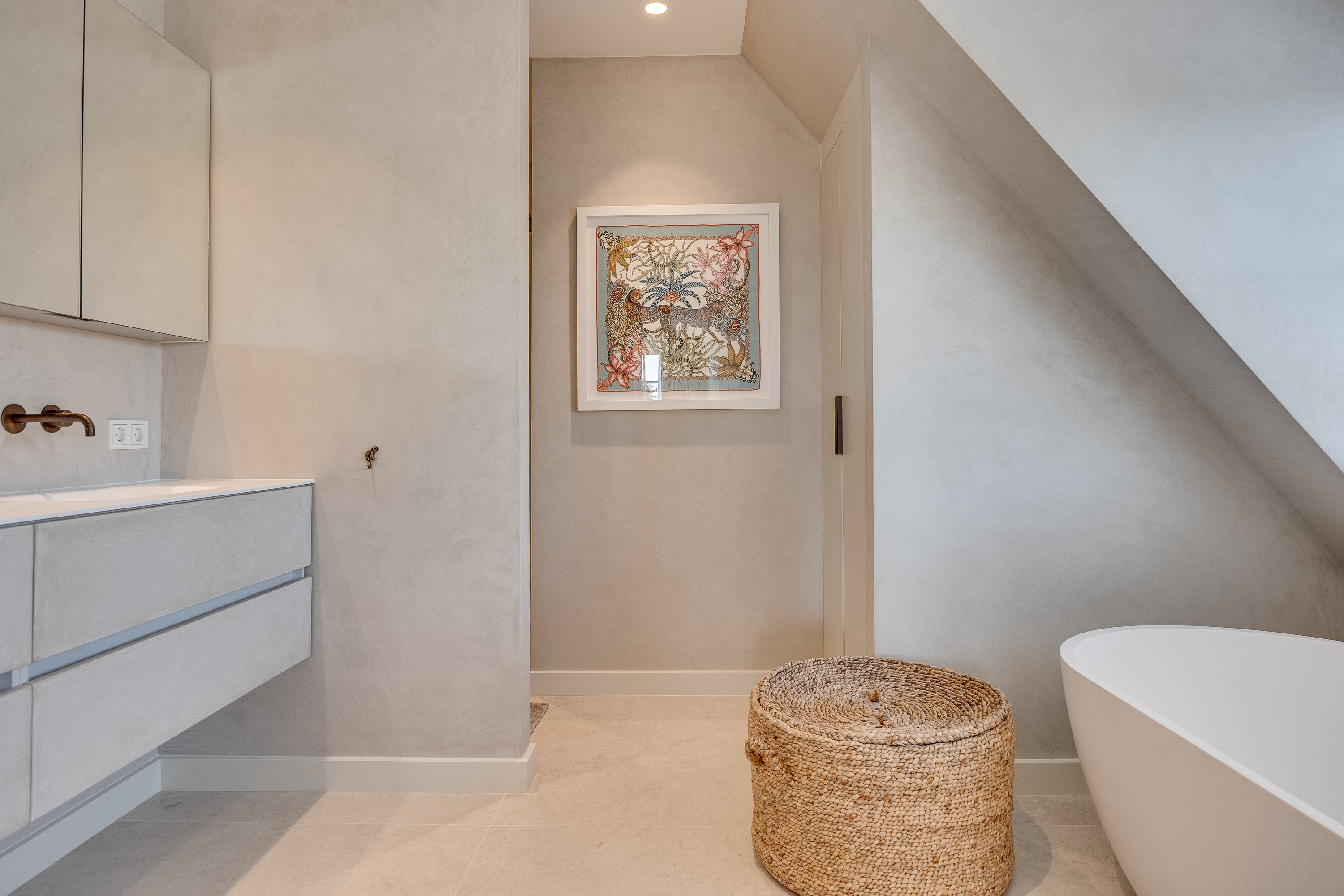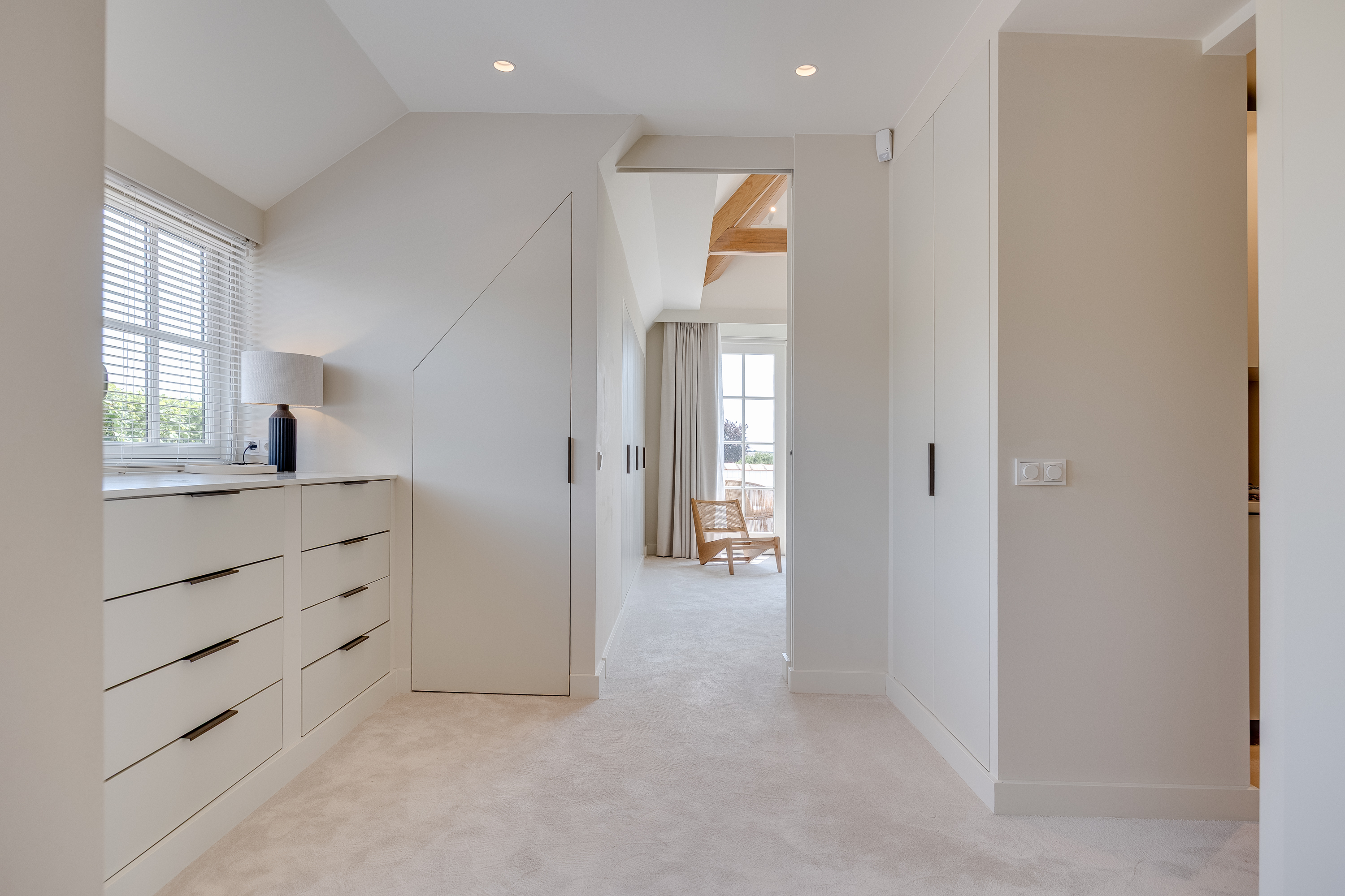 The delightful, spacious study where work and relaxation go hand in hand. Here you can concentrate on your work, and then just as easily do a few squats in the adjacent gym. The study is equipped with custom-made cupboards and, above all, lots of light. Thanks to the large double French doors, you can even park your car inside as a work of art! If you wish to live here for the rest of your life, the study can easily be converted into an extra bedroom with en-suite bathroom with a few adjustments.