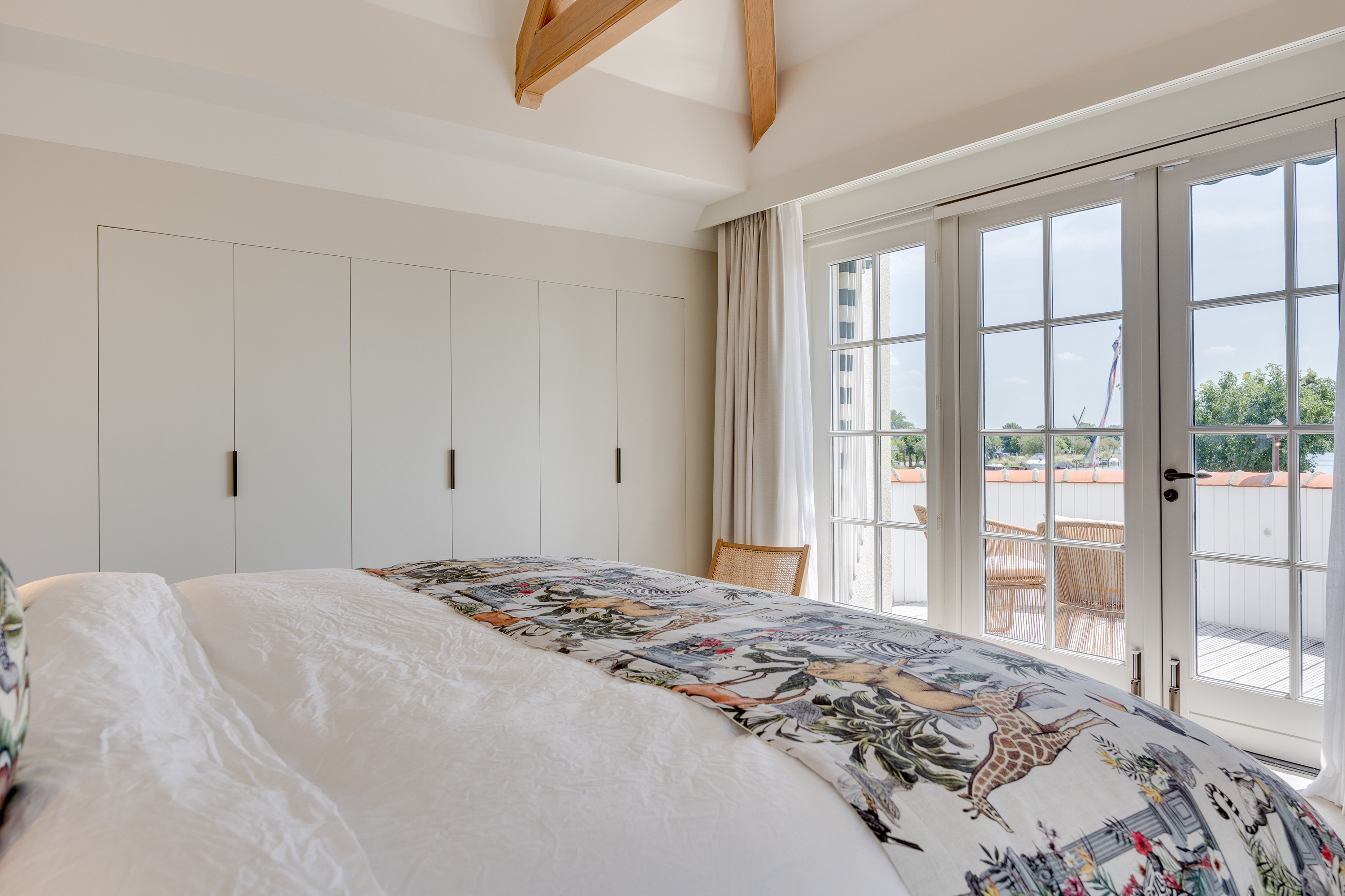 The upper floor features the master bedroom, fully equipped with an en-suite bathroom and walk-in closet. Here, the tranquility is almost tangible; beautiful sweeping views of the countryside and the Vecht river through the French doors and the indoor balcony. All you can hear is the rippling water and the soft singing of the (water) birds. There is also a luxurious second bedroom with its own en-suite bathroom. Time to end your working day? Close your laptop and stroll through the garden, or grab your boat and set sail. A well-deserved dip is, of course, also an option.