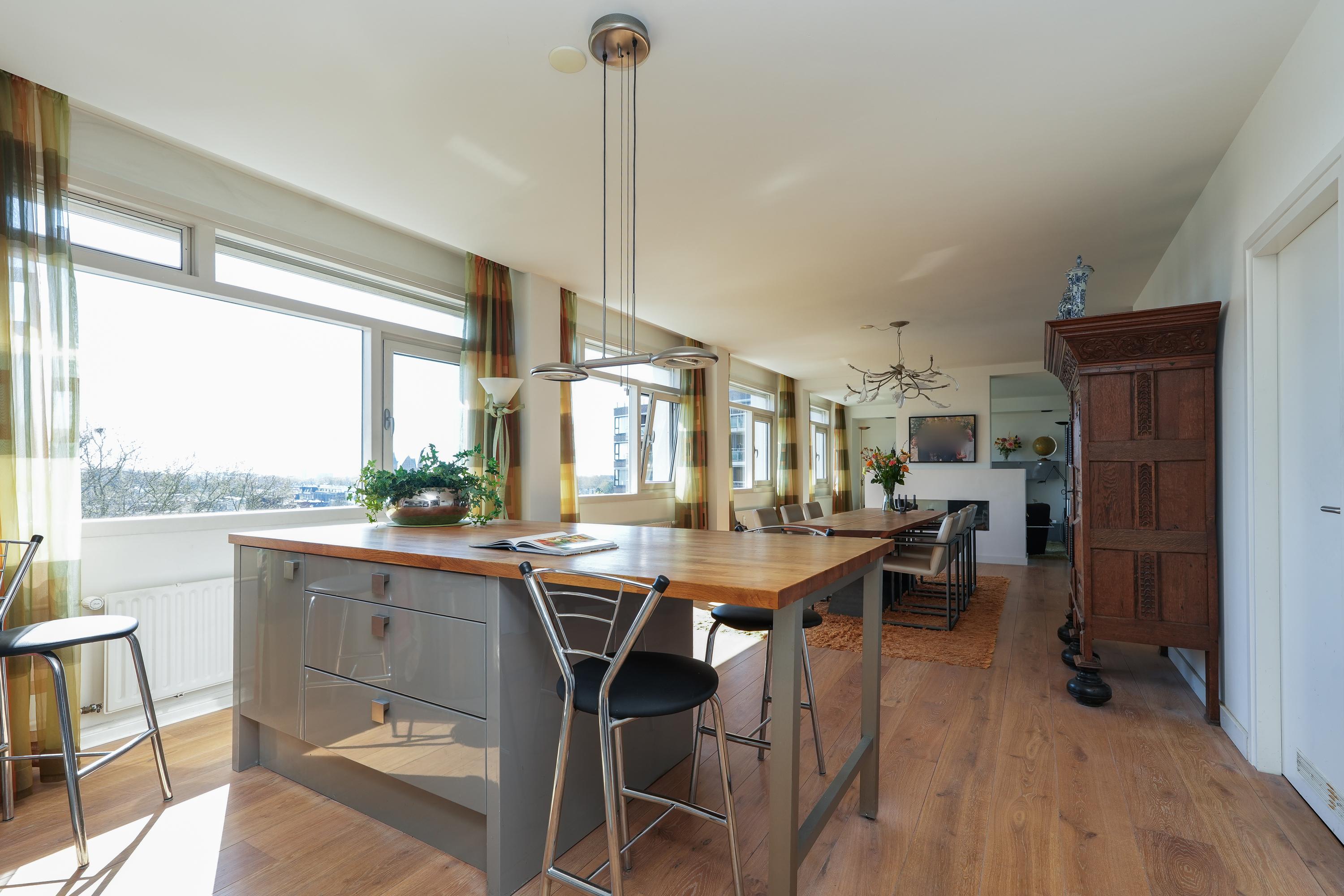 The apartment was created in 2009 by combining two separate units (numbers 44 and 46), resulting in an exceptionally spacious and well-organised home with a clear separation between the living area (44) and the sleeping wing (46). During this process, the apartment was fully and high-quality renovated. A solid oak floor in the living room and hallway, combined with clean finishes and abundant natural light, creates a warm and luxurious atmosphere. Large windows on all sides provide impressive sightlines and panoramic views over the Waal Bridge, the Ooijpolder and the city. Privacy, comfort and refined finishes come together here in a truly unique living experience.