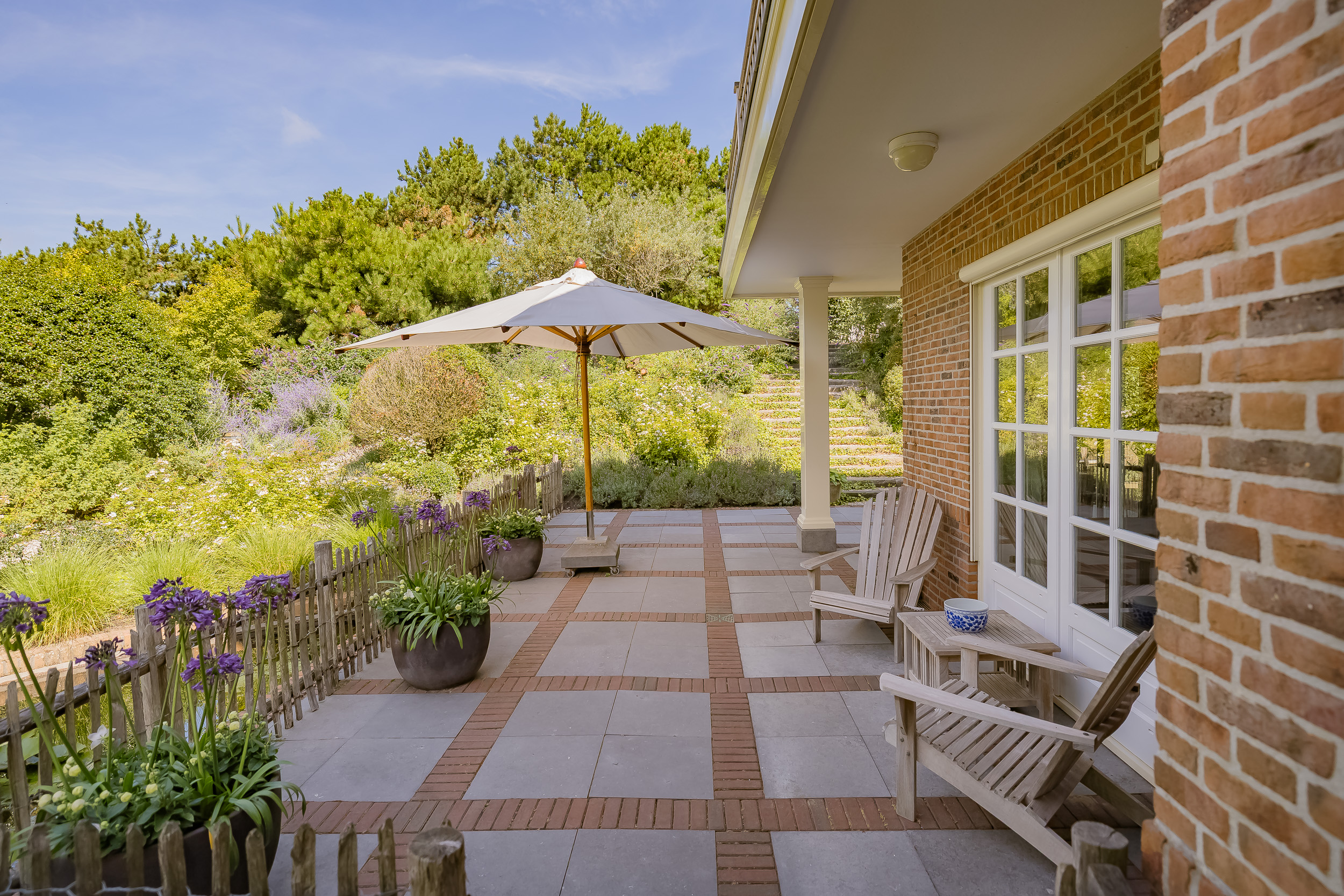 The garden is truly enchanting. Designed by architect Arend Jan van der Horst, it slopes gently with the dune landscape and offers an oasis of peace and beauty. Terraces, various seating areas, large trees, richly flowering borders, a pond with a deck terrace, and elegant shell paths create a unique outdoor experience. A place to enjoy endlessly.