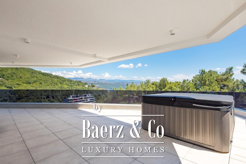 The building itself exemplifies contemporary architecture with DEMIT and ventilated facades, brown aluminum carpentry, and large-format composite panels. Amenities include a shared gym and wellness area, video surveillance, elevator access, and landscaping illuminated in LED. Designed for discretion and seclusion, this luxury apartment for sale in Opatija invites residents to experience clarity, light, and extraordinary tranquility above the city and sea.