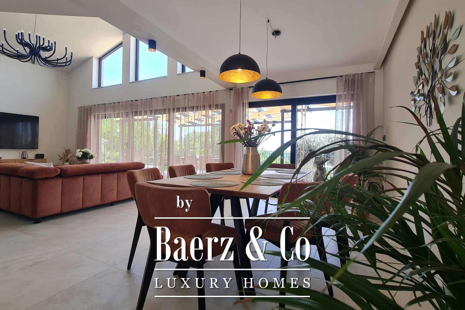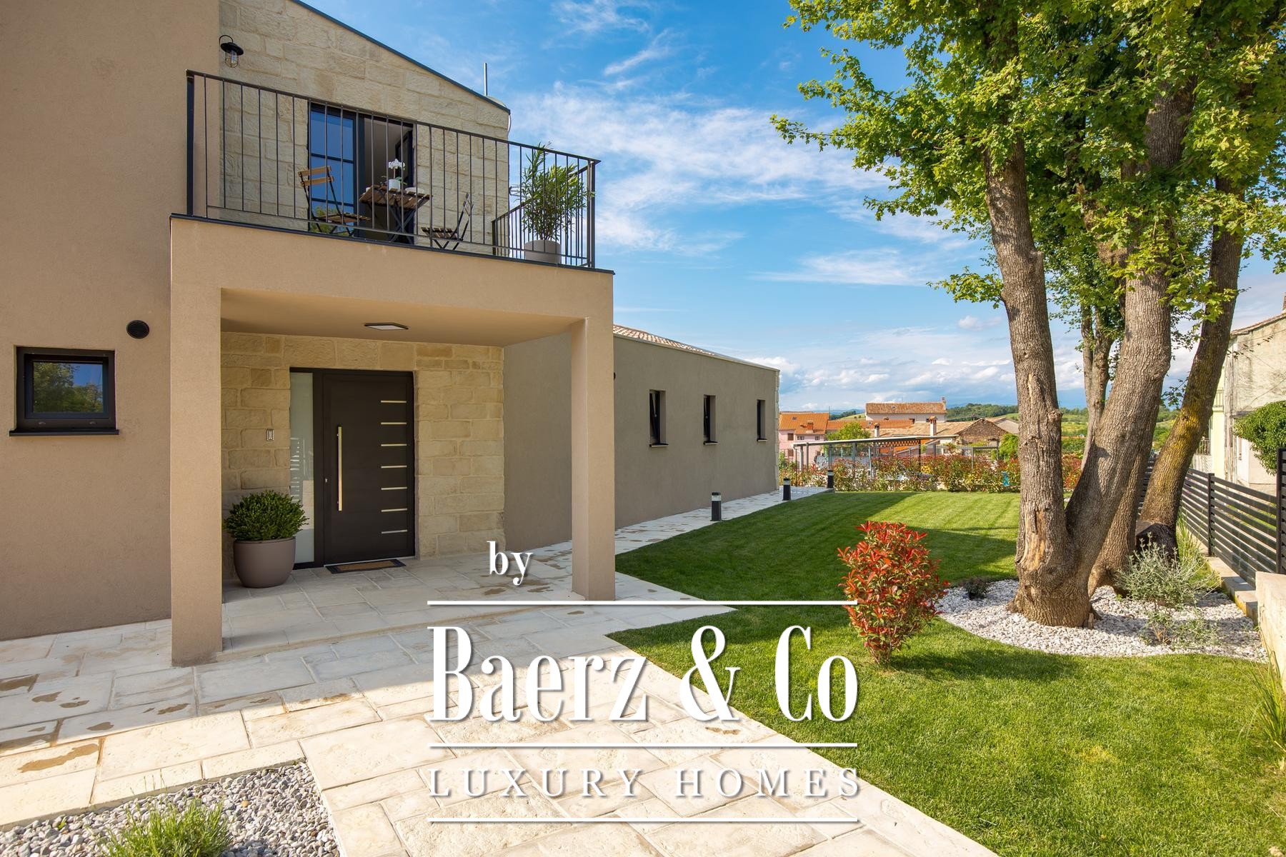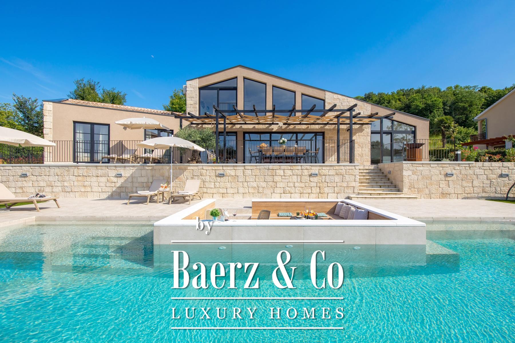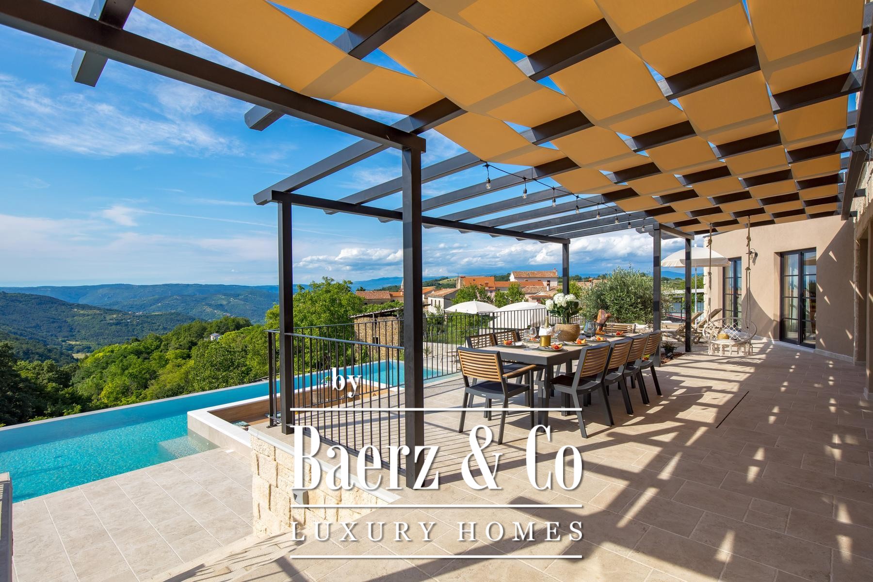 Luxury villa Pazin Okolica offers 230 m² of contemporary living space, set within a gated 1,420 m² plot surrounded by the gentle hills of Istria. The property commands sweeping panoramic views stretching from the lush landscape to Slovenia and Italy, delivering a rare sense of openness and seclusion synonymous with the region.