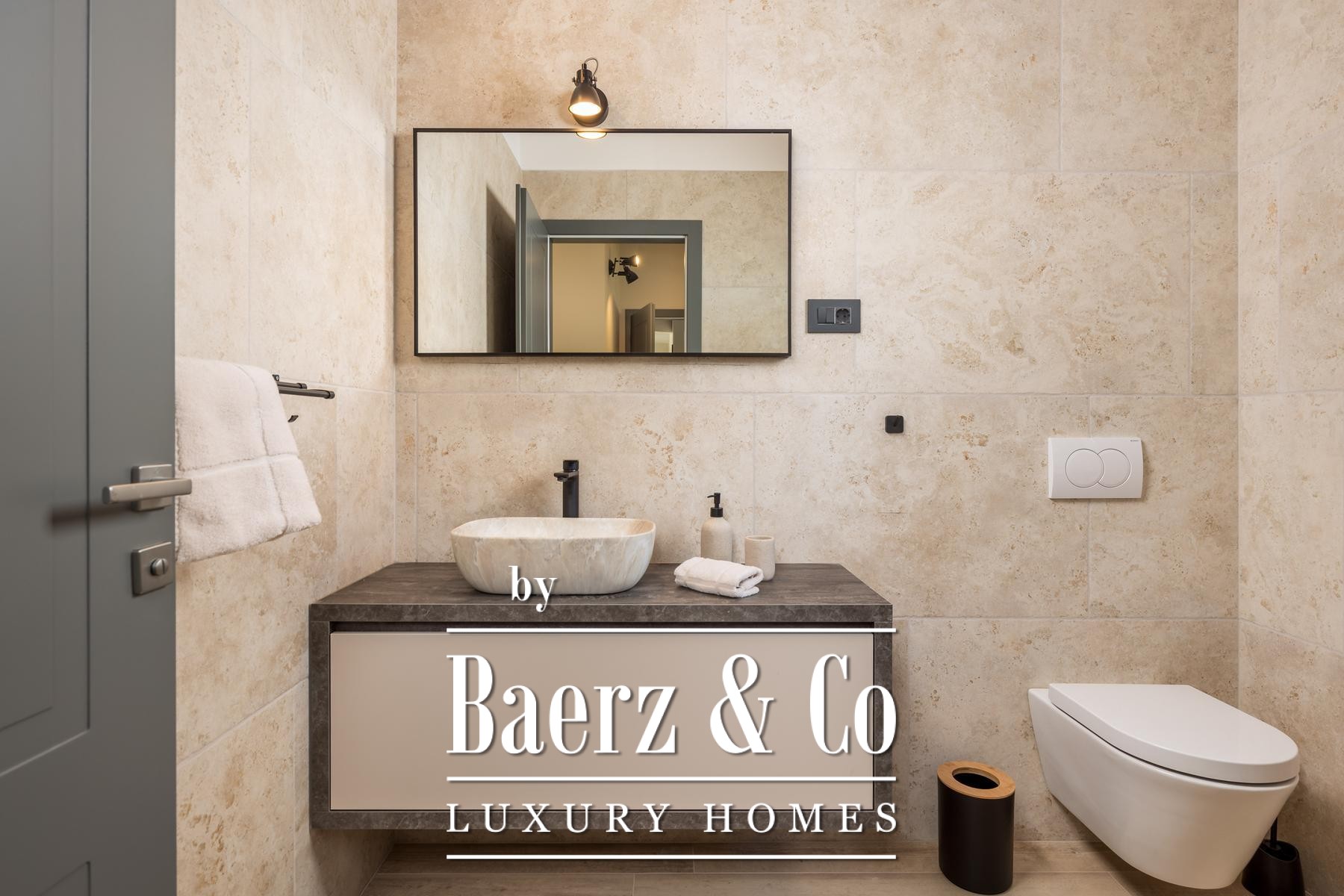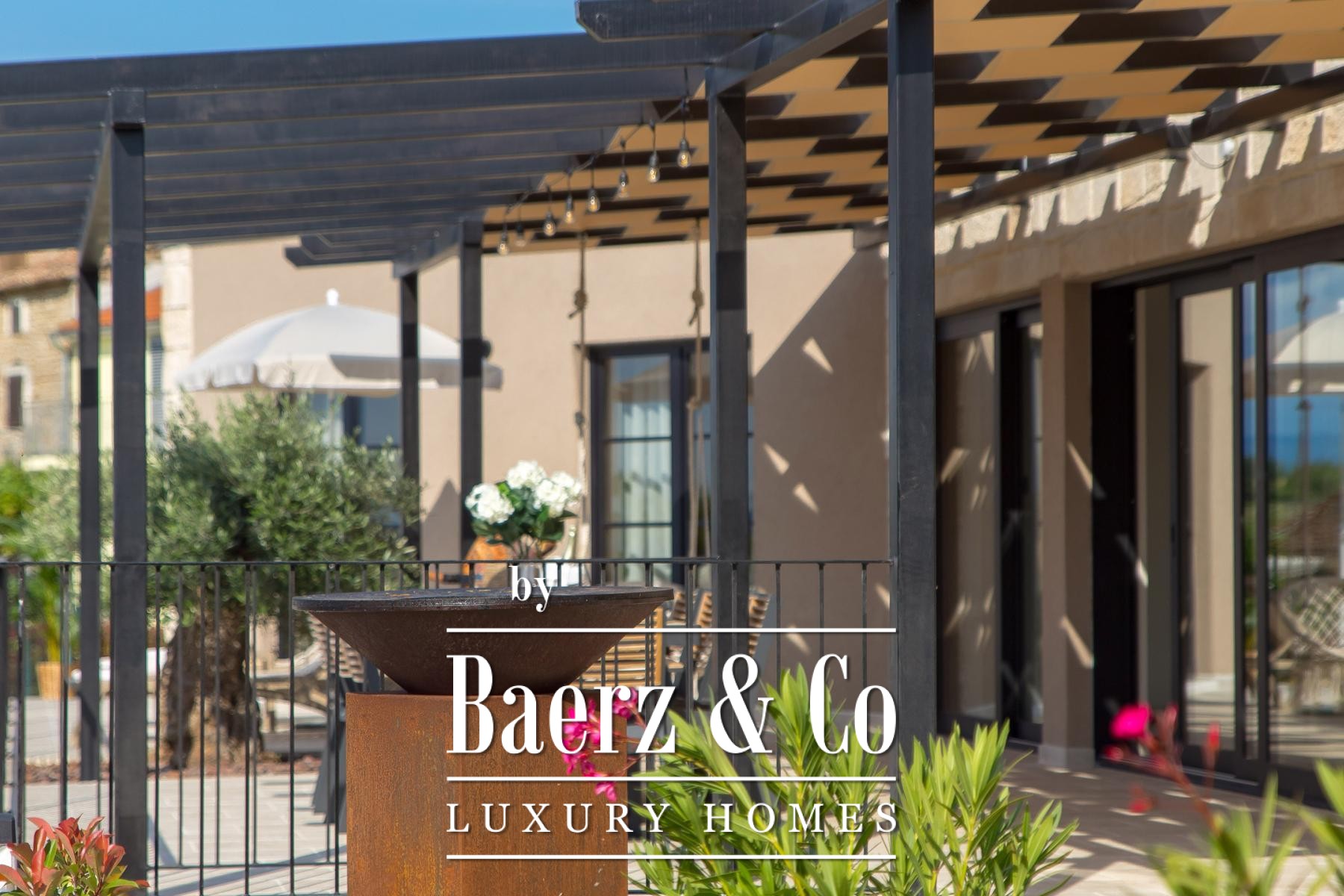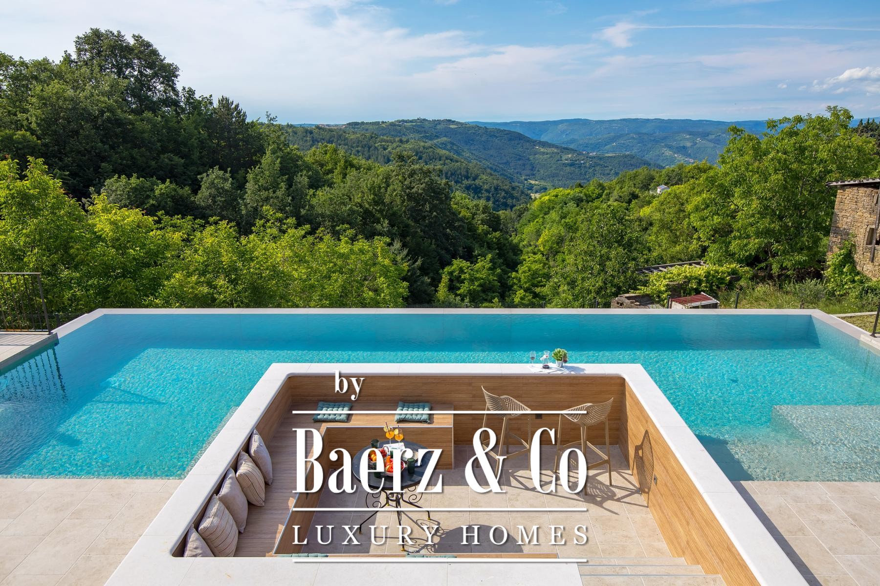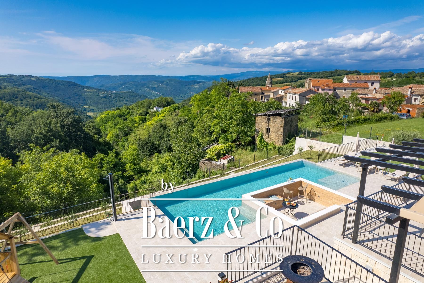 The exterior features a three-sided infinity pool, relaxation zones and meticulous landscaping to secure privacy and peace. Underfloor heating, eight air-conditioning units and a wood-burning fireplace ensure comfort through all seasons. Covered parking for three vehicles completes a residence that merges luxury, authenticity and the quiet grandeur of Istria. This luxury villa for sale in Pazin Okolica is equally suited to private retreat or discreet investment.