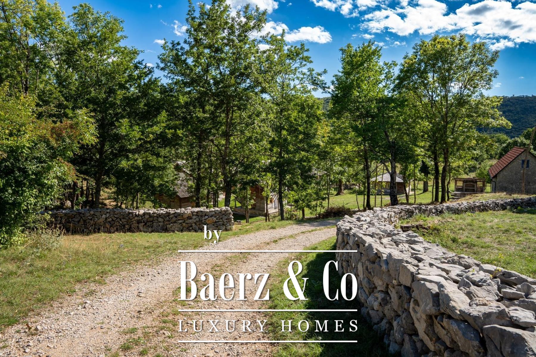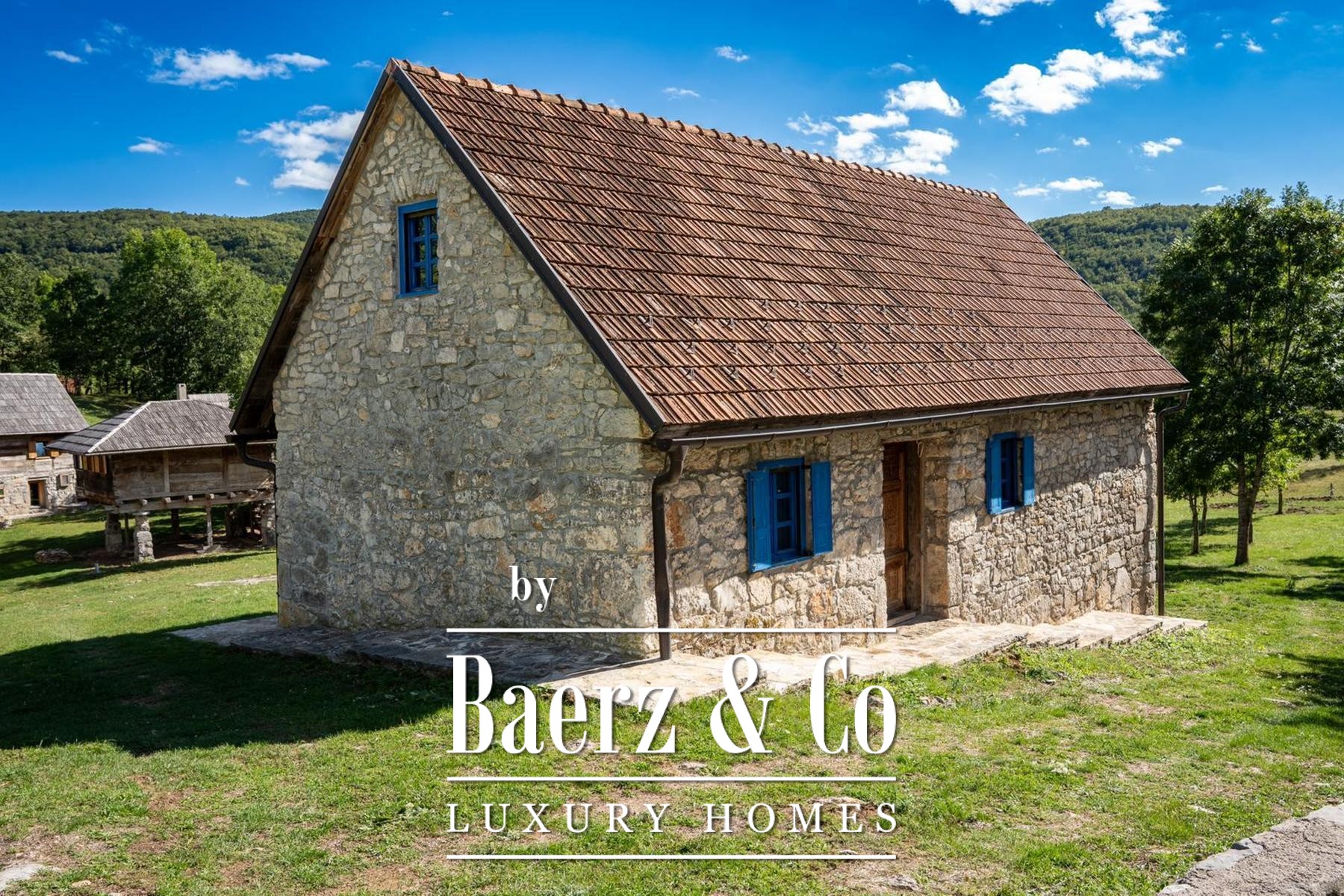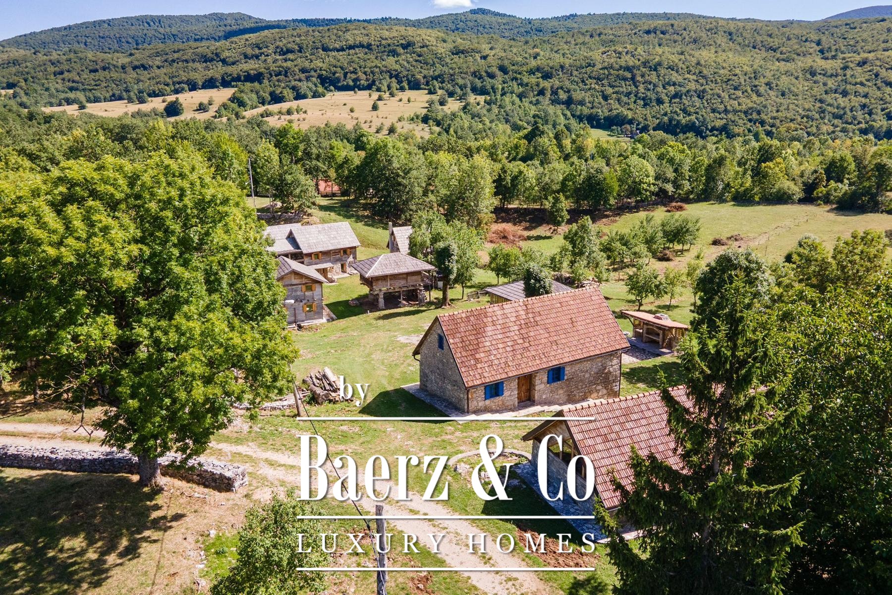 Estate for sale Plitvička Jezera presents a rare opportunity to acquire a fully gated 40,000 m² estate, composed of 11 meticulously renovated and stylistically cohesive houses. The property stands as a unified retreat, complete with controlled access and deep privacy. At its heart lie a main residence and a spacious communal house, equipped with a chef’s kitchen and generous dining area conceived for gatherings, corporate programs, or creative retreats. Nine additional guest houses, each offering two bedrooms with private bathrooms, provide a total minimum of 22 en-suite rooms suited for hosting up to 44 guests.