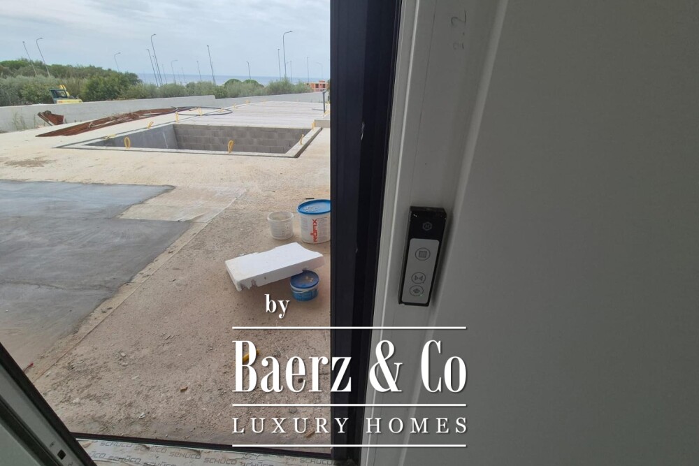 The ground floor welcomes you with an entrance hall, where an open living room, dining space, and kitchen unfold in a seamless flow. Floor-to-ceiling Schuco sliding glass walls line the perimeter, introducing gentle natural light and connecting the interior to the outdoor terrace where a heated pool, jacuzzi, and a summer kitchen set the tone for relaxed gatherings.