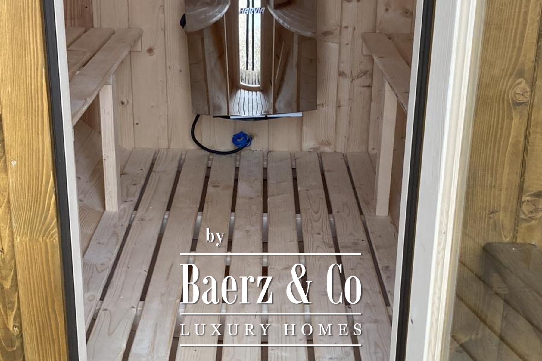 Solar panels discreetly underscore the residence’s commitment to energy efficiency, while its 827 m² landscaped plot is anchored by a private swimming pool complemented by a sunbathing area and a sauna for a subdued sense of retreat. The garage and garden extend both practicality and leisure, gathering friends and family in privacy among carefully maintained grounds.