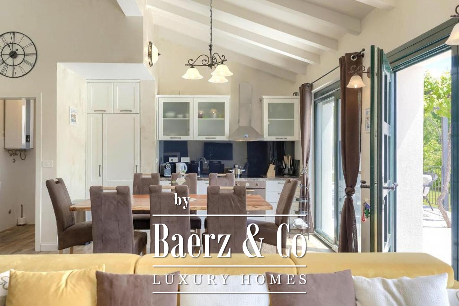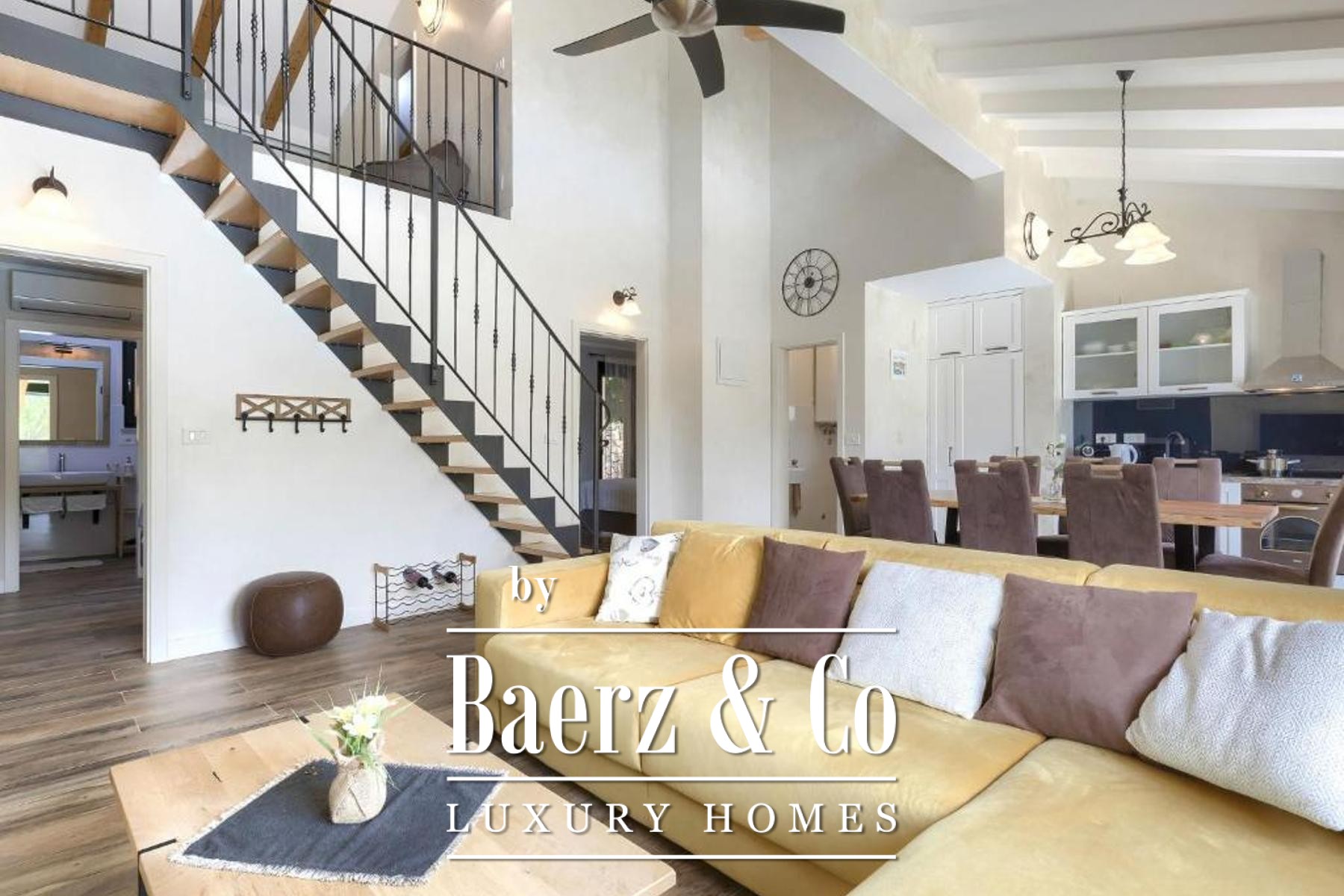 The guest house offers a private living room with kitchen, a separate bedroom and bathroom, ensuring autonomy within the estate. Outdoors, a saltwater swimming pool of 32 m² is framed by sun terraces. A pergola-shaded dining area and a large open fireplace invite gatherings, while the fully fenced landscaped grounds are served by an automatic irrigation system from a private well.