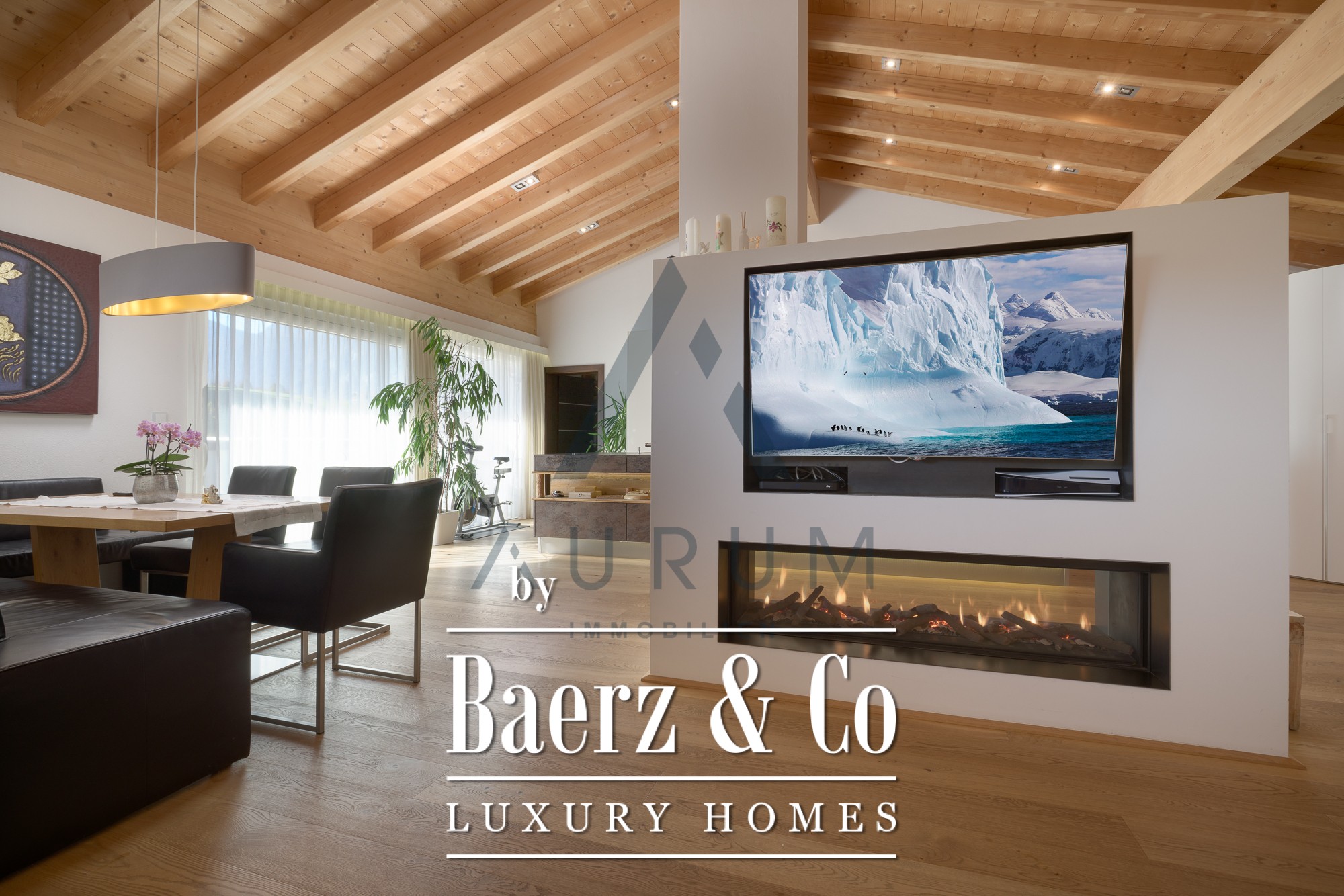 South and west orientation bathes the apartment in sunlight. The private terraces invite a slow rhythm—lounge seating, a whirlpool, and mountain horizon become essential elements of daily life. Storage is ample, with 4 m² from the attic and a separate 13 m² basement room, as well as two underground parking spaces.