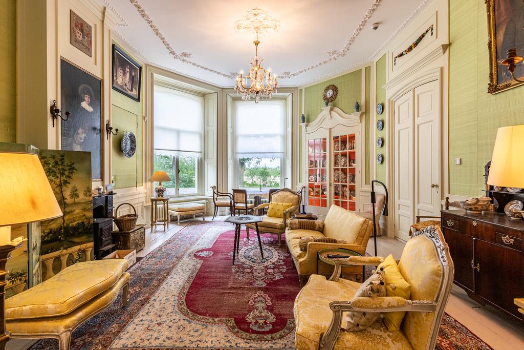 The interior is rich in period details, including ornate fireplaces, damask wall coverings, refined staircases and bespoke finishes.