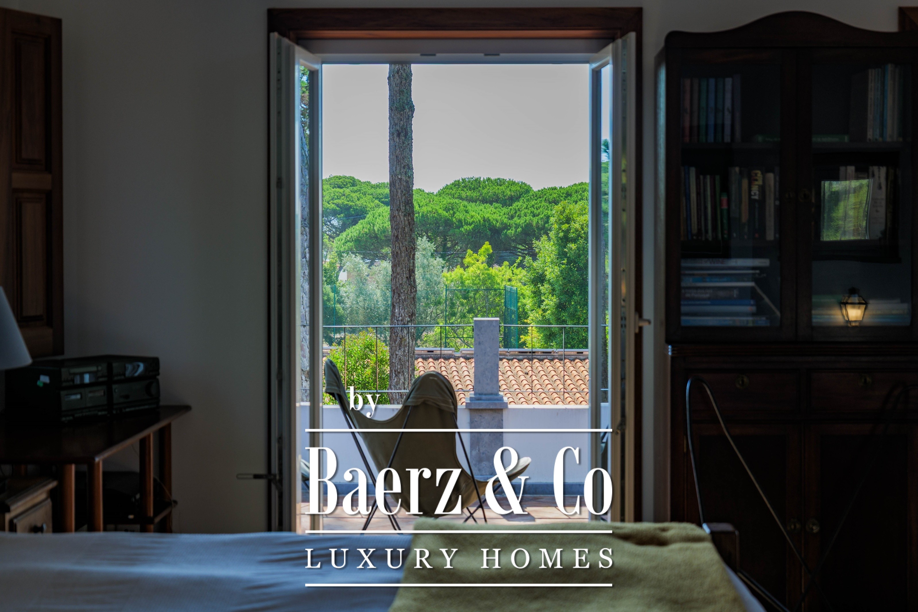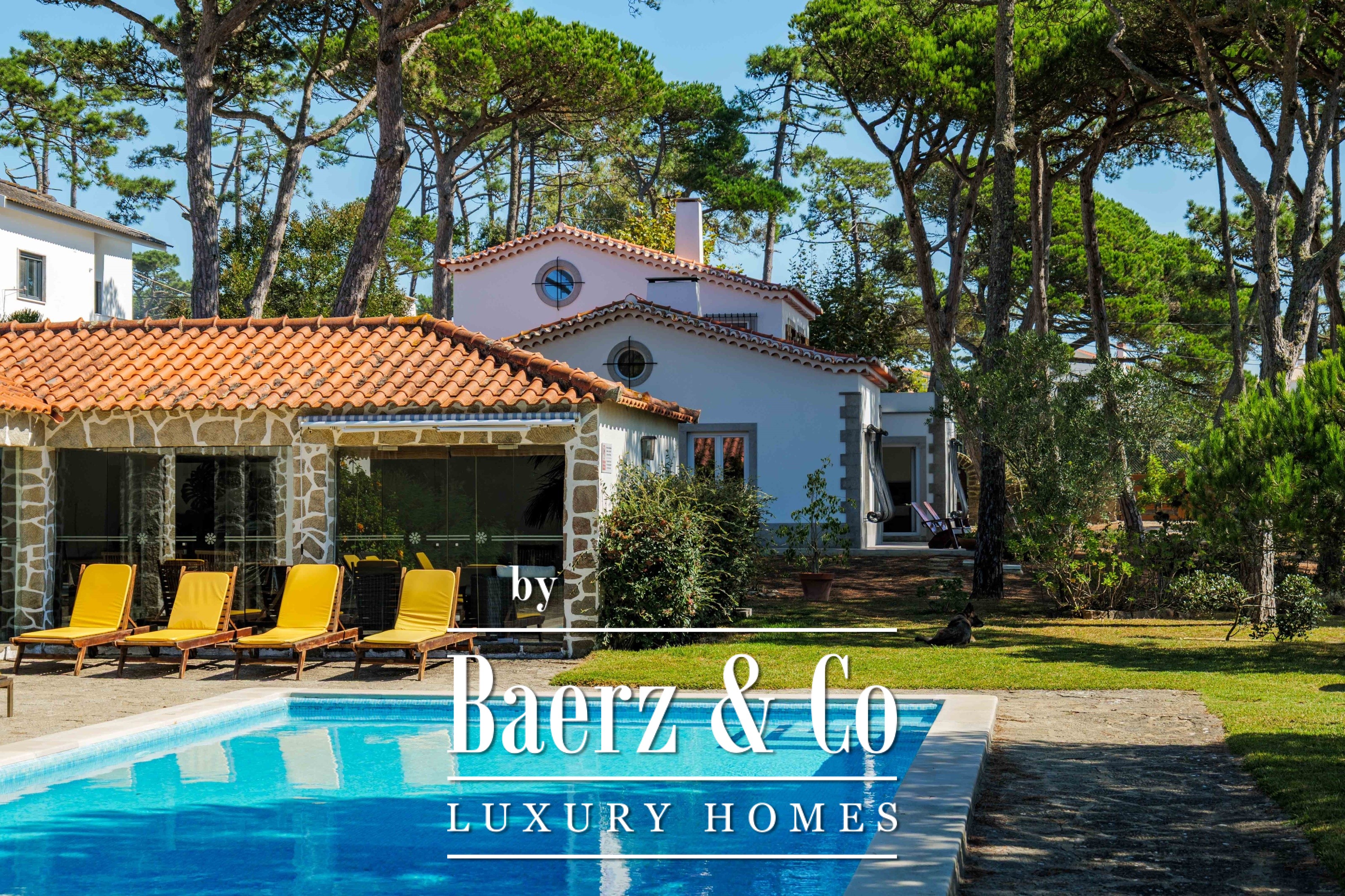 Villa Sintra with garden and sea views blends twentieth-century Portuguese architecture with contemporary sophistication. Set on 2,341 m² of landscaped gardens just five minutes from Praia do Magoito, the main house and guest accommodation are surrounded by mature pine trees under spacious skies.