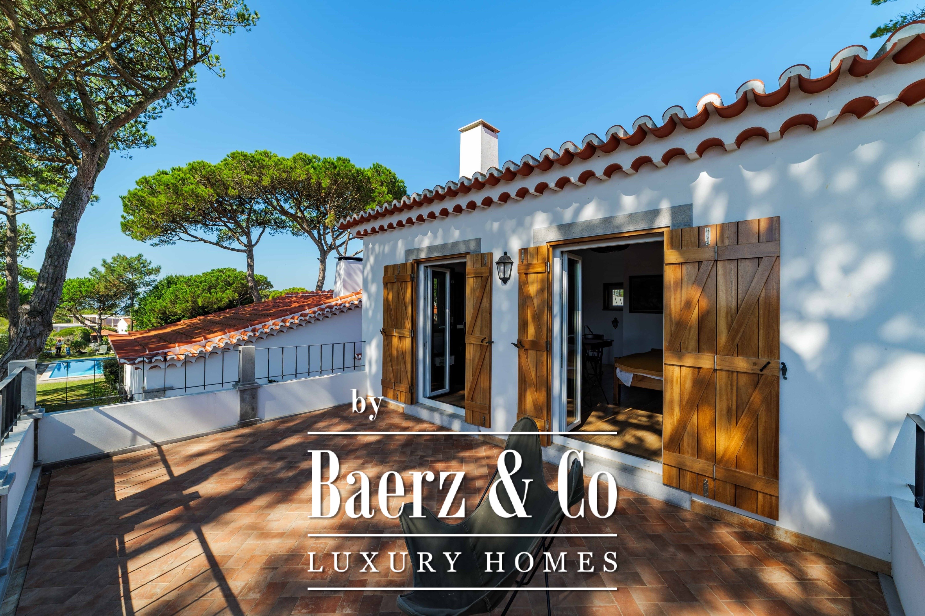 The main residence spans two stories and 302 m², completed in 2023 with a focus on authentic materials: exotic woods, fine stone, traditional clay tile roofing, and handmade wrought iron details. Sunlight from east to west fills harmoniously proportioned rooms—spacious living areas with a fireplace, a fully equipped kitchen opening onto the gardens, private suites, and terraces oriented toward serene views of the Sintra hills and the Atlantic.