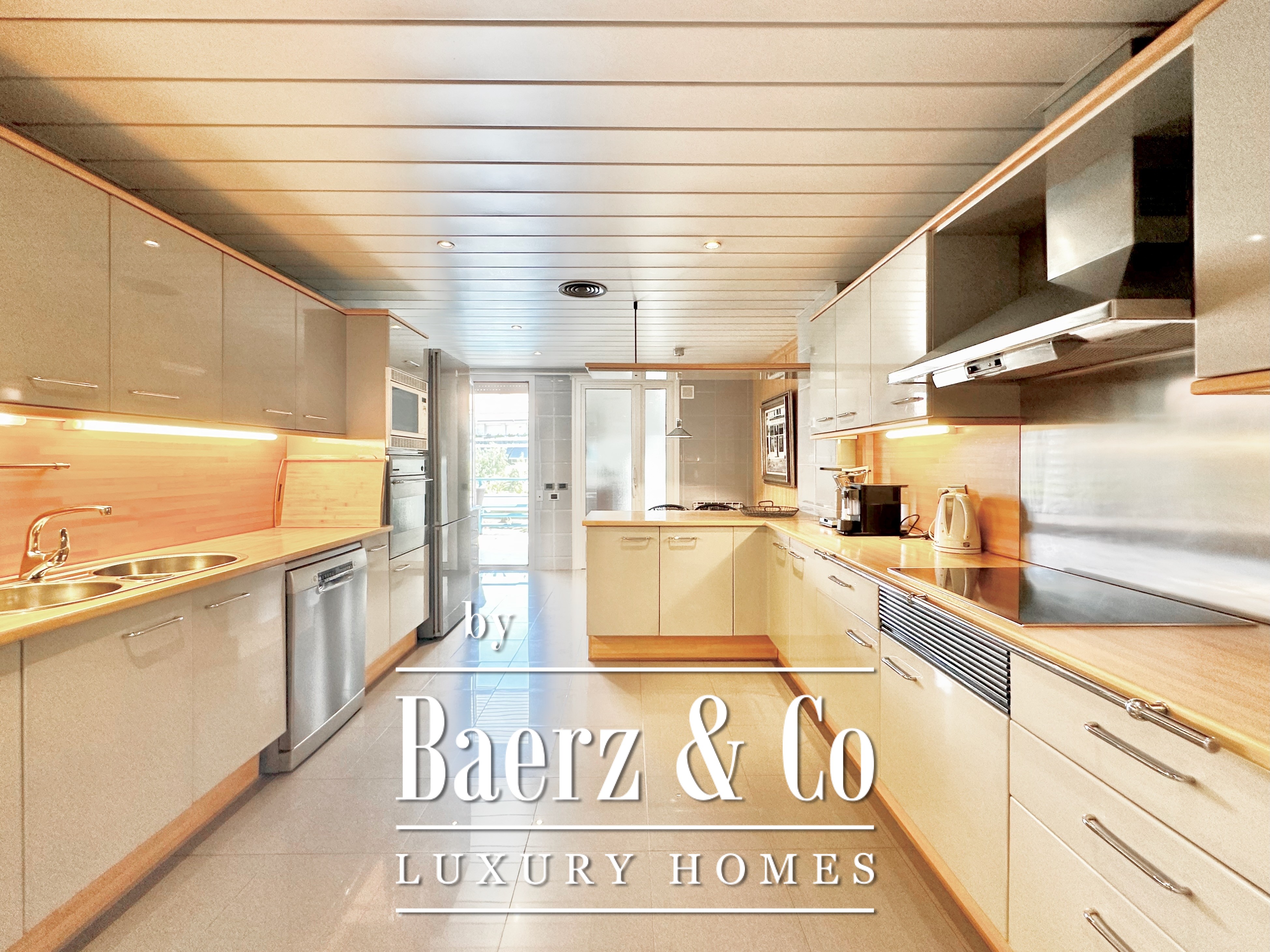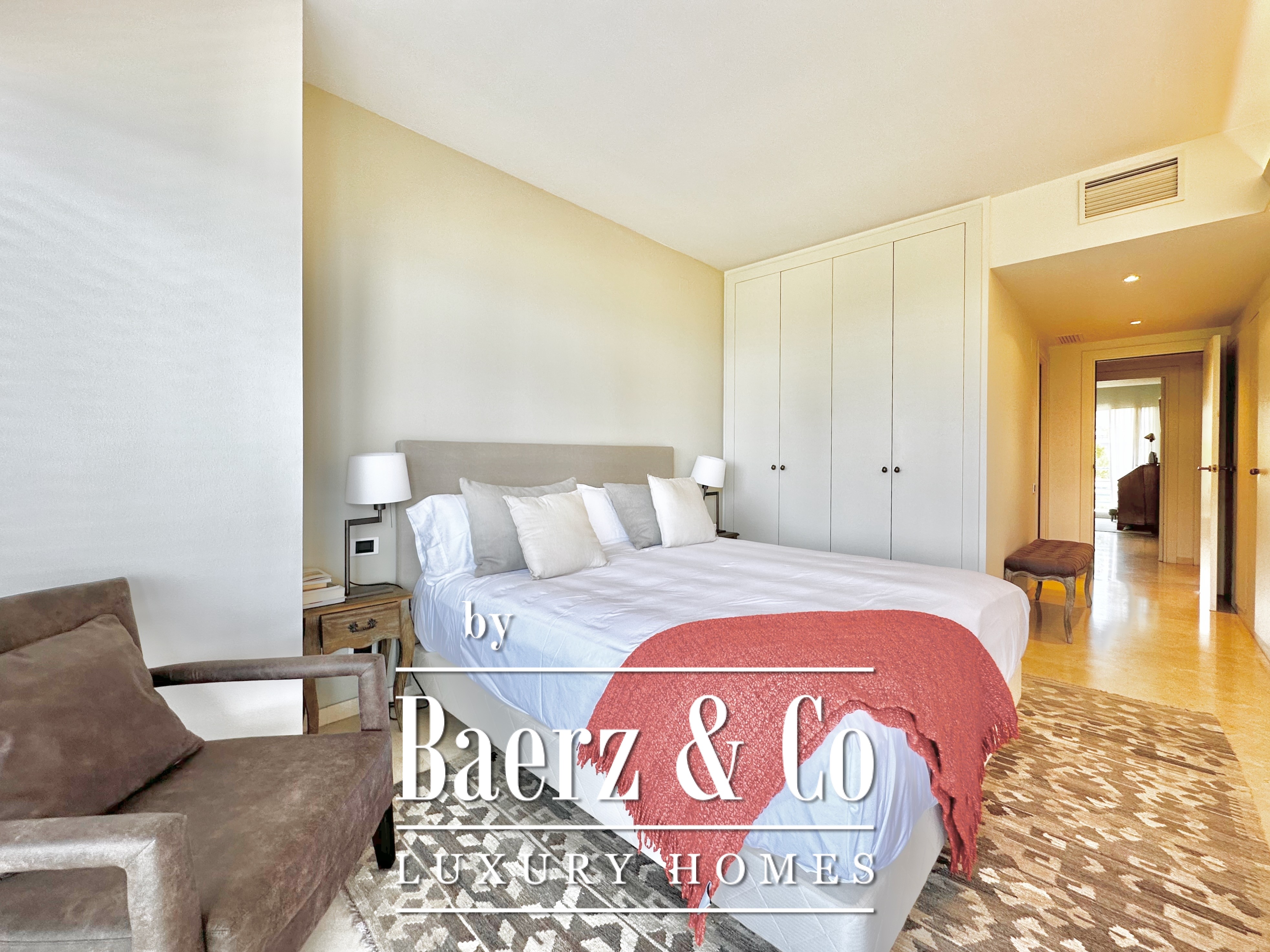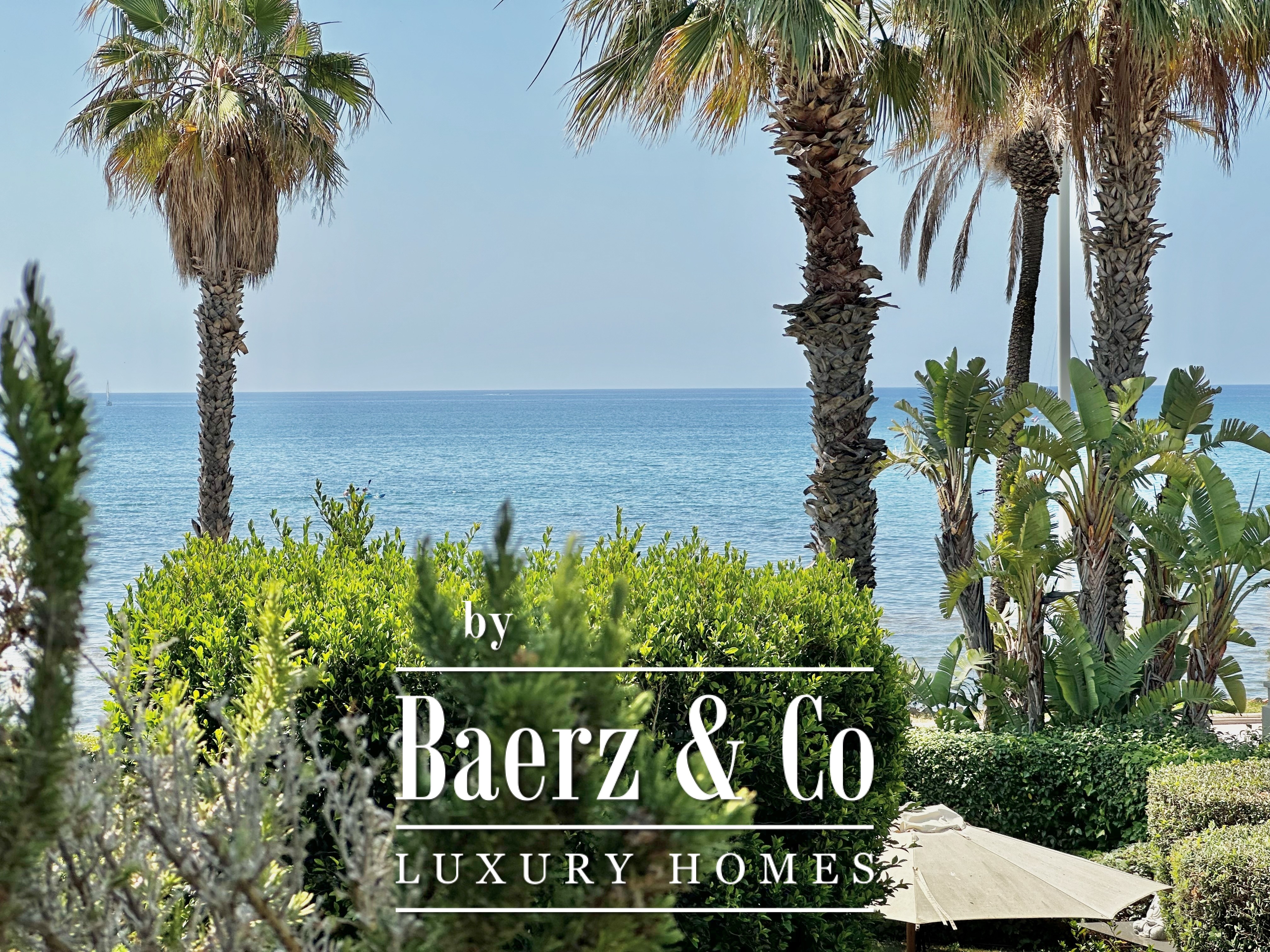 Two expansive terraces, totalling 71 m², trace the apartment’s perimeter, one overlooking the serene communal gardens and the other set directly above the shoreline for unobstructed views. The kitchen and dining space blend functionality and openness, extending onto a terrace framed by greenery. The property has been recently updated and includes two parking spaces and a 14 m² storage unit.