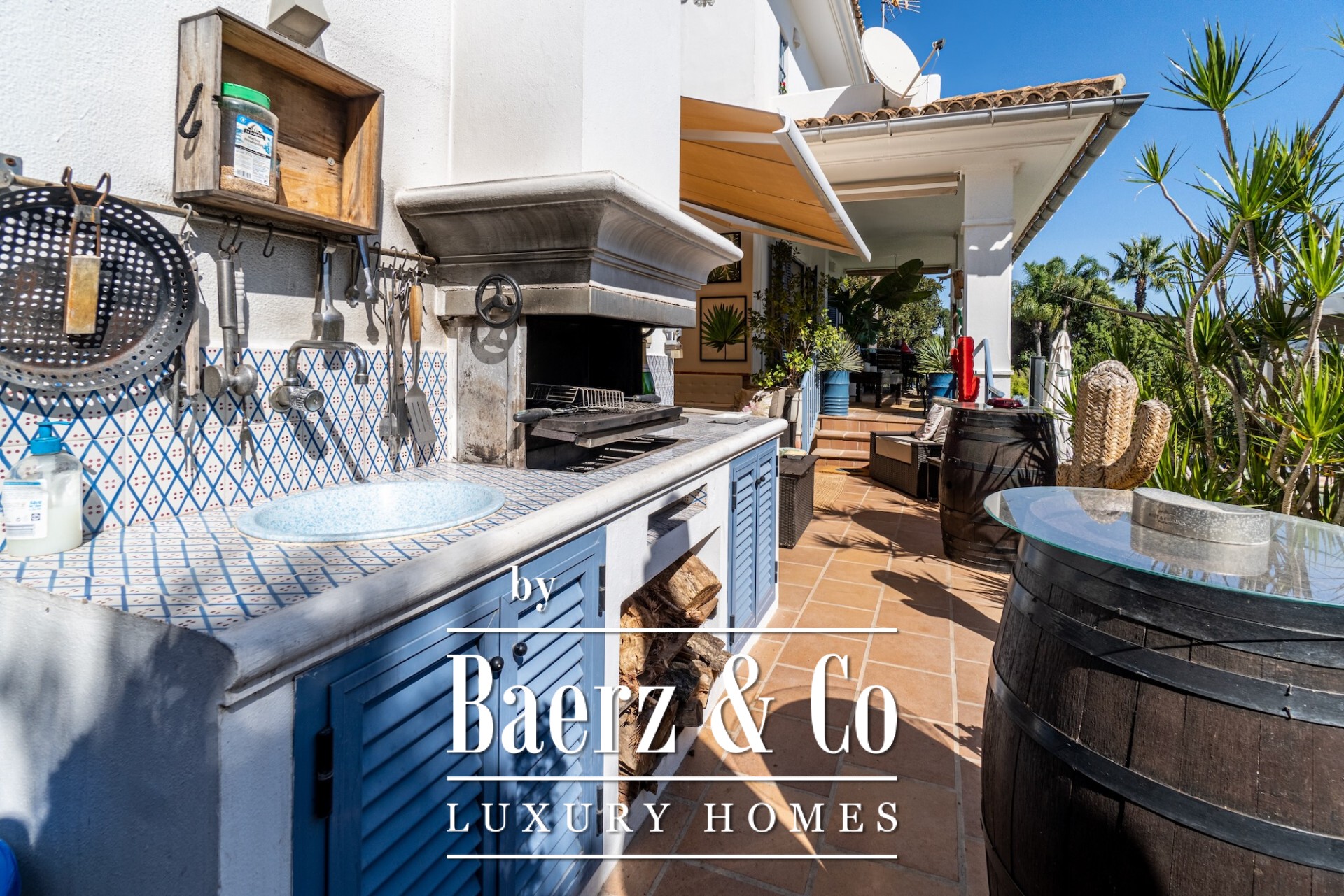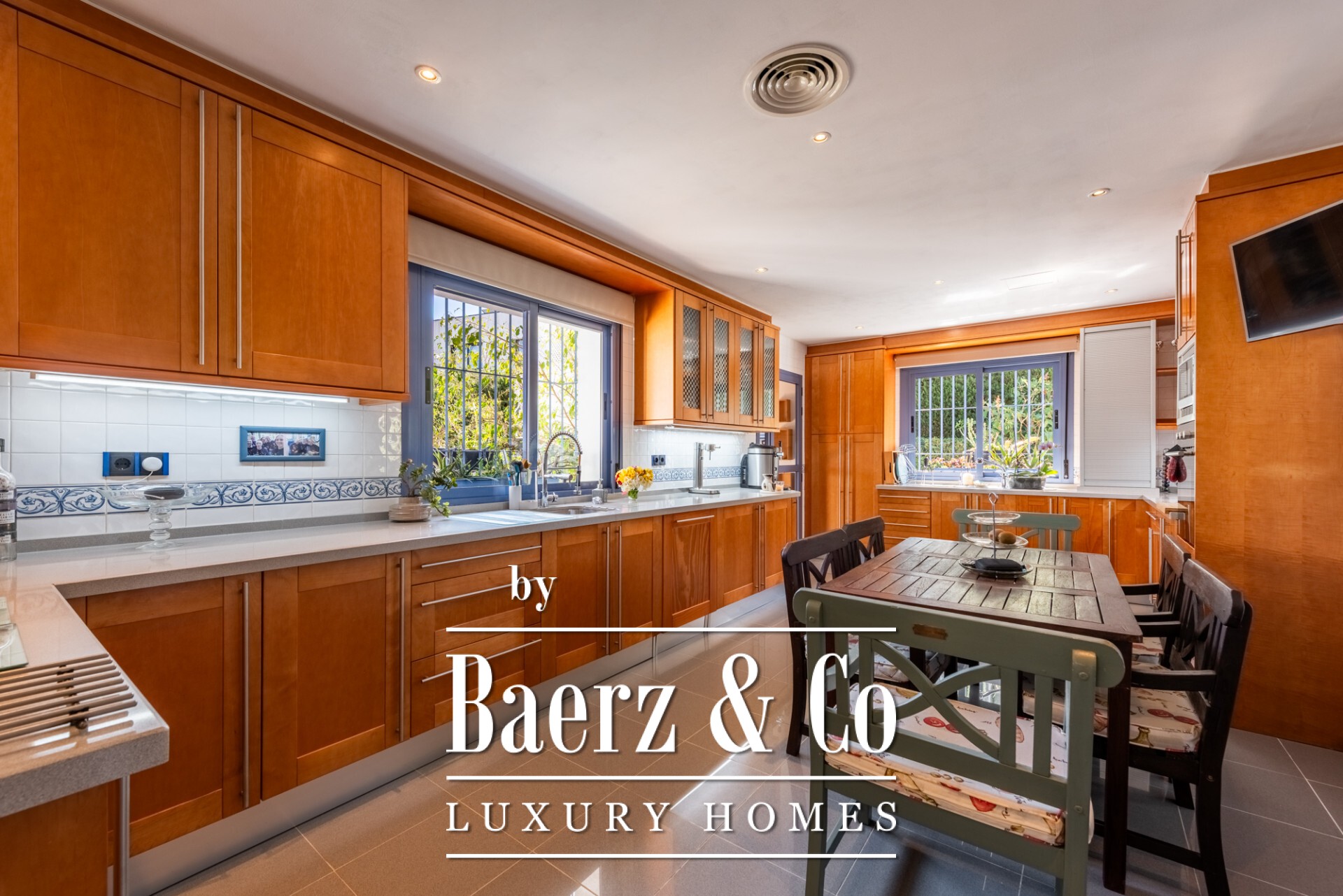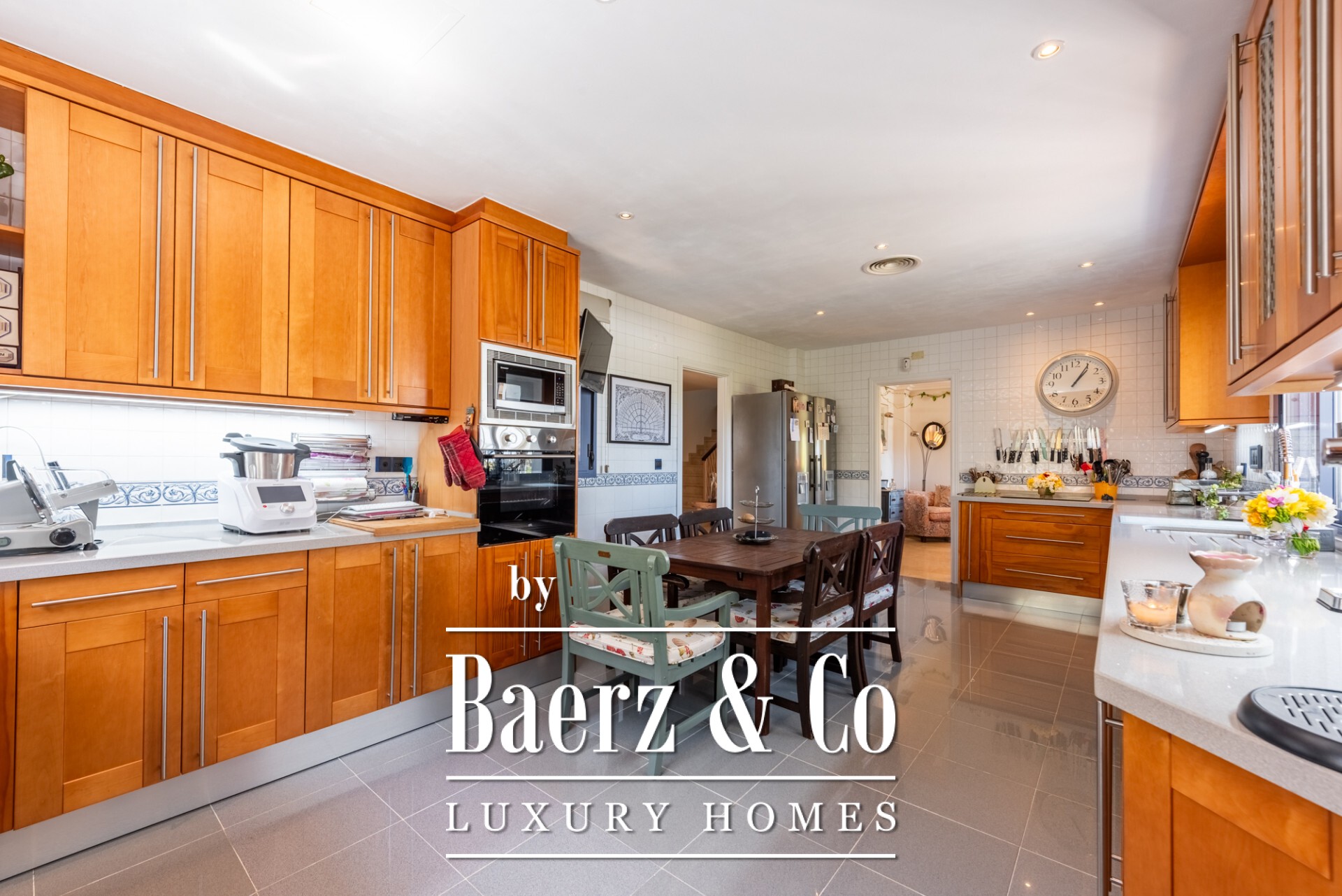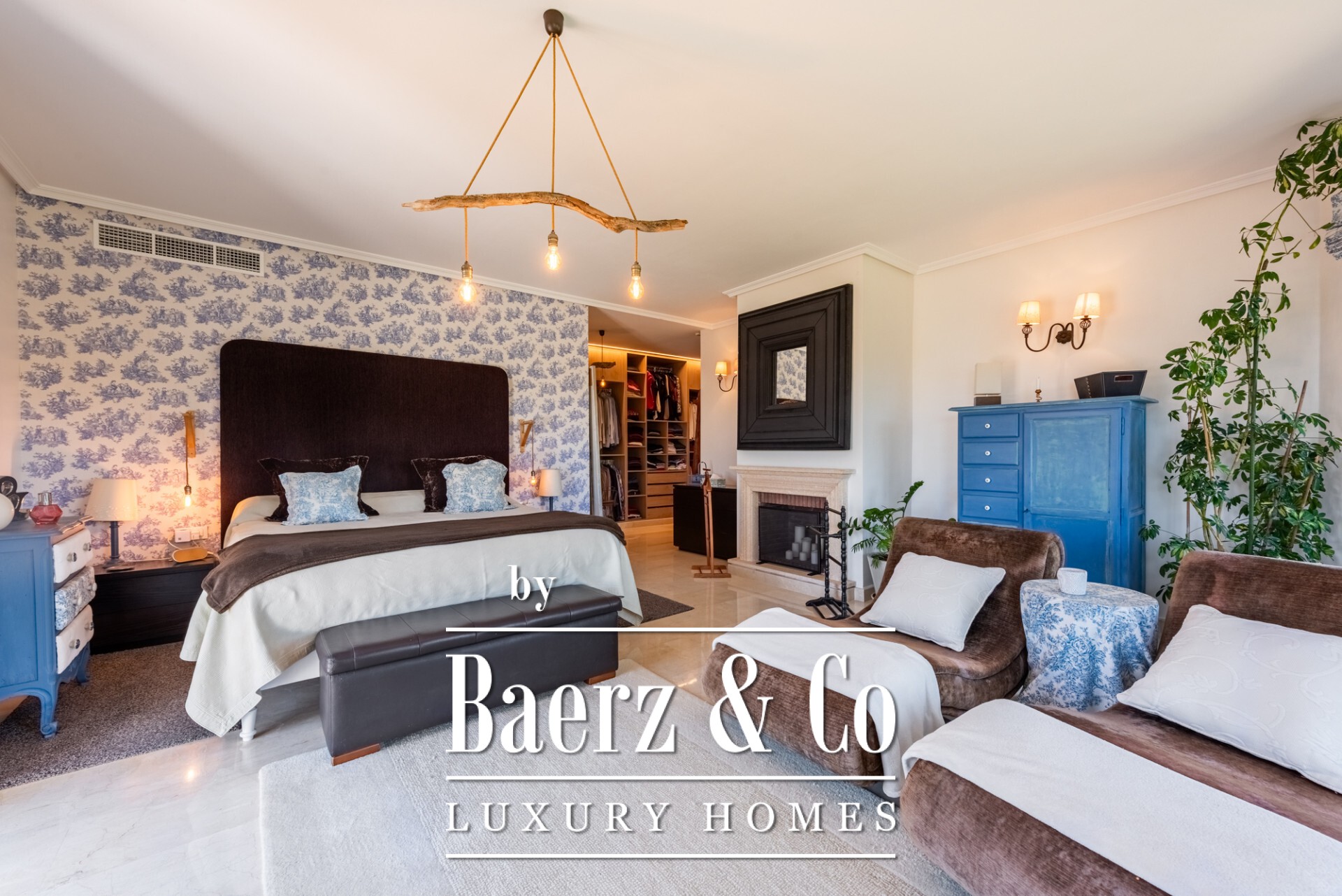 This villa features six bedrooms and five bathrooms across three floors, including a distinct master suite with a walk-in dressing room and en-suite bath, as well as a separate guest area. The ground floor connects a fully fitted kitchen, a dining room designed for gathering, and a living room with fireplace, each opening to covered and sun-drenched terraces for seamless indoor-outdoor living. Central heating by radiators and air conditioning ensure year-round comfort.