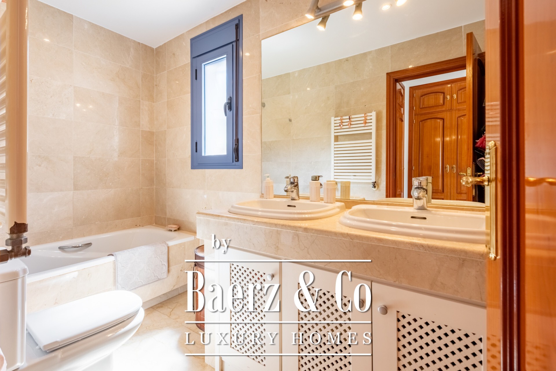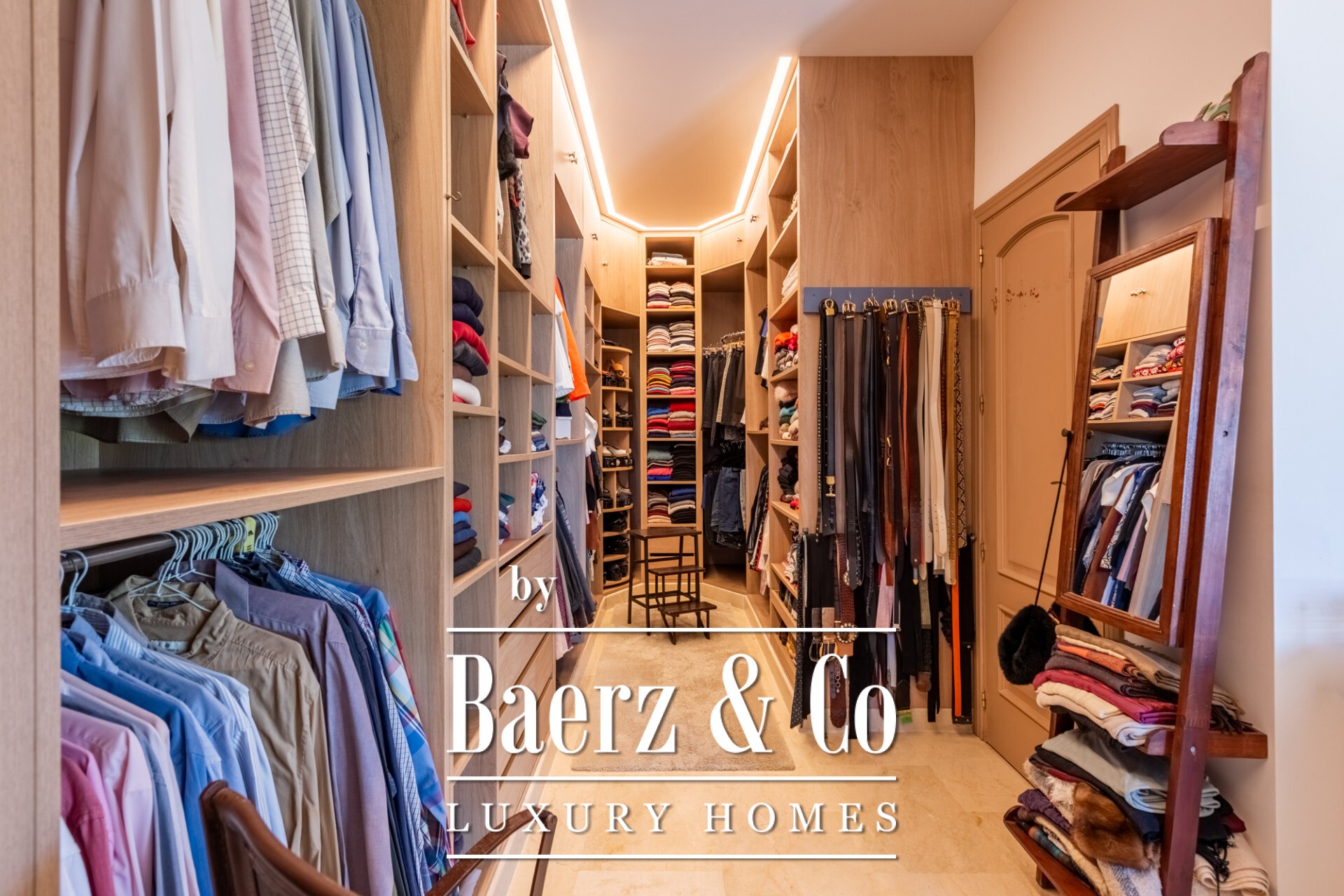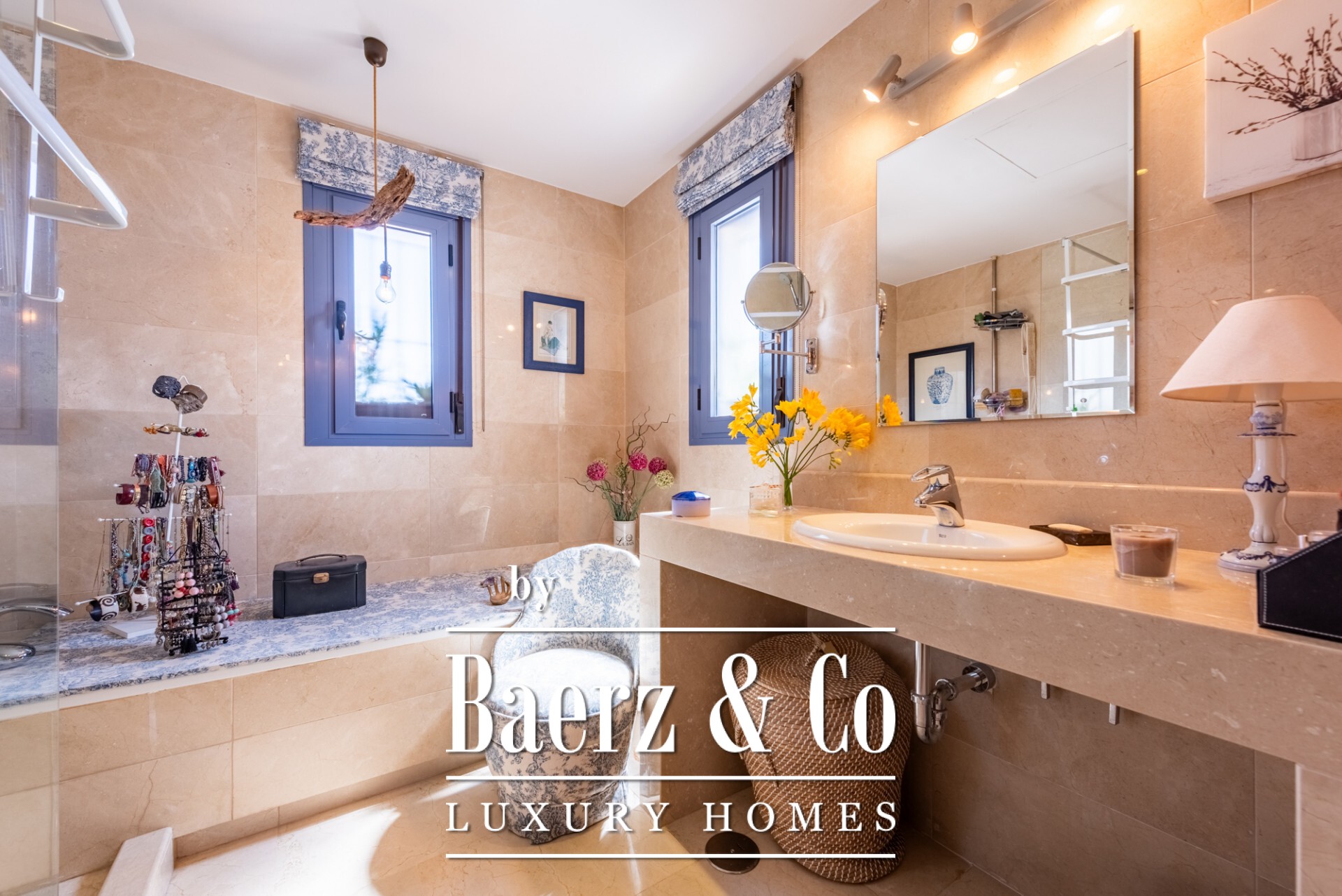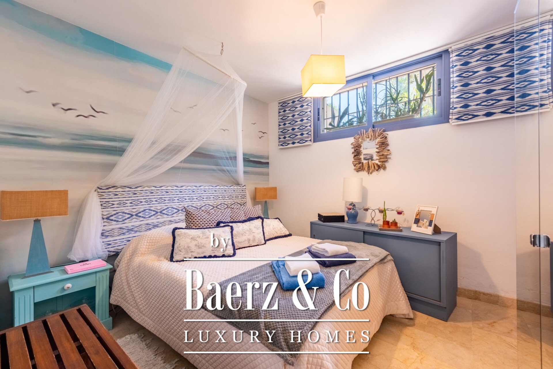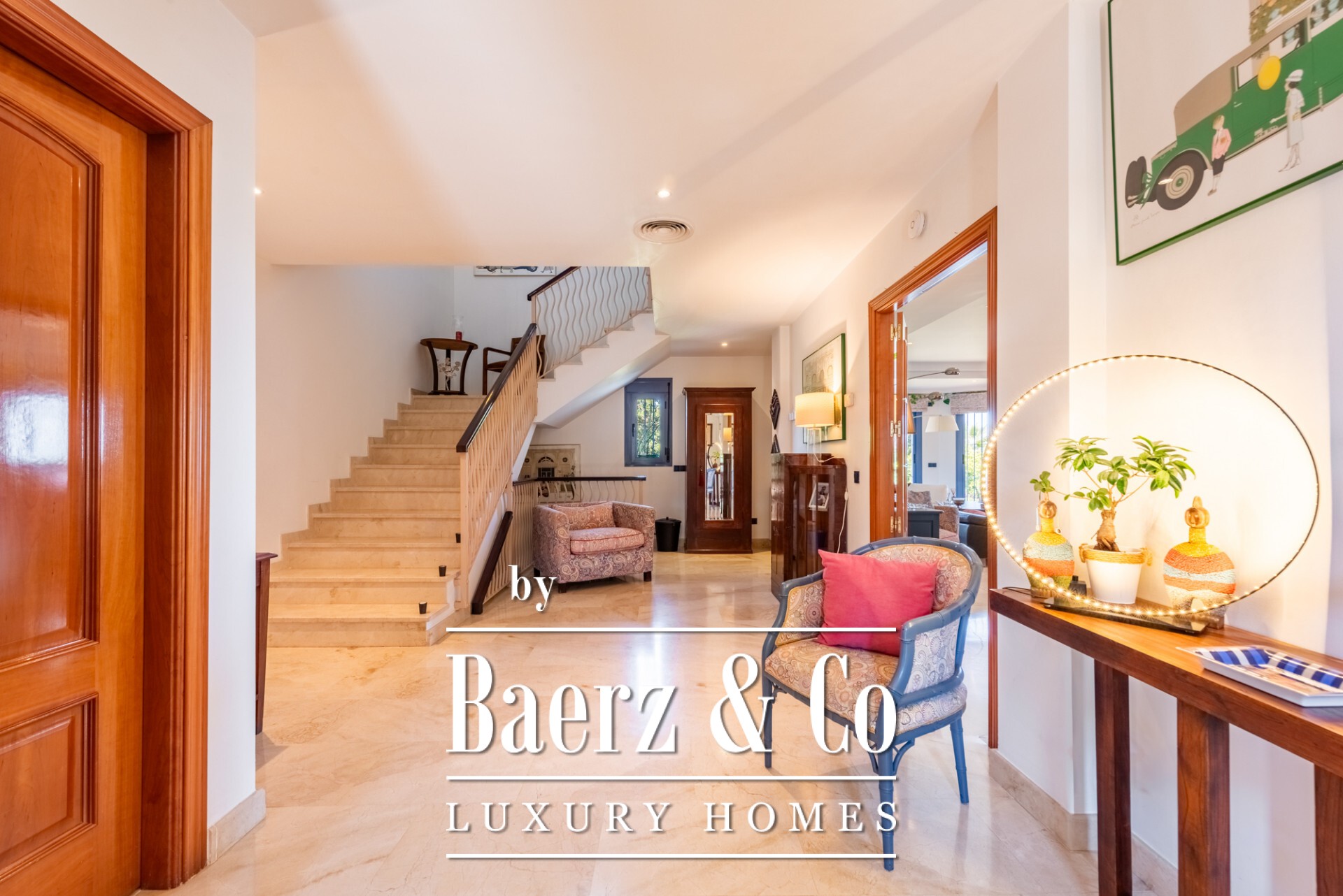 The lower level offers an independent apartment with its own living space, ideal for guests or staff. Multiple terraces, a 61 m² private terrace, and a saltwater swimming pool extend the living experience outdoors, complemented by panoramic garden and pool views. Security is prioritized with 24-hour surveillance and a gated entrance. Immediate proximity to beach clubs, golf courses, schools, and the marina further elevates the villa’s lifestyle appeal.