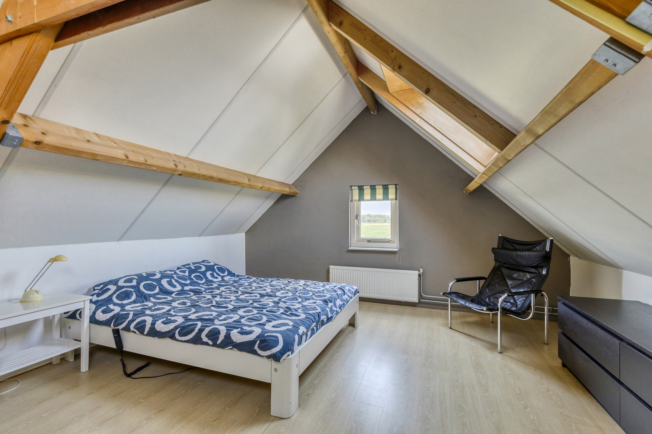 slaapkamer (boven werkkamer), met 2-tal dakramen, wandafwerking stucwerk, laminaatvloer, dakbeschot (geïsoleerde dakplaten) in zicht;