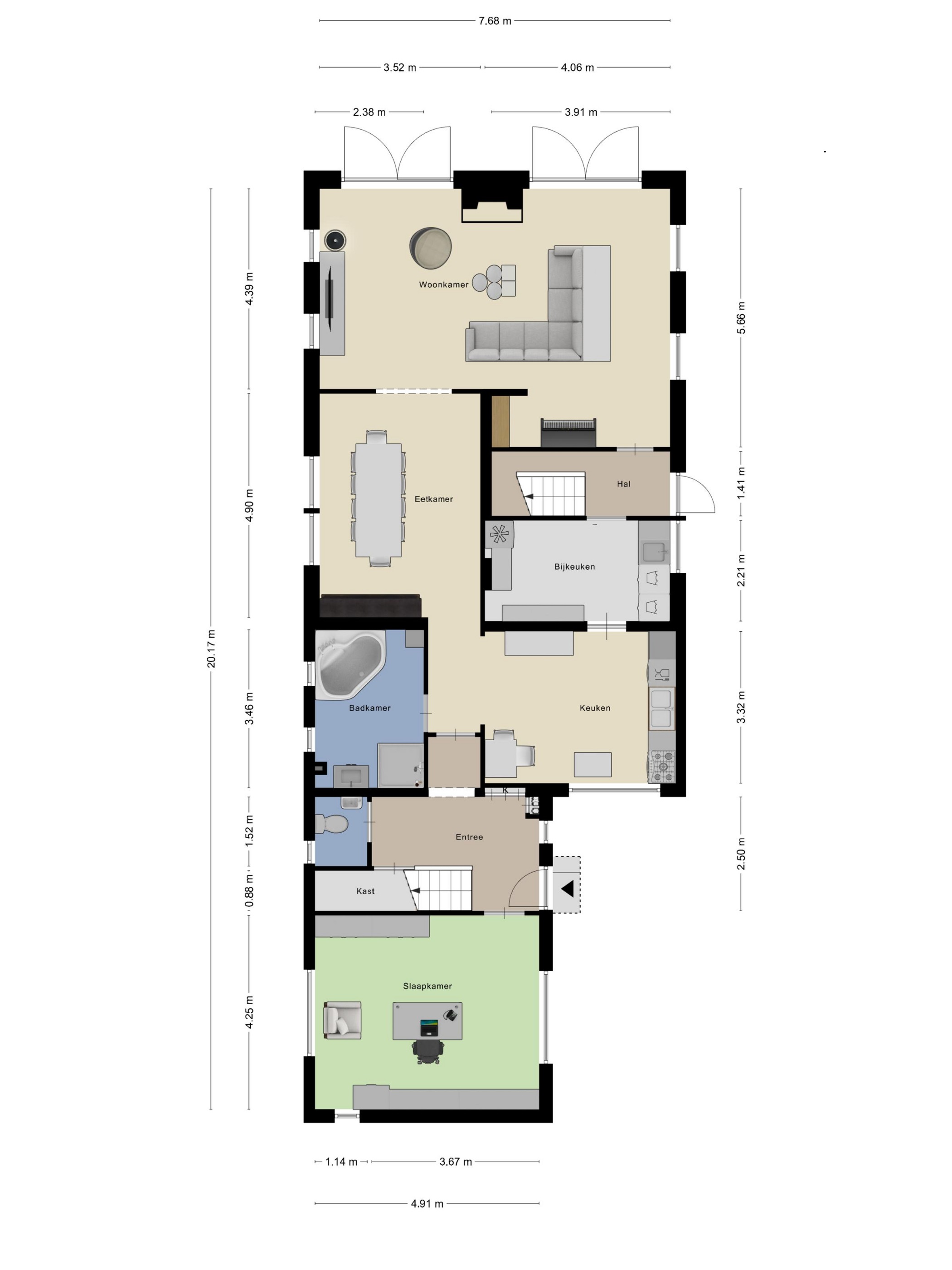 vanuit de tussenhal een trap naar de 1e verdieping, deur naar tuin/terras en schuifdeur naar bijkeuken en vanuit de hal/entree een trap naar de verdieping boven de slaap-/werk-/hobbykamer.