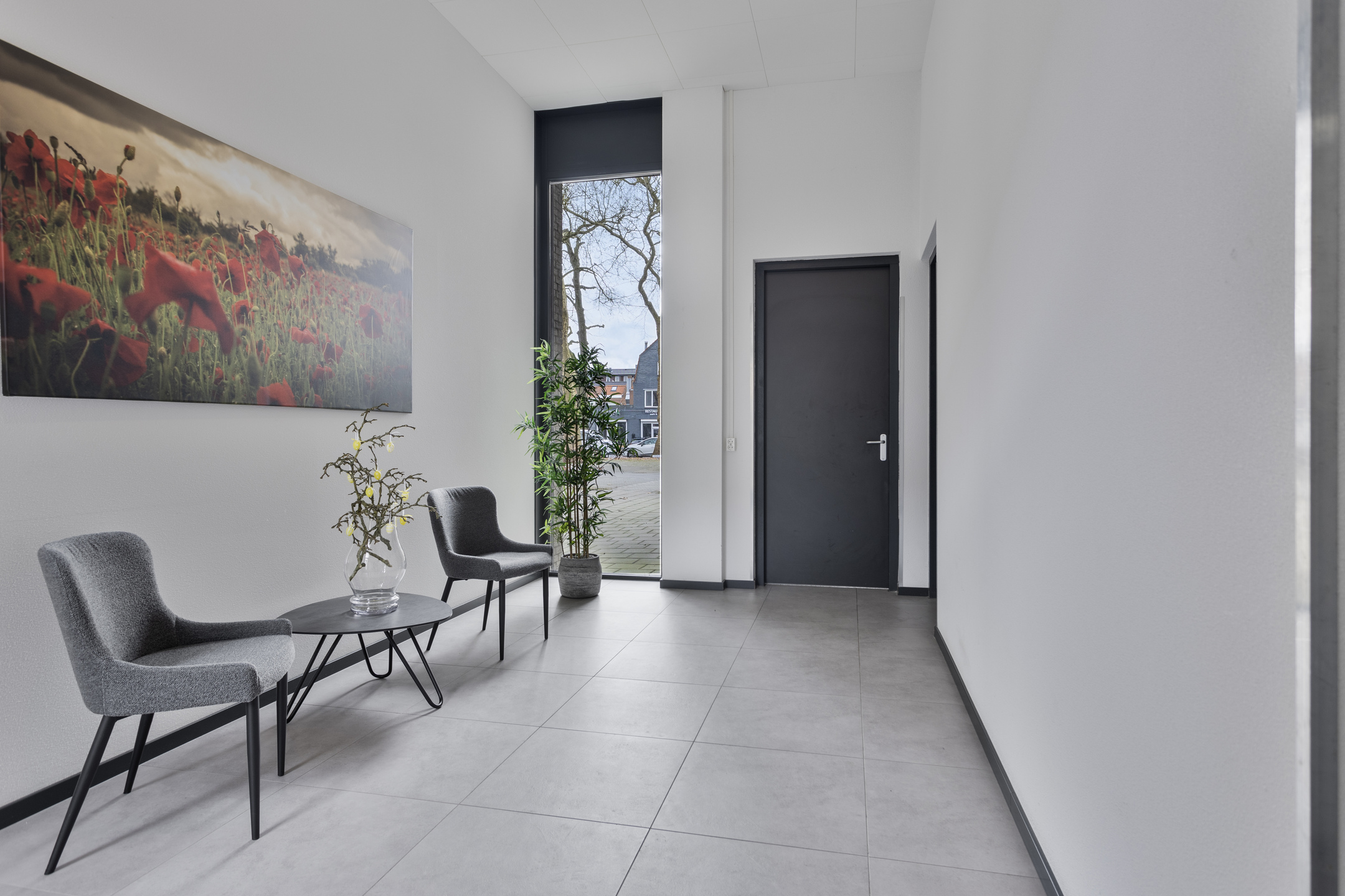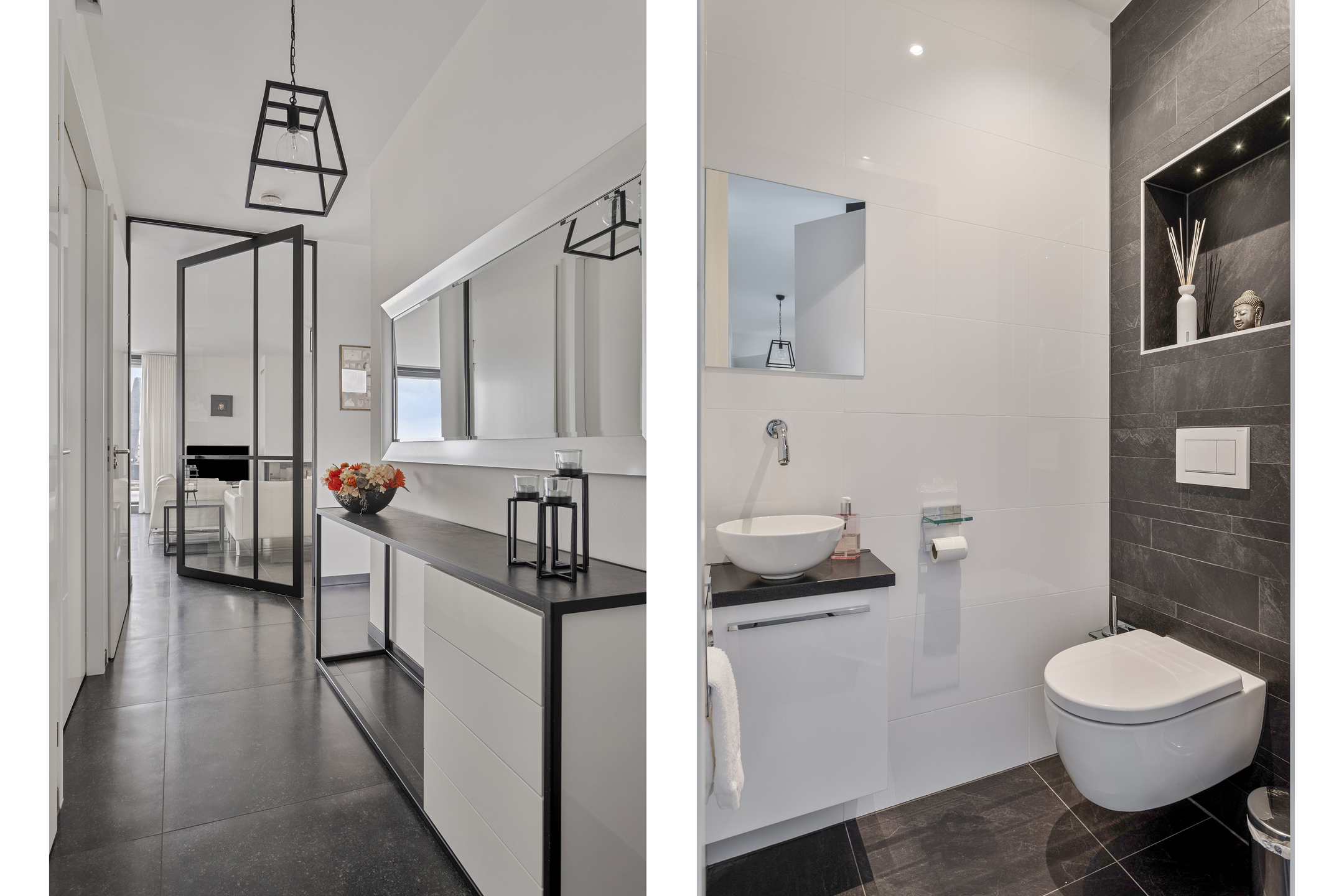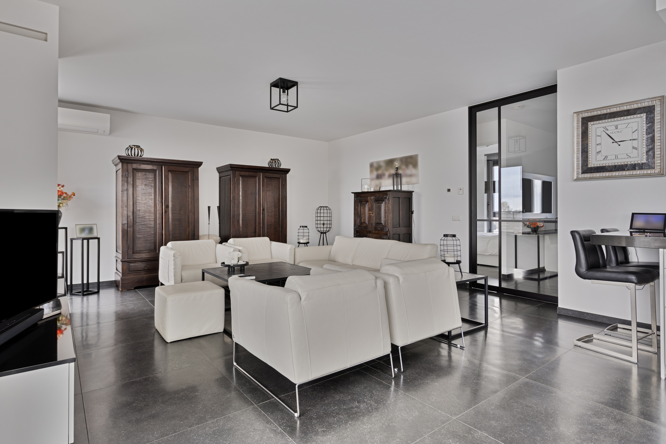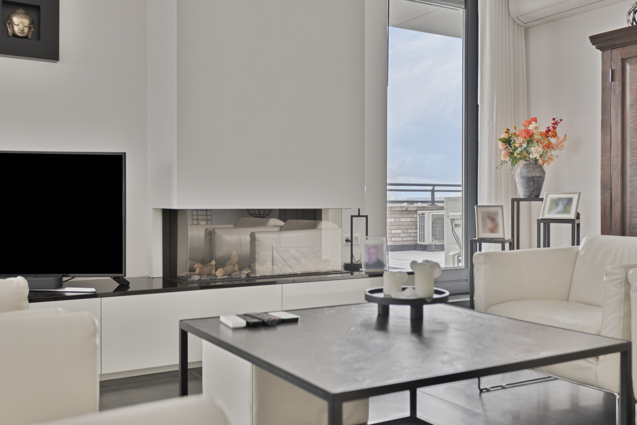 Really every detail has been thought of in the styling and design of the whole. Think of sleek floor, wall and ceiling finishes, solid pivot door from the hallway / entrance to the living room, electric screens, electric pleated curtains, power point in the floor of the living room, room by room controllable underfloor heating, UTP wiring in almost all rooms, tilt / turn windows, a beautiful gas fireplace in the living room, fitted wardrobes in the guest bedrooms, 2 air conditioning units and above all, 10 private solar panels for low energy consumption.