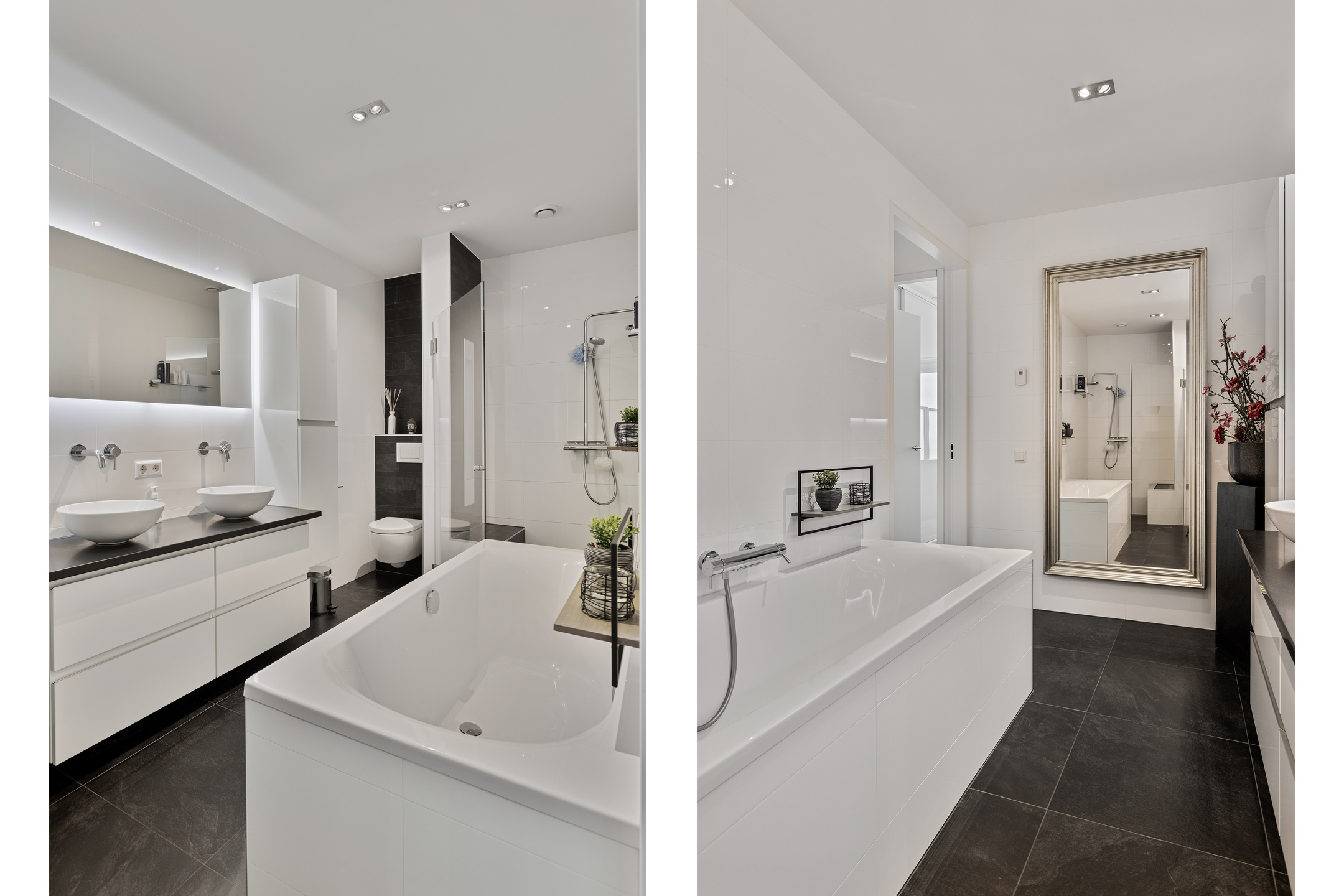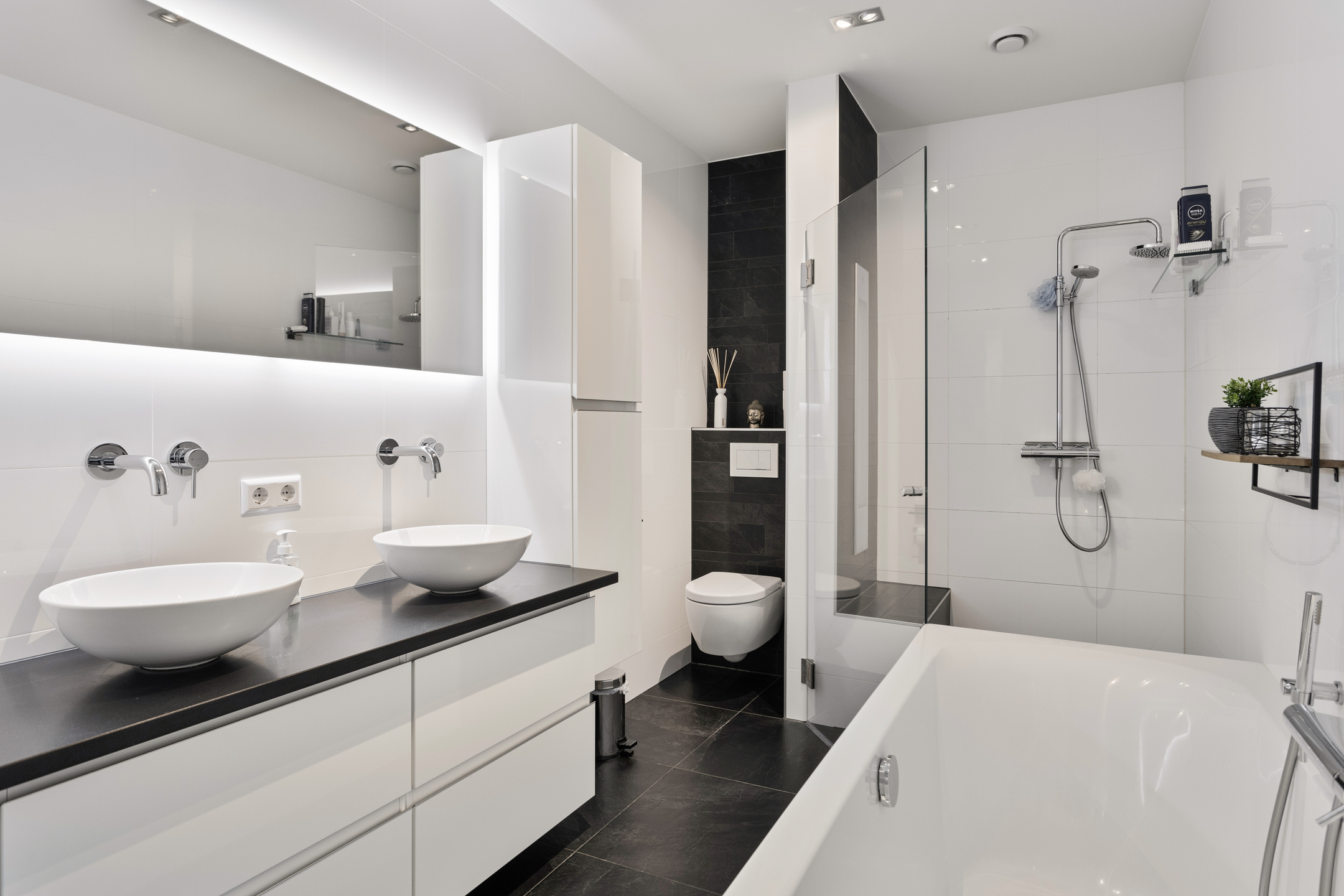 luxury tiled bathroom with a bath, walk-in shower with Sunshower and bench with underfloor heating for extra comfort, 2nd wall closet and bathroom cabinet with double sink.