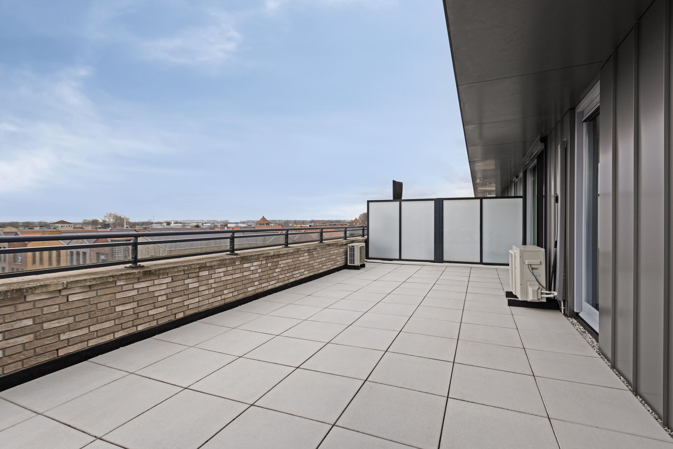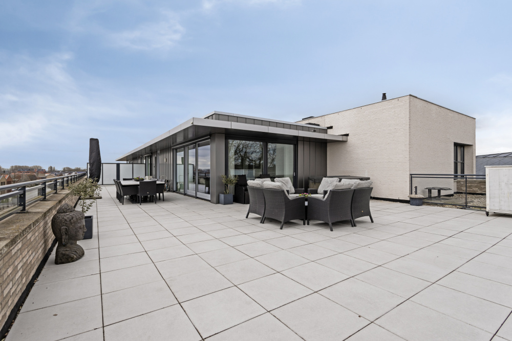 spacious roof terrace of approx 165 m², situated on the sunny west and equipped with various sun and shade angles, ceramic 60x60 tiles, a multi-person Jacuzzi with upper deck (for acquisition), electrical points and an outdoor tap.