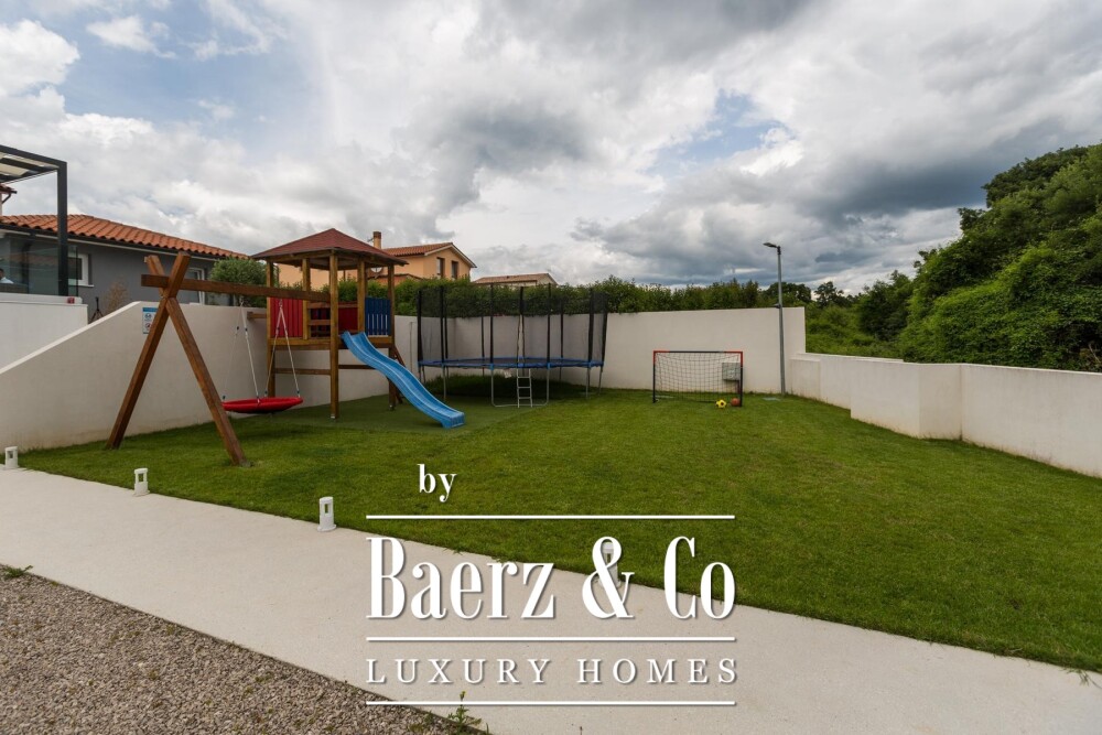 Townhouse Svetvinčenat offers the elegance of contemporary architecture in a peaceful enclave near Štokovci, surrounded by mature greenery. This property encompasses 180 m² of refined living space across a substantial 919 m² plot, presenting a seamless flow between indoors and out. The focus keyword, townhouse Svetvinčenat, is demonstrated in the property's attention to detail and tranquil positioning.