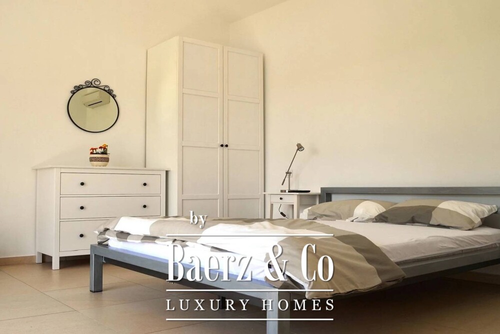 Upstairs, two further bedrooms each feature en suite bathrooms and private access onto a covered terrace linked to the pool by an outdoor stairway. The atmosphere is shaped by Italian ceramics, oak floors, larch woodwork, and hand-made furnishings. Five air conditioning units, a fireplace, underfloor heating outside bedrooms, and a top-tier alarm system ensure comfort and security year-round.