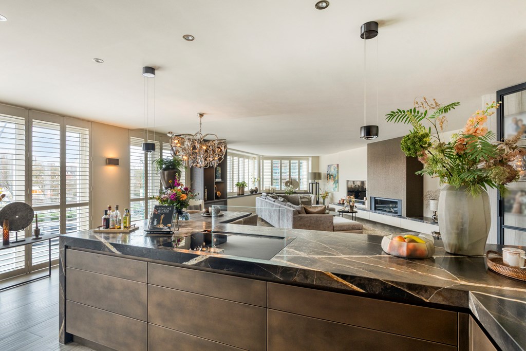 The luxury kitchen is truly a showpiece. The generous cooking island invites long dinners and convivial gatherings, while high-end built-in appliances by Gaggenau, including a combi-oven, steam oven, coffee machine, induction hob with downdraft extractor, Quooker, dishwasher, refrigerator, and freezer, ensure optimal cooking comfort. Adjacent is the luxurious dining area, perfectly positioned in natural daylight.