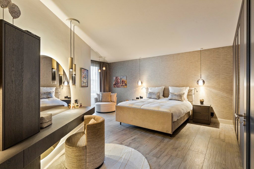 The apartment features several generously sized (bed)rooms. The master bedroom feels like a luxury hotel suite, complete with bespoke wardrobes, and both bedrooms offer direct access to a covered balcony where you can also enjoy the evening sun. The stylish bathroom is spacious and equipped with a rain shower with sunshower function, a vanity unit with double taps, illuminated mirror, wall-mounted toilet, and high-quality finishes down to the finest detail.