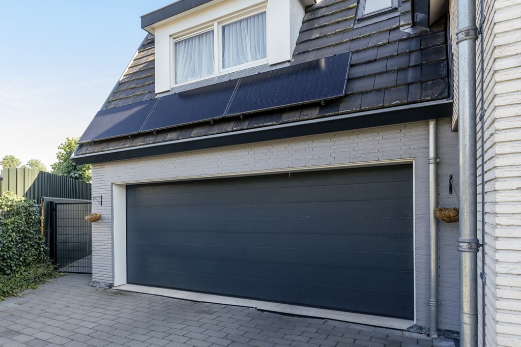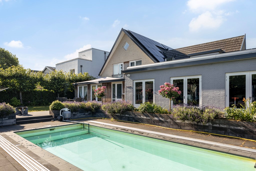 A second, covered terrace has also been created so you can enjoy the garden in all weather; this canopy forms part of a large storage structure. On this generous plot of approx. 1,180 m², the garden offers lounge areas by the pool, children’s play spaces, and your own kitchen garden—something for everyone.