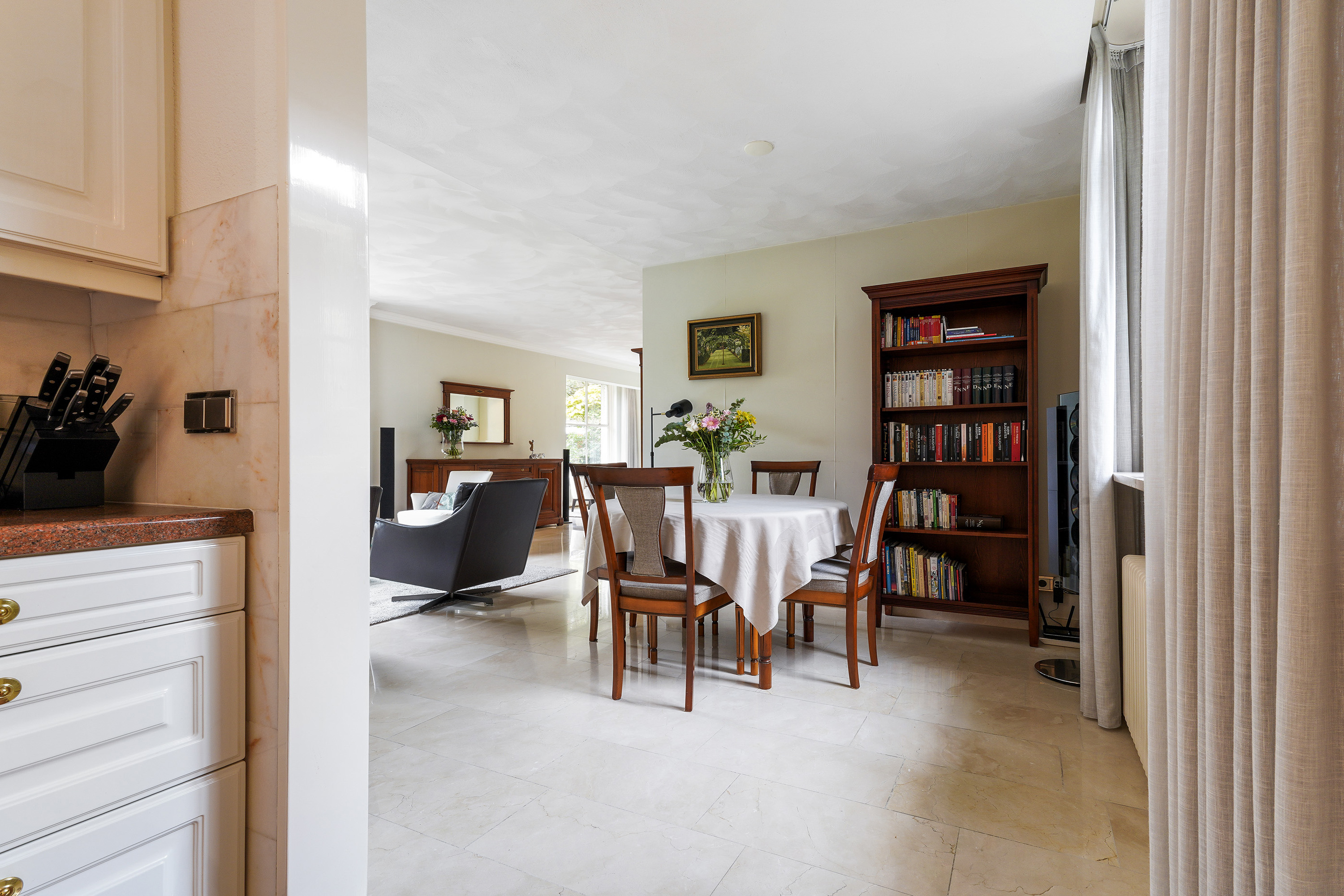The ground floor exudes a sense of space and elegance. The expansive living area of around 70 m² is divided into a sitting room, dining area and open-plan kitchen — all seamlessly connected yet each with its own atmosphere. Large windows allow for an abundance of natural light and offer stunning views of the green surroundings. The travertine floor, light walls and ceilings create a serene and stylish foundation.