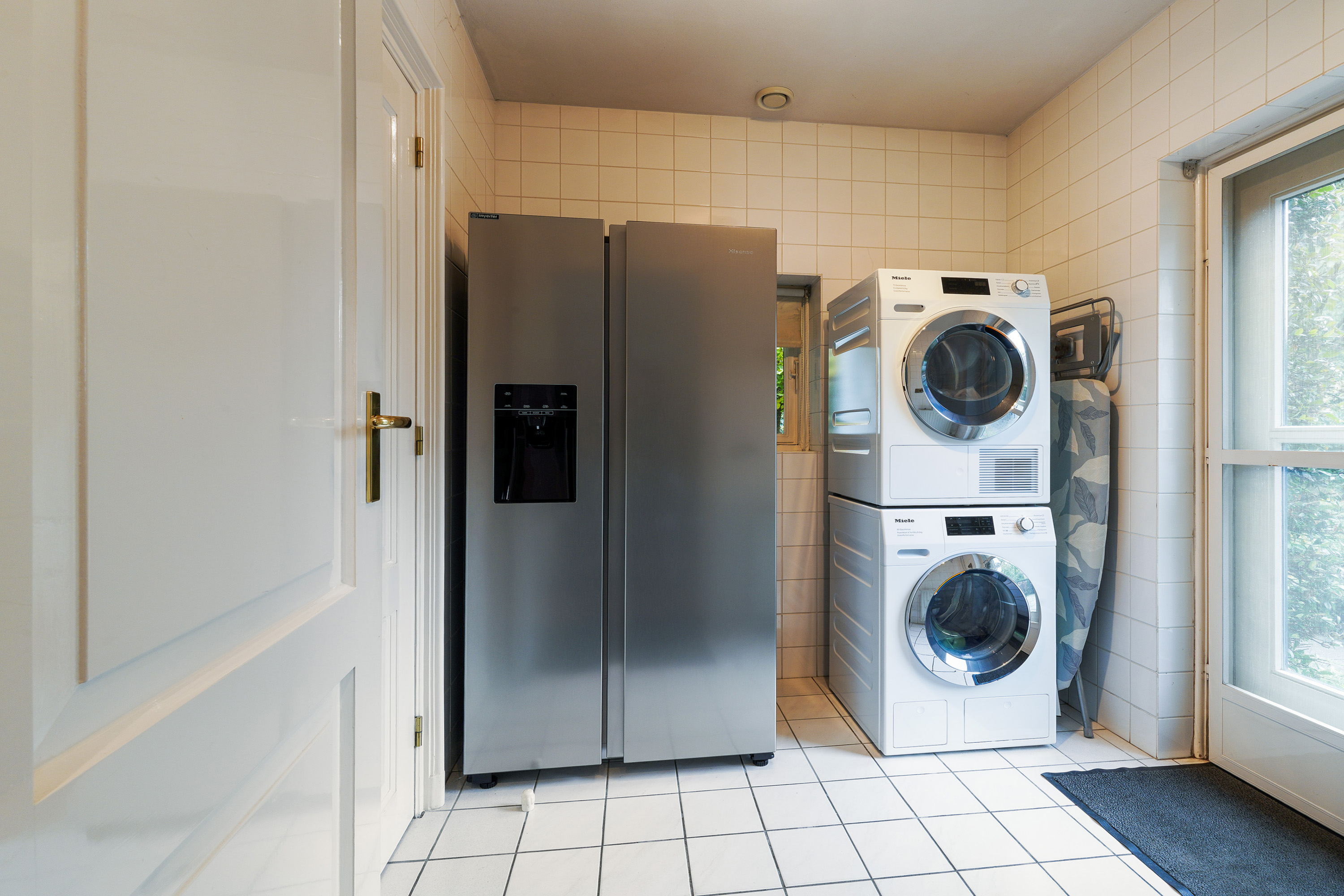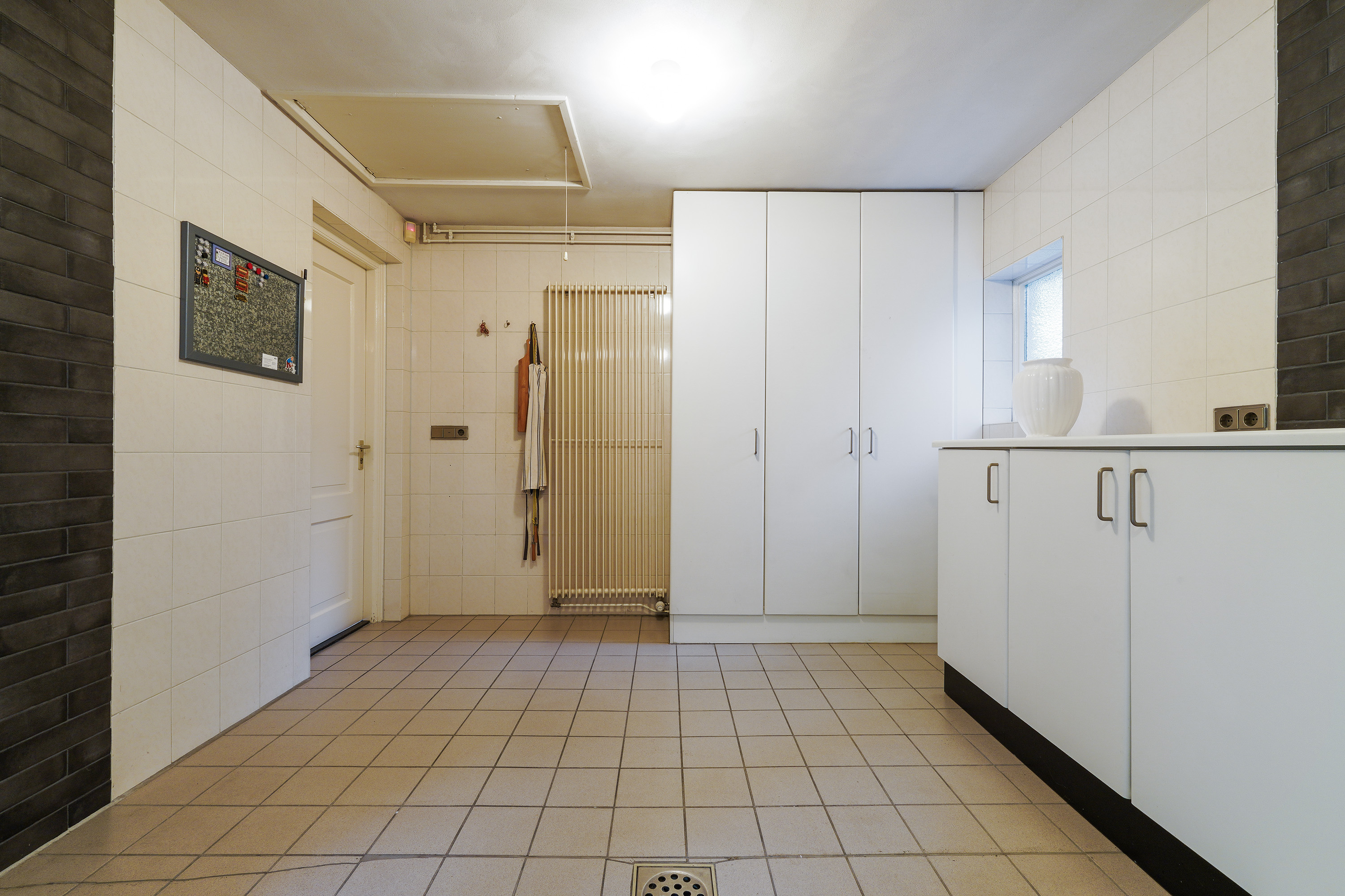 The kitchen is a wonderful place for those who love to cook and gather. The built-in cabinetry with various integrated appliances and the large natural stone worktop provide plenty of workspace and storage. Adjacent is the practical utility room with connections for a washing machine and dryer, and access to a spacious indoor storage area of no less than 17 m², fitted with built-in cupboards and a sink. This space also features a loft, ideal for additional storage. From the hallway on the ground floor, a cellar is accessible — a perfect extra space for provisions or a wine collection.