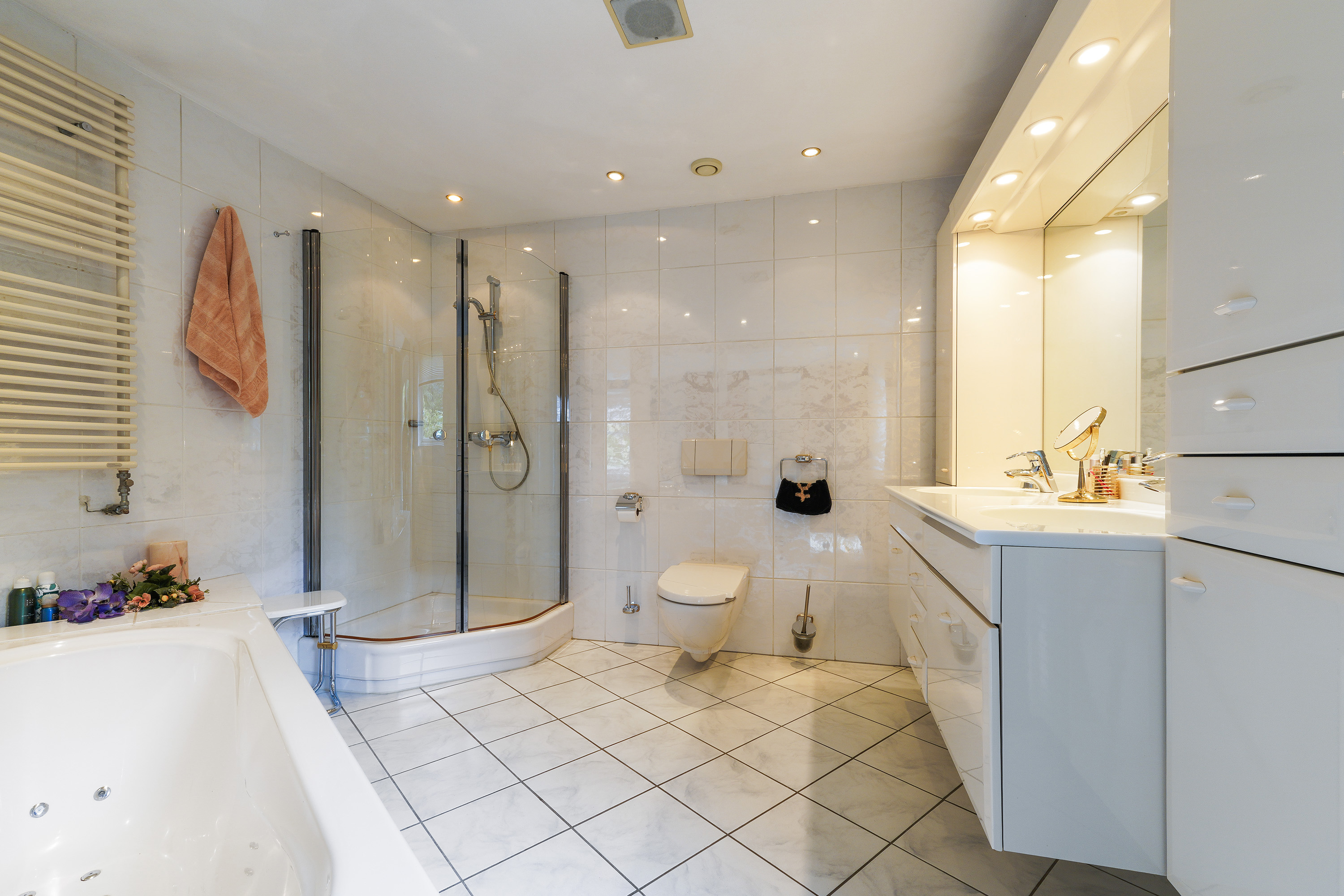 On the first floor, there are two very spacious bedrooms. The rear bedroom serves as a true master suite, complete with air conditioning, a built-in wardrobe, a balcony overlooking the back garden, and direct open access to the luxurious bathroom featuring a bathtub, shower, toilet and double washbasin with vanity unit. The second bedroom, located at the front, includes convenient built-in storage under the eaves. This floor also offers a second bathroom with a shower and washbasin, as well as a separate toilet on the landing.