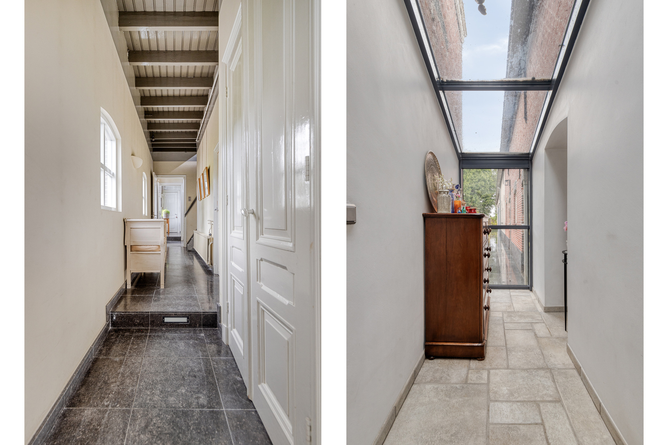 achter portaal, wandafwerking stucwerk, hardstenen vloer, balkenplafond;