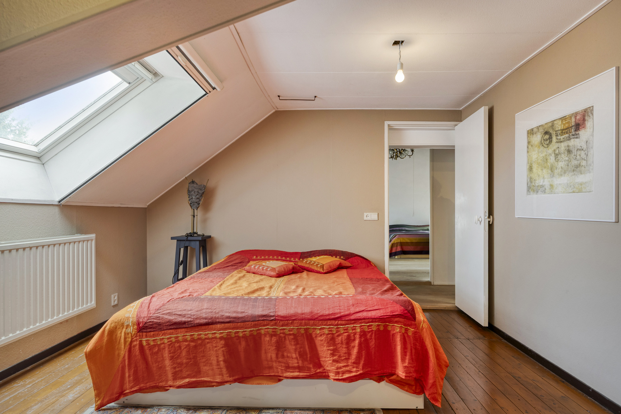 Master bedroom with three roof windows, plastered walls, laminate flooring with oak top layer, beautiful view of the wooden beam structure, walk-in closet with inverter and roof window;