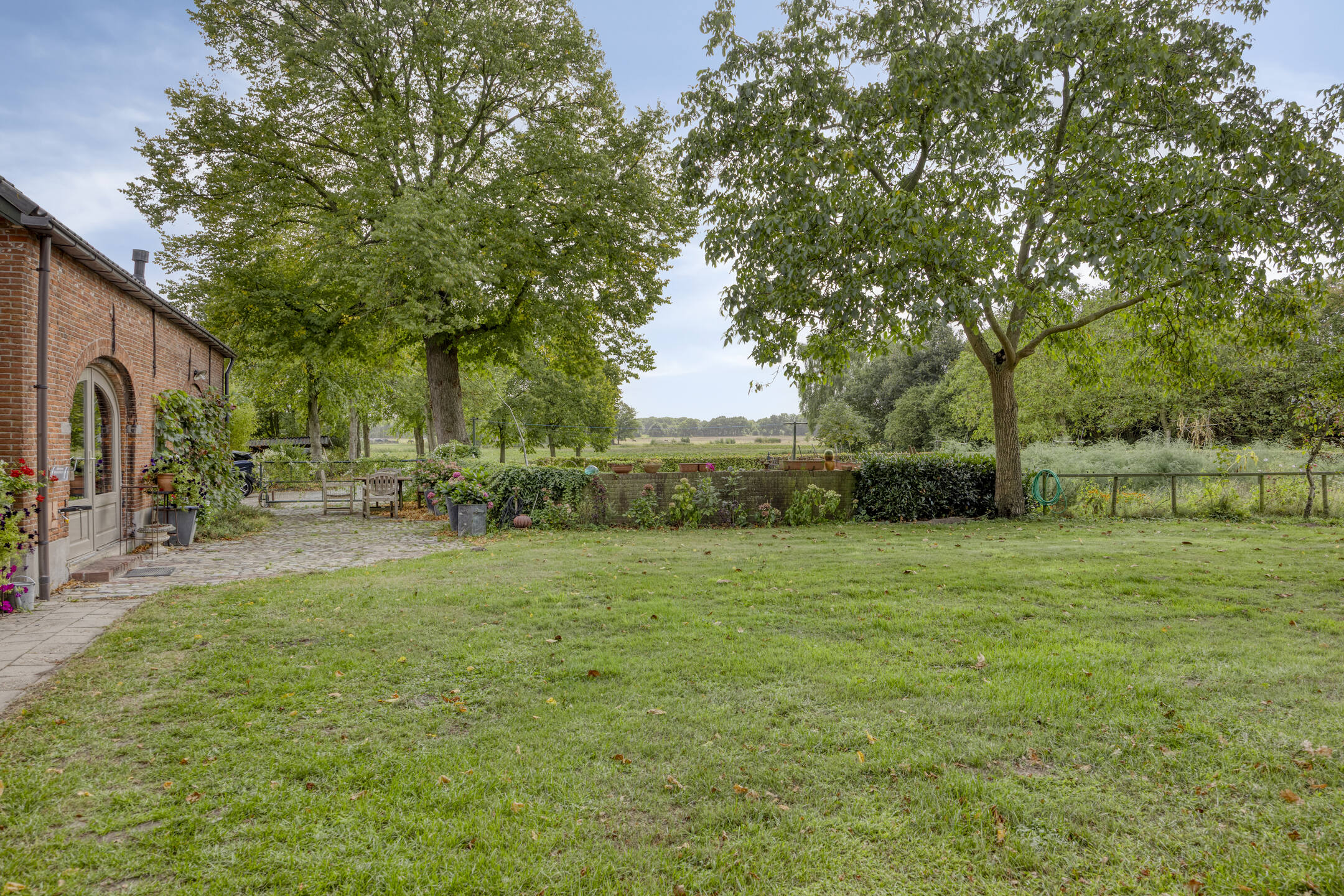 Landscaped grounds surrounding the property, including pasture, orchard, vegetable garden, wooden veranda, spacious driveway, terrace paved with traditional baked bricks, and a driveway laid with cobblestones.
