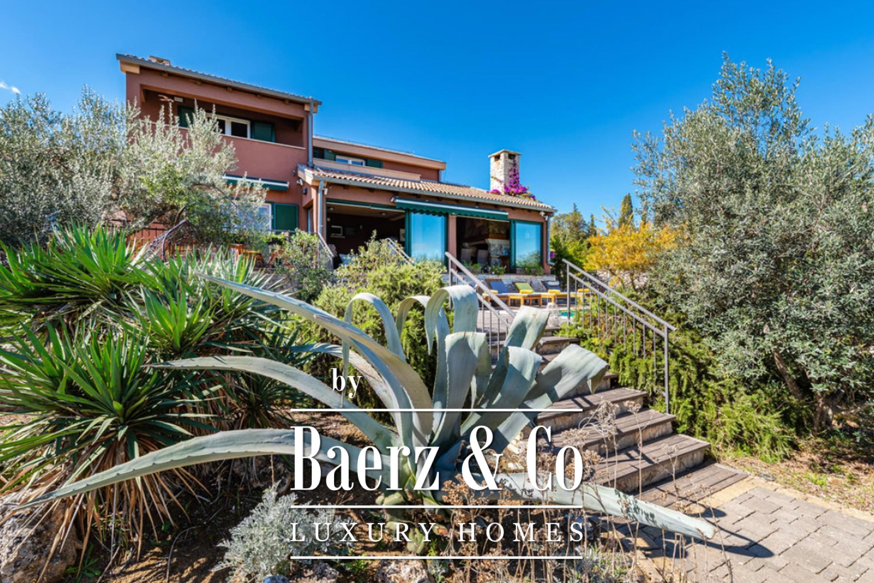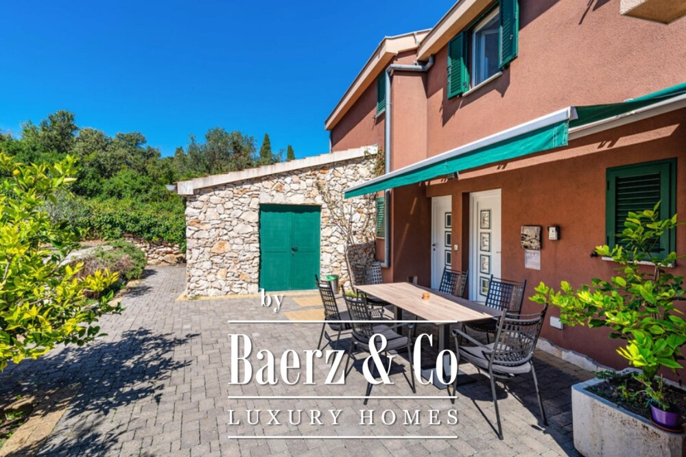 Steps from the sea, private access leads to the beach, flanked by two moorings suited for leisurely days on the water. An additional 330 m² plot houses a 27 m² storage room and garden areas, enclosed by a stone wall and accessed via a gated entrance with secure parking for five cars. The grounds also include an ecological olive grove of 1,100 m², yielding organic extra virgin oil from sixteen mature trees.