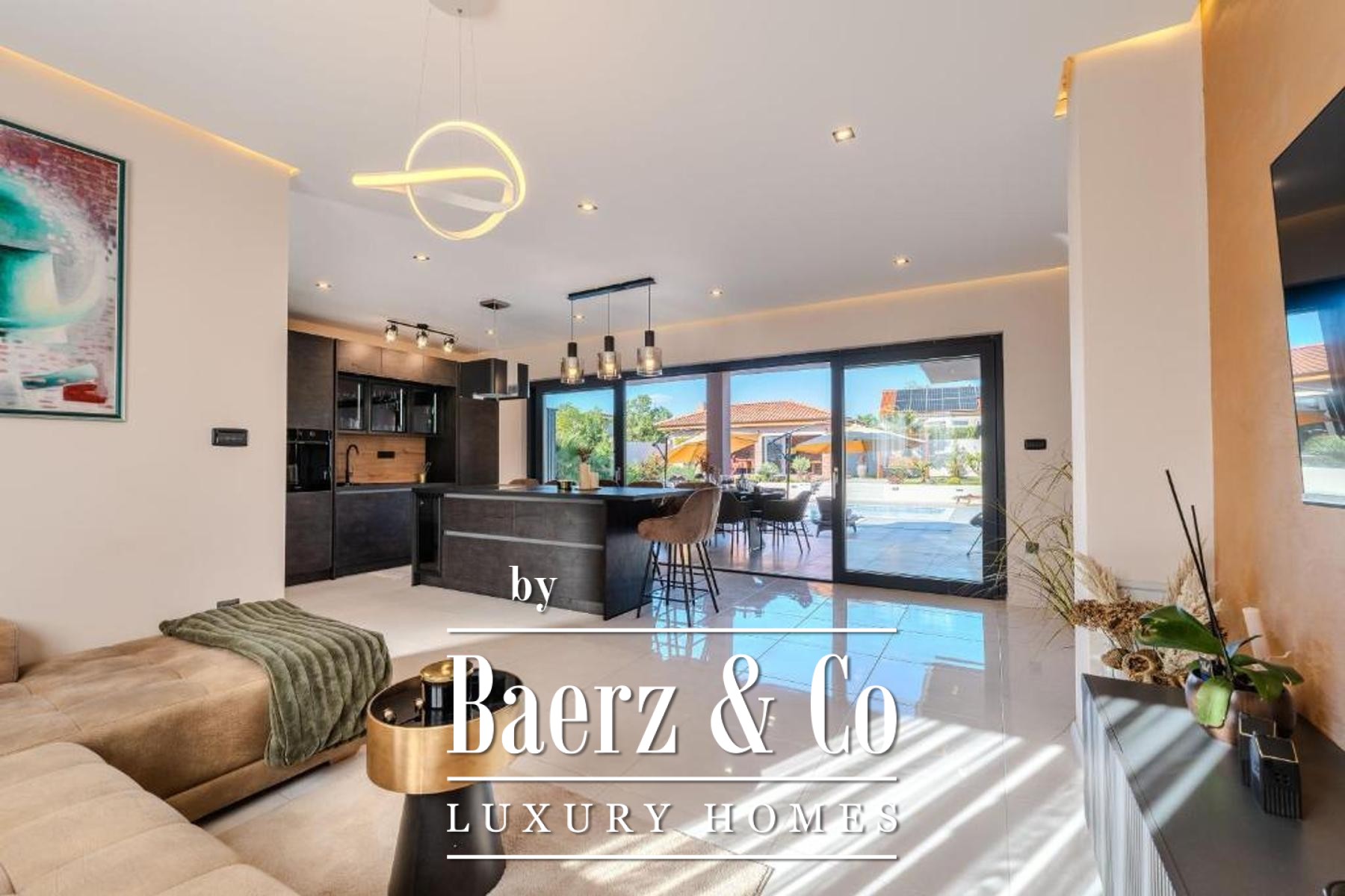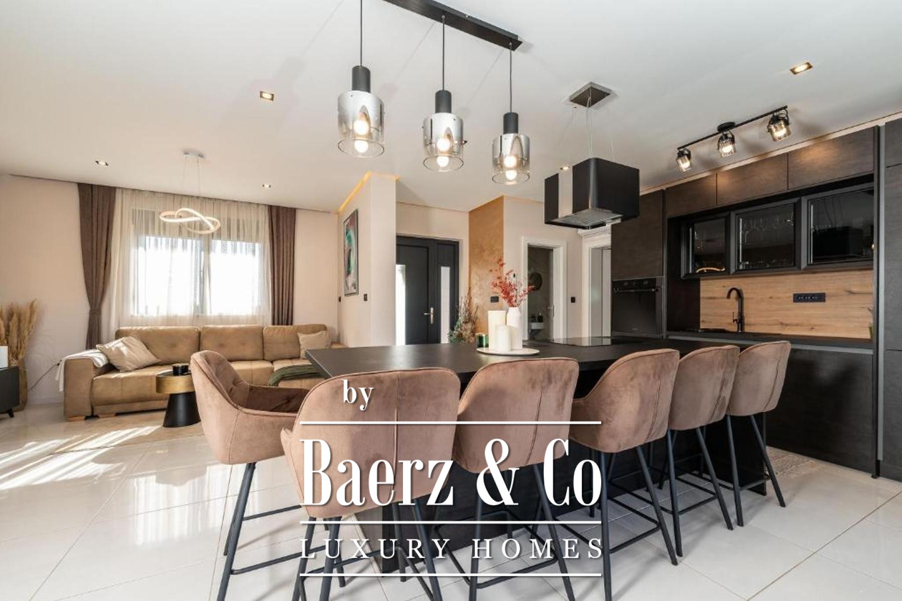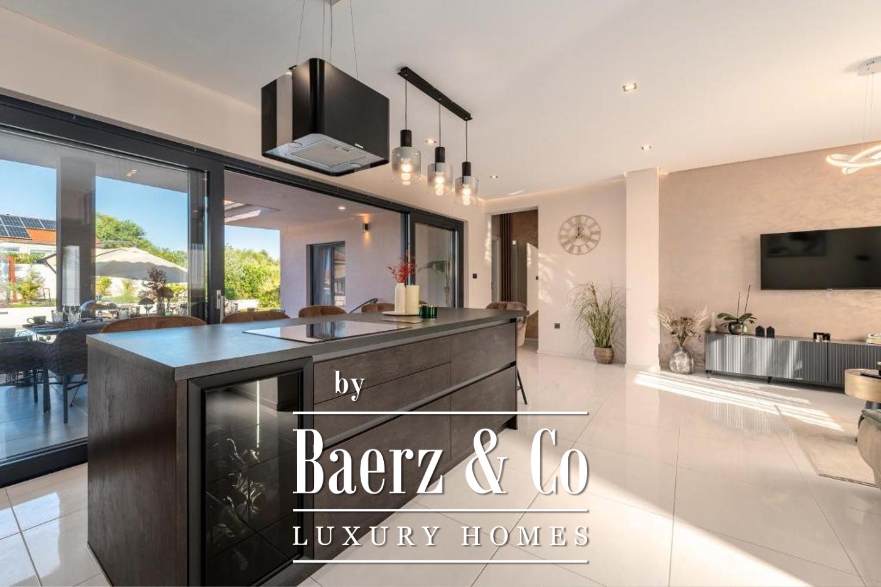 Spanning 483 m², the villa is arranged with clarity and purpose. A spacious living room and open kitchen gather the light and flow seamlessly to the garden, where a private swimming pool invites quiet afternoons or convivial evenings. Three thoughtfully appointed bedrooms, each with their own en suite bathroom, allow for privacy and ease across the home. In the grounds, a garden tavern adds a subtle note of tradition, designed for lingering meals or restorative solitude.