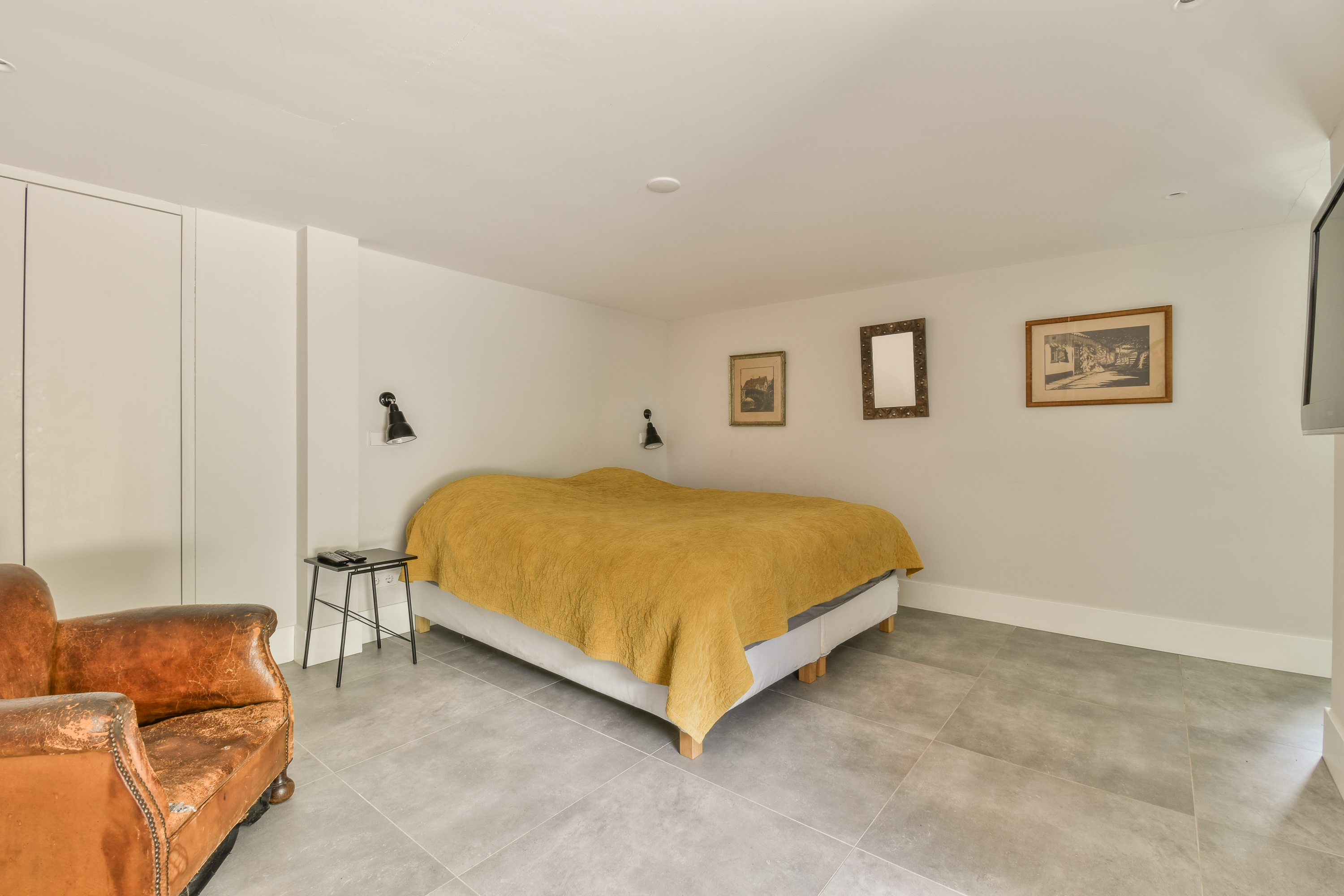 En el interior, el ambiente se inspira en la arquitectura de los años 30 reinterpretada para la vida contemporánea. La planta baja elevada alberga una amplia cocina y comedor, electrodomésticos de alta gama y grandes terrazas que integran interior y exterior. El salón recibe la luz tardía del sol a través de grandes ventanales, mientras que la piscina exterior climatizada y tres terrazas garantizan una privacidad poco común en un entorno rural.
