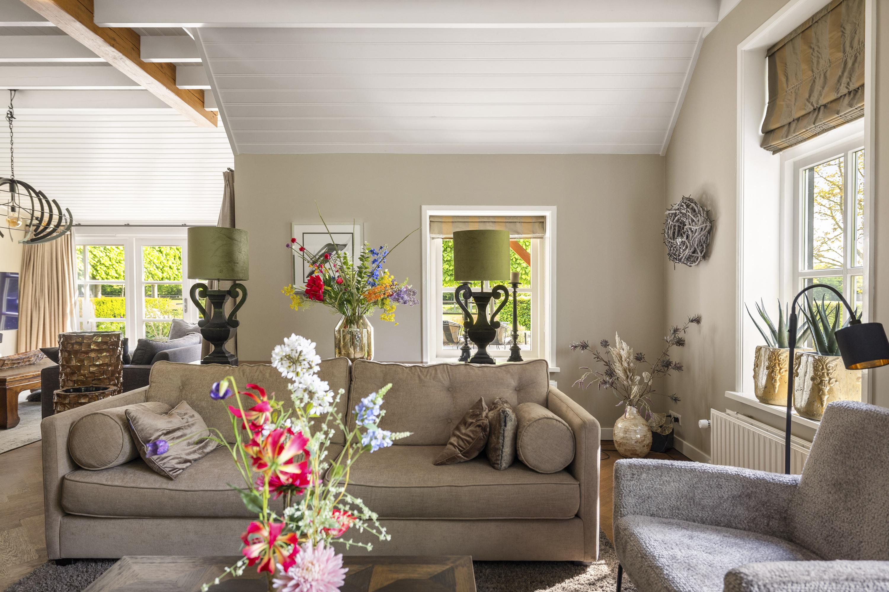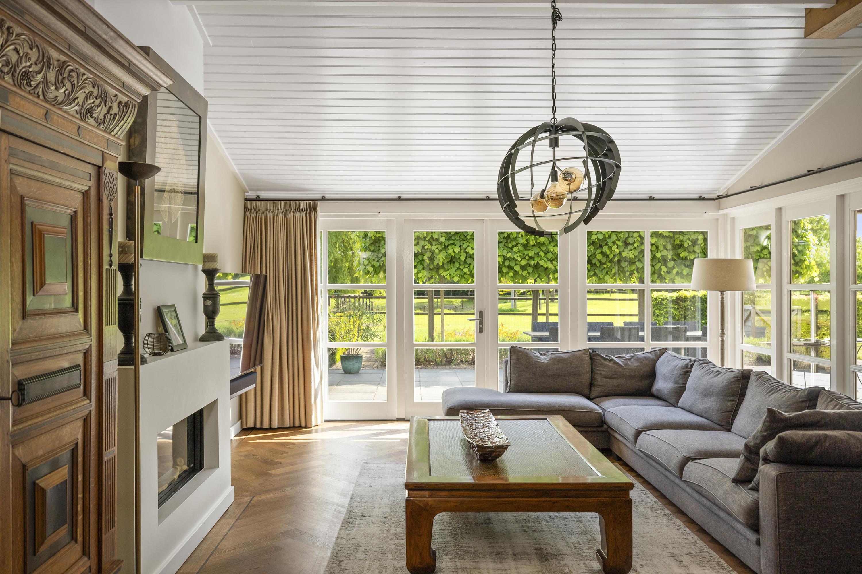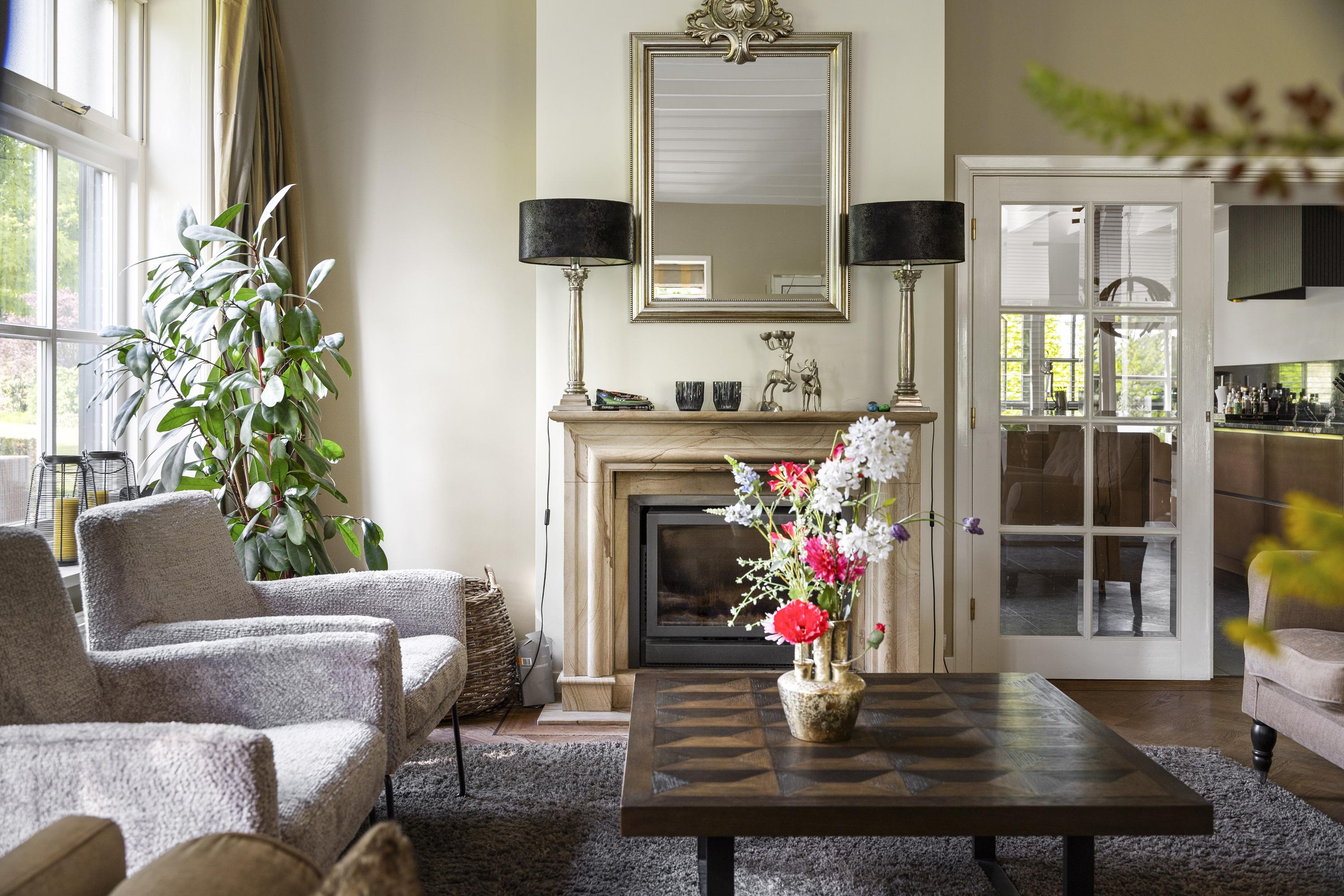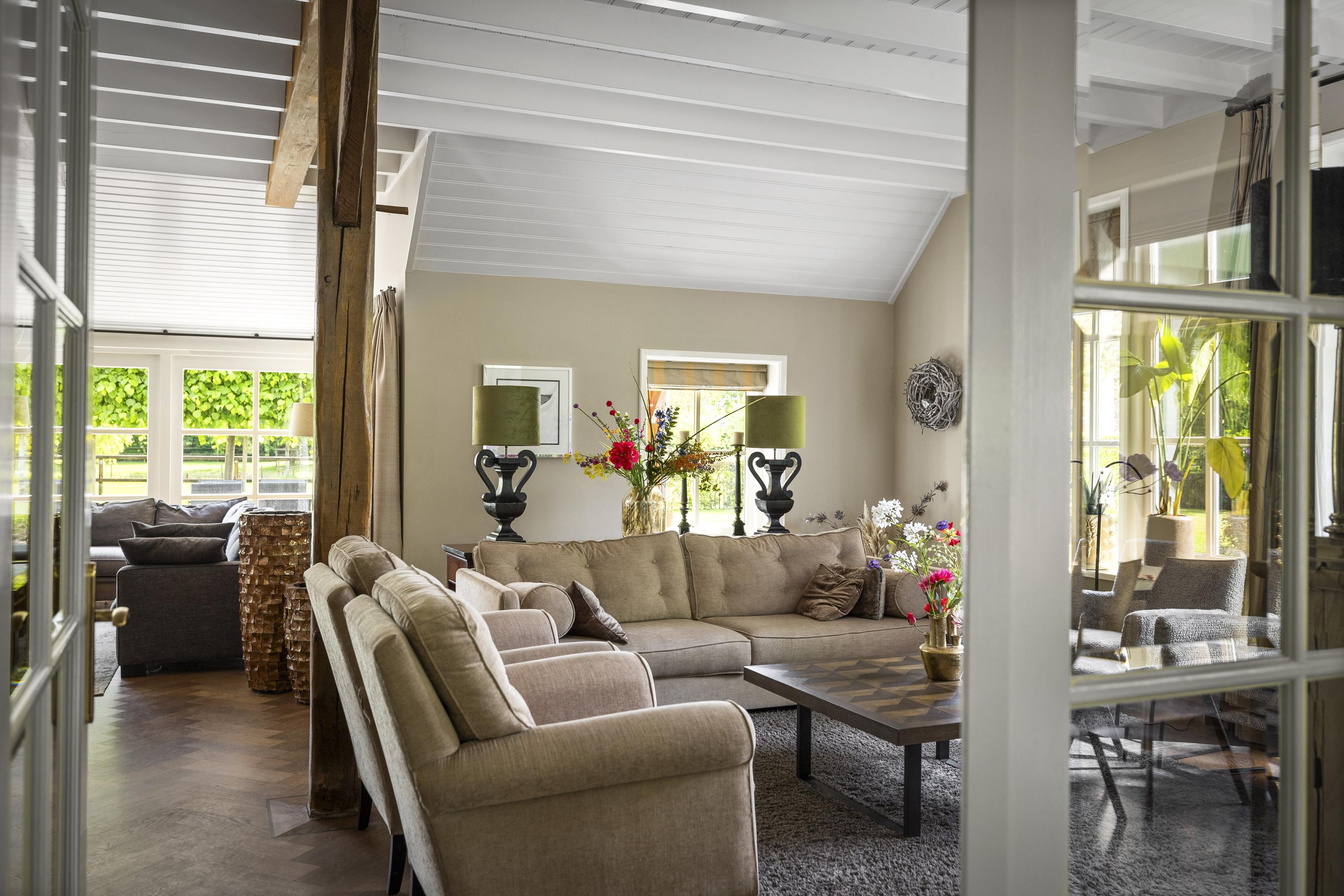 La residencia principal, erigida por primera vez en 1935 y renovada con esmero en los últimos años, ofrece actualmente 258 m² habitables, donde la utilización de piedra natural y parquet de roble en espiga imprime un ritmo cálido y acogedor. Cuatro dormitorios, dos baños y un luminoso vestíbulo central fluyen en un interior artesanal de discreto refinamiento. La cocina, de Lodder Keukens, está pensada tanto para el día a día como para reuniones sociales, con frentes de tonos cobrizos y encimeras de mármol. Los espacios de estar cuentan con dos chimeneas y vistas a jardines cuidados, establos y huertos.