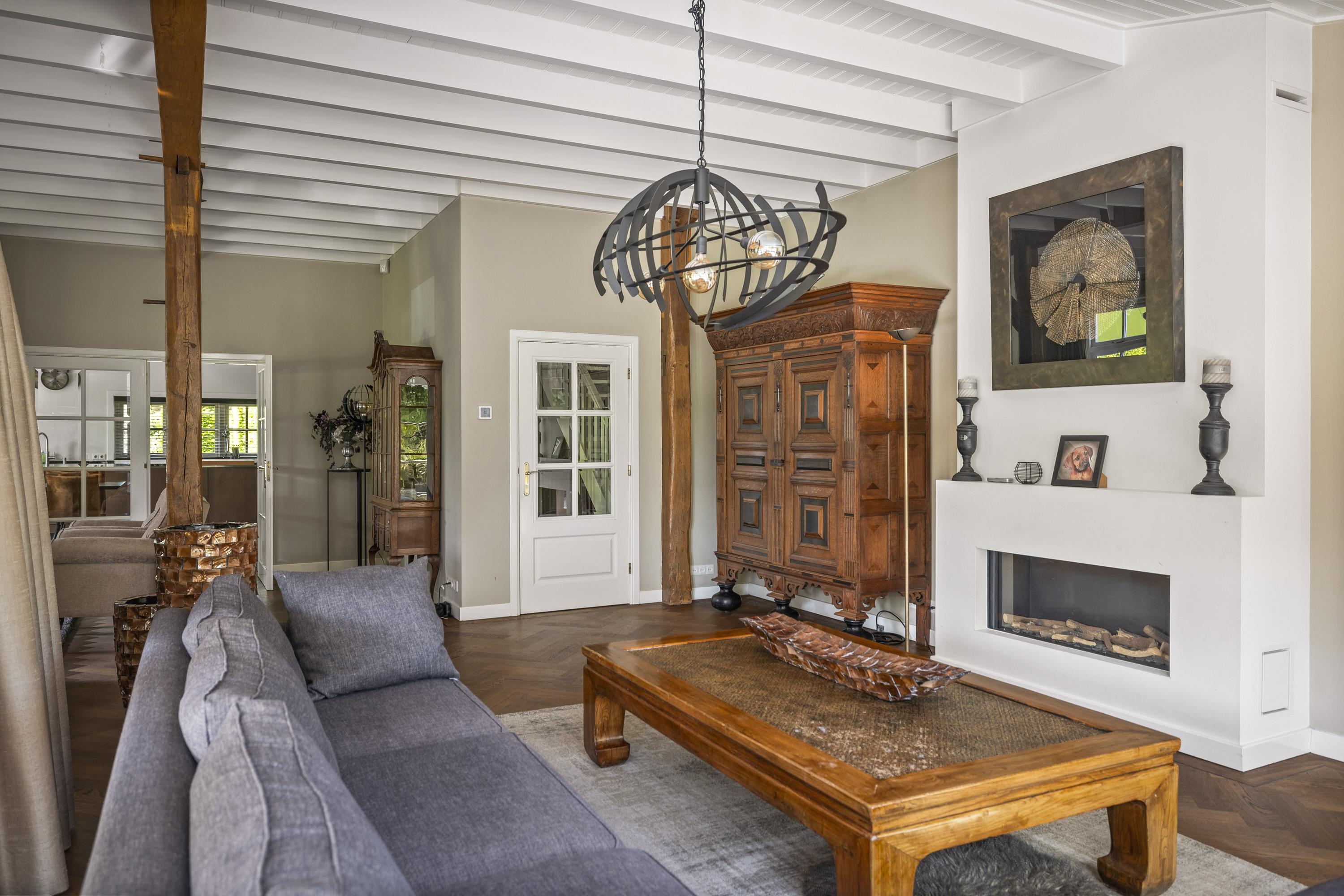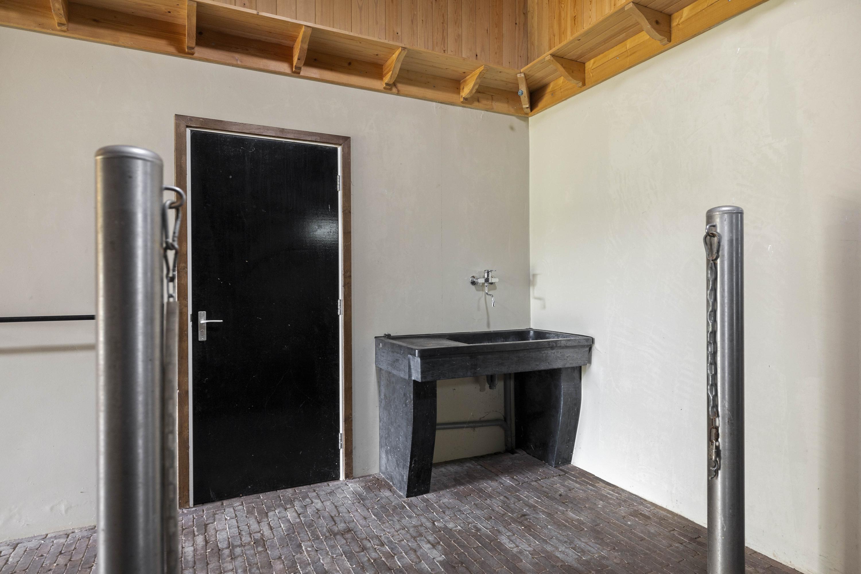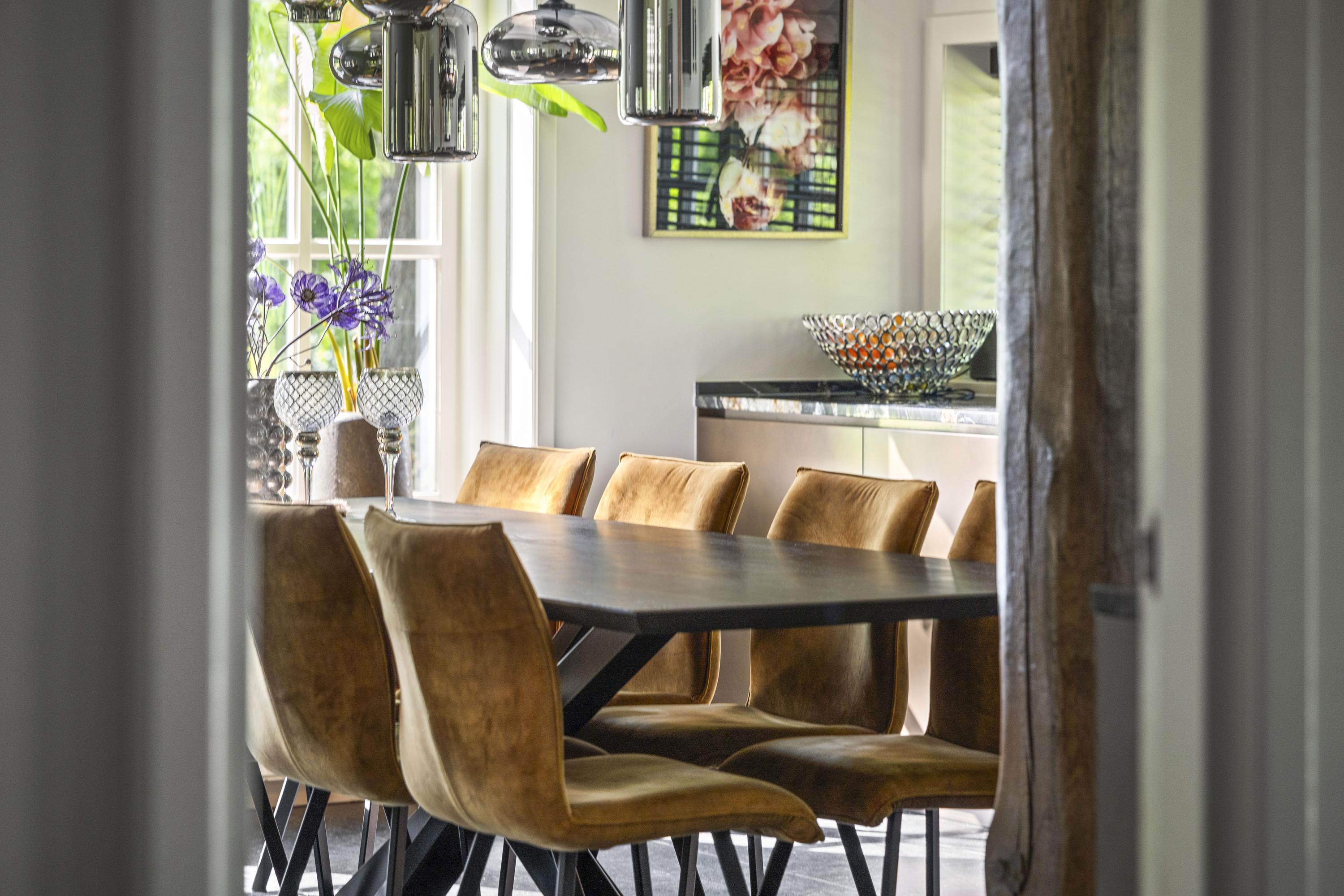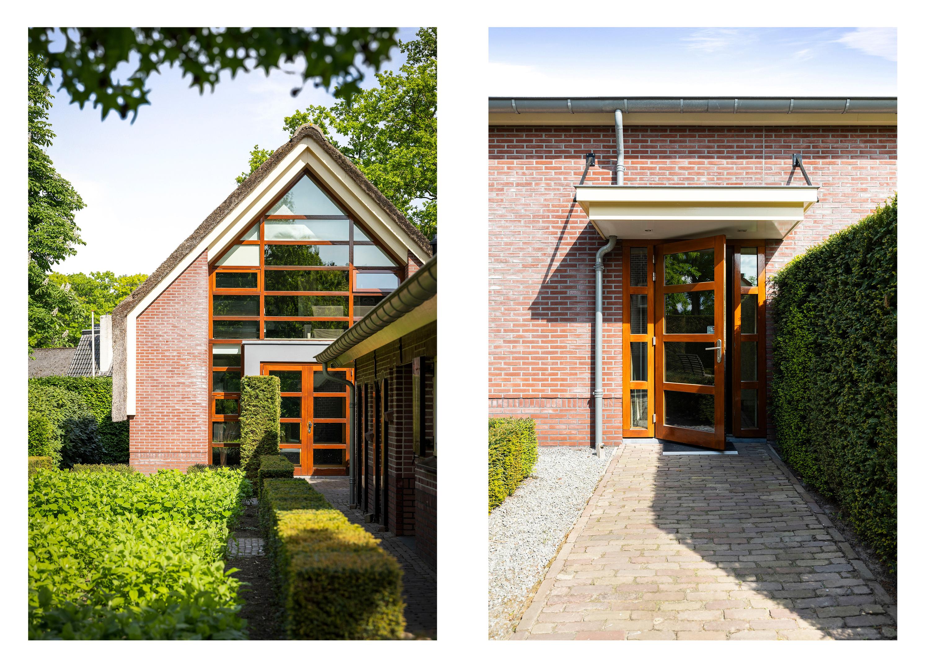 La residencia principal, erigida por primera vez en 1935 y renovada con esmero en los últimos años, ofrece actualmente 258 m² habitables, donde la utilización de piedra natural y parquet de roble en espiga imprime un ritmo cálido y acogedor. Cuatro dormitorios, dos baños y un luminoso vestíbulo central fluyen en un interior artesanal de discreto refinamiento. La cocina, de Lodder Keukens, está pensada tanto para el día a día como para reuniones sociales, con frentes de tonos cobrizos y encimeras de mármol. Los espacios de estar cuentan con dos chimeneas y vistas a jardines cuidados, establos y huertos.