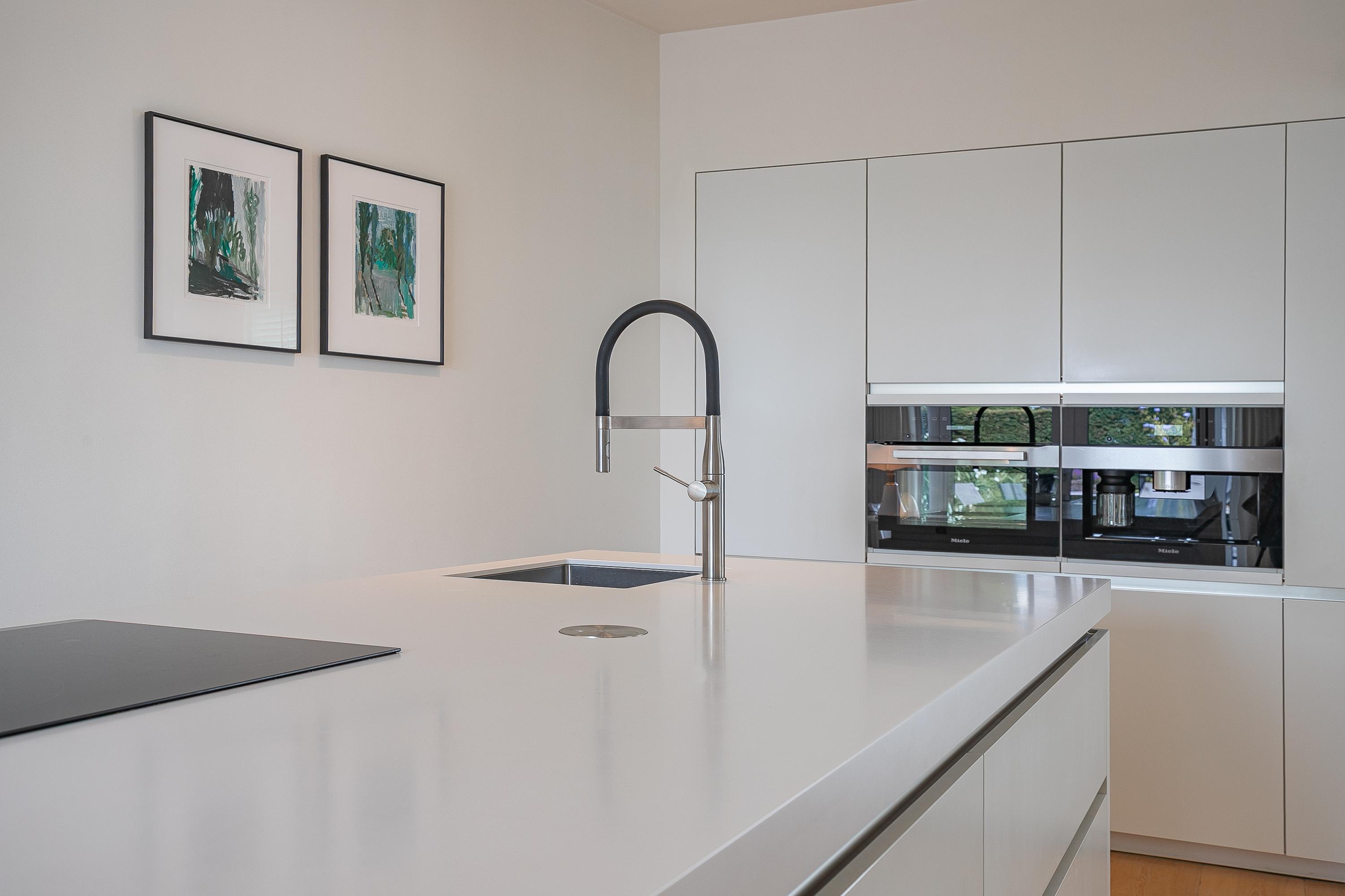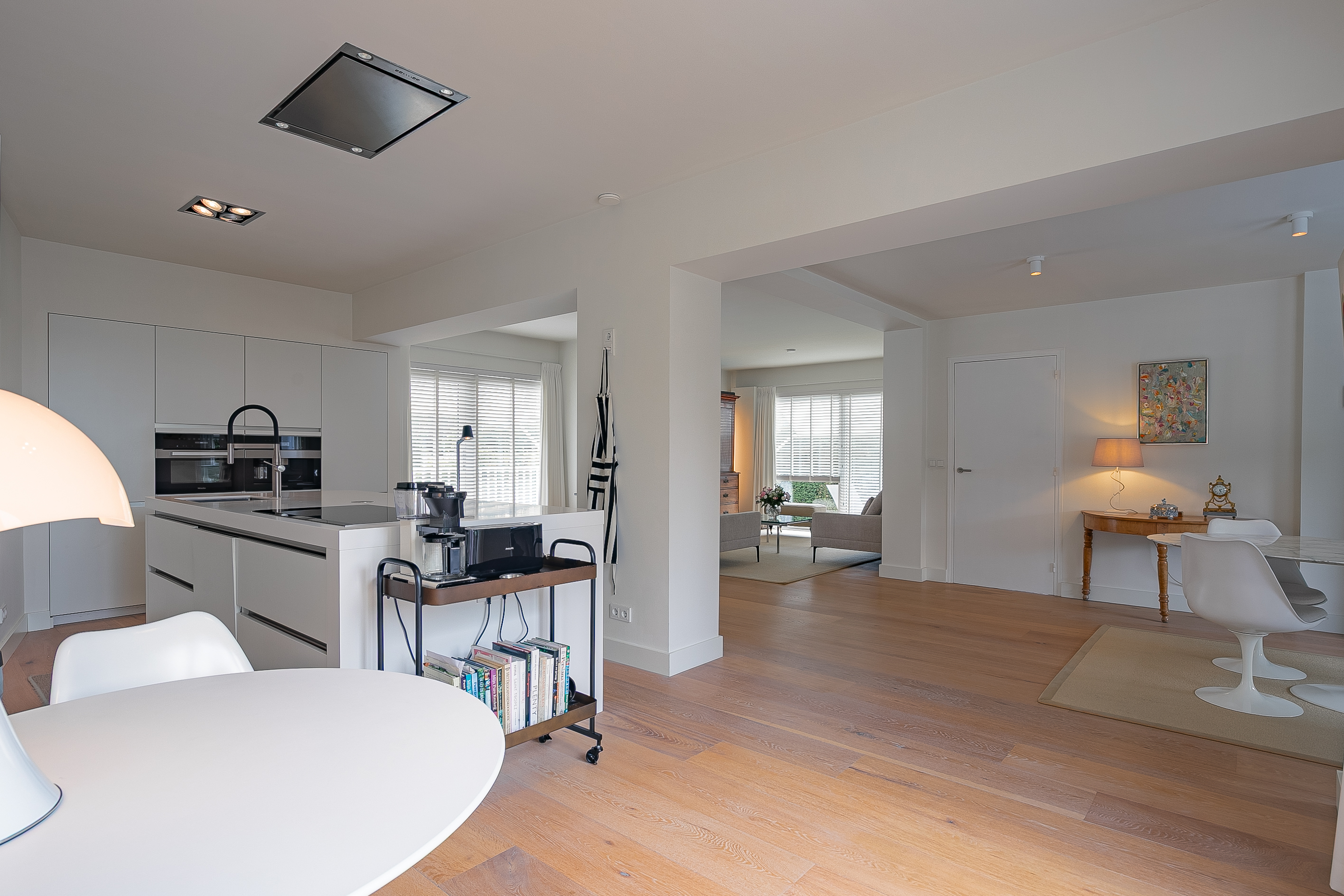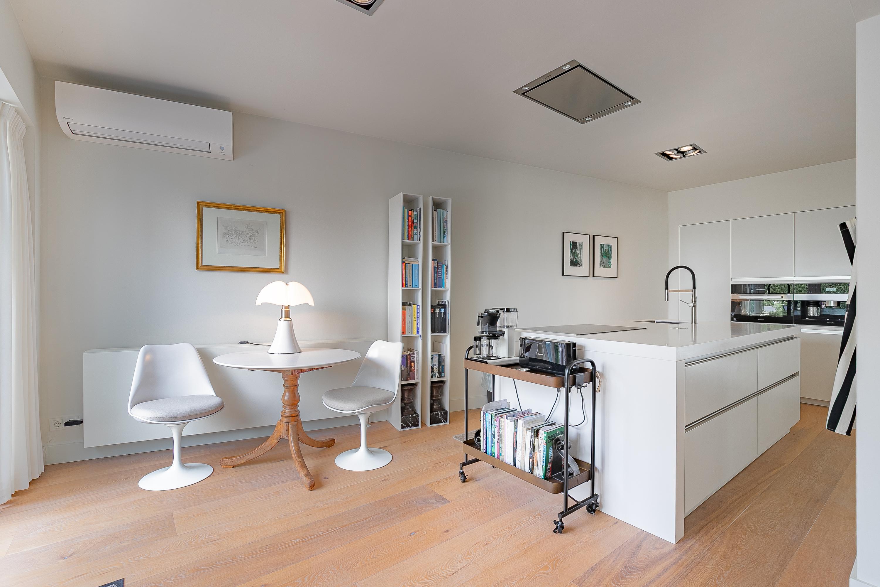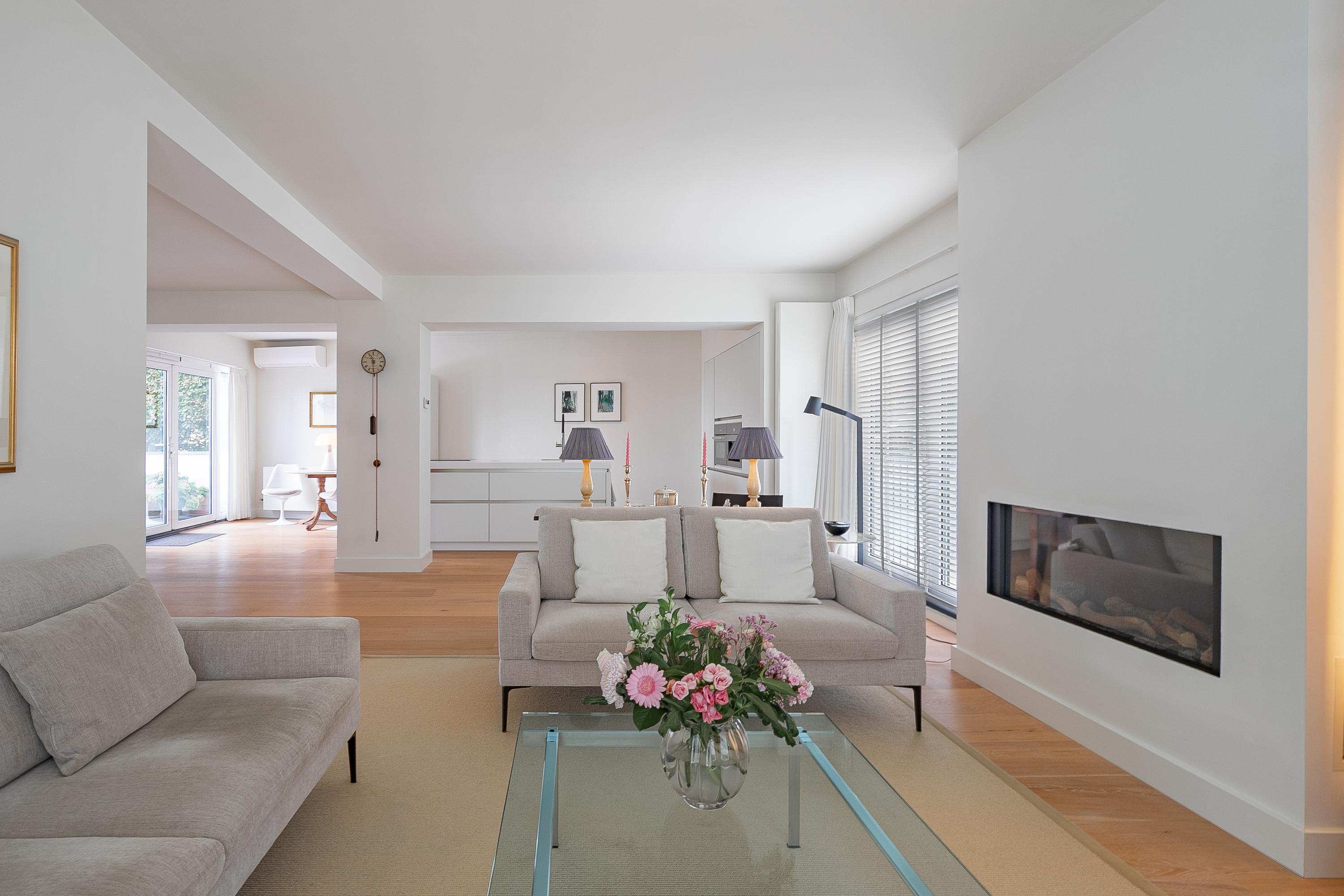 La planta baja de concepto abierto gira en torno a una amplia zona de estar de aproximadamente 68 m², distinguida por su suelo de parquet de roble, una chimenea de gas Faber a medida y radiadores de diseño. La cocina sin tiradores cuenta con placa de inducción de cinco zonas, horno de convección, cafetera integrada y puertas correderas hacia el jardín, invitando a un ritmo diario sin esfuerzo y a la recepción de invitados. El salón se conecta con un jardín urbano protegido orientado al noreste y un frondoso patio delantero que recibe el sol de la tarde.