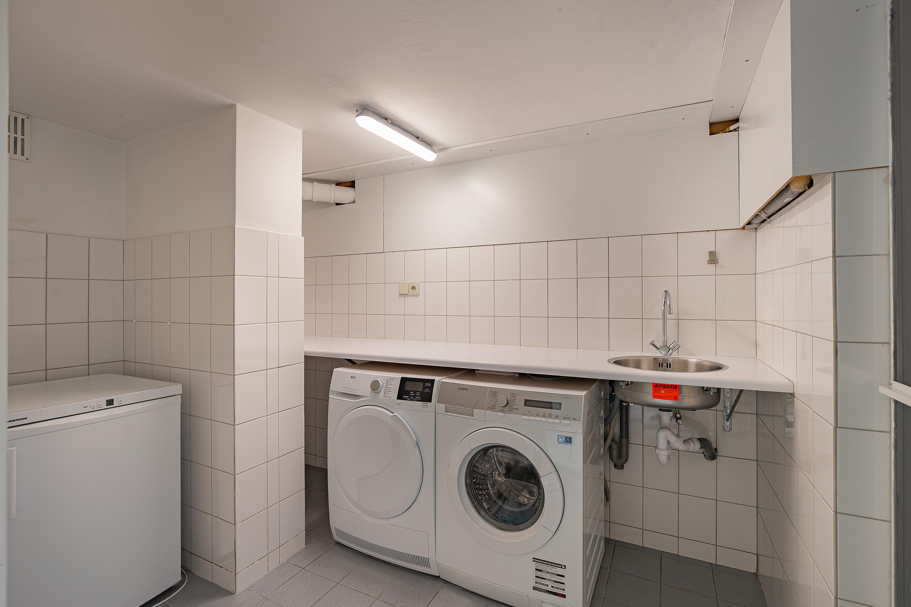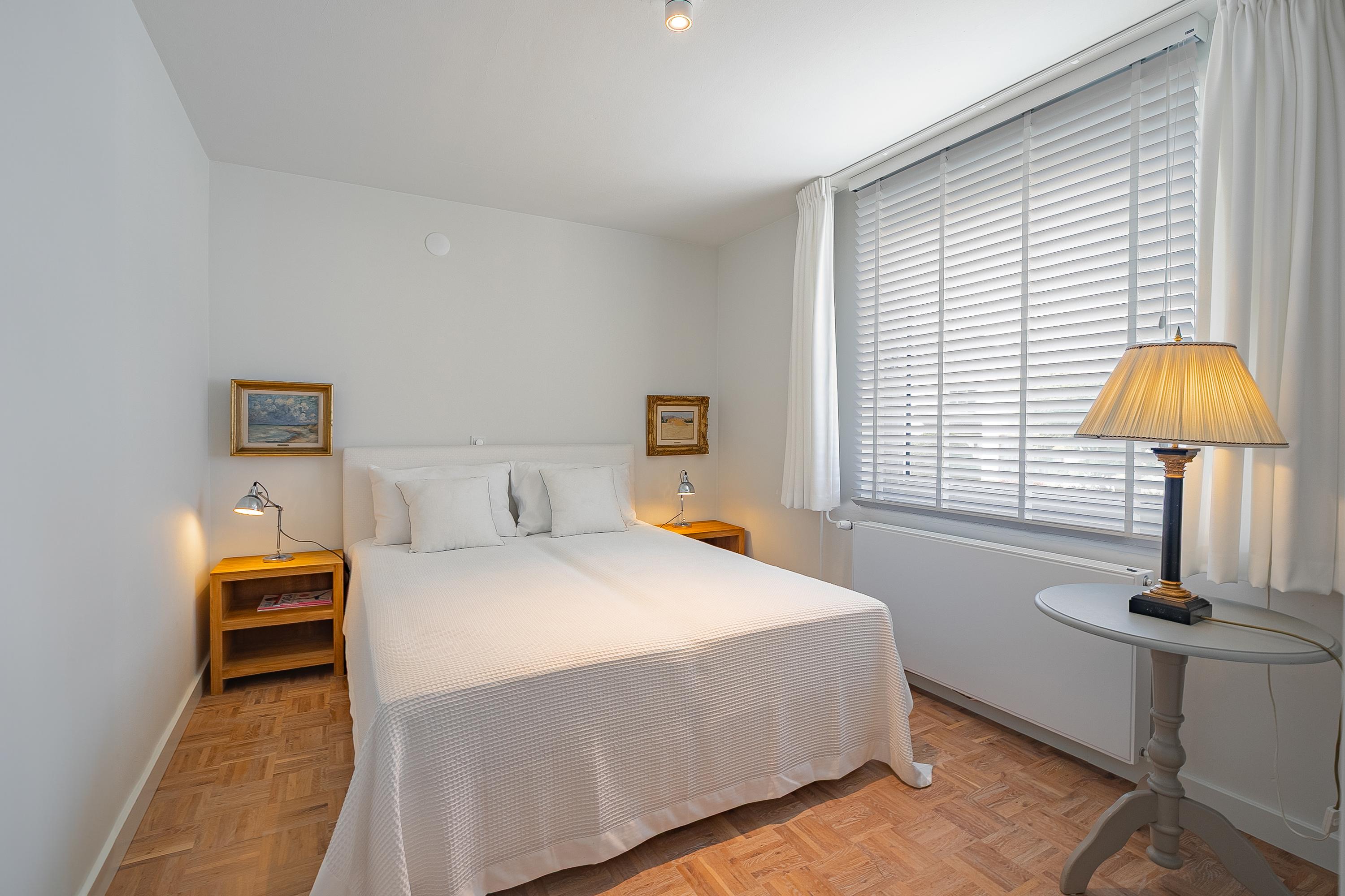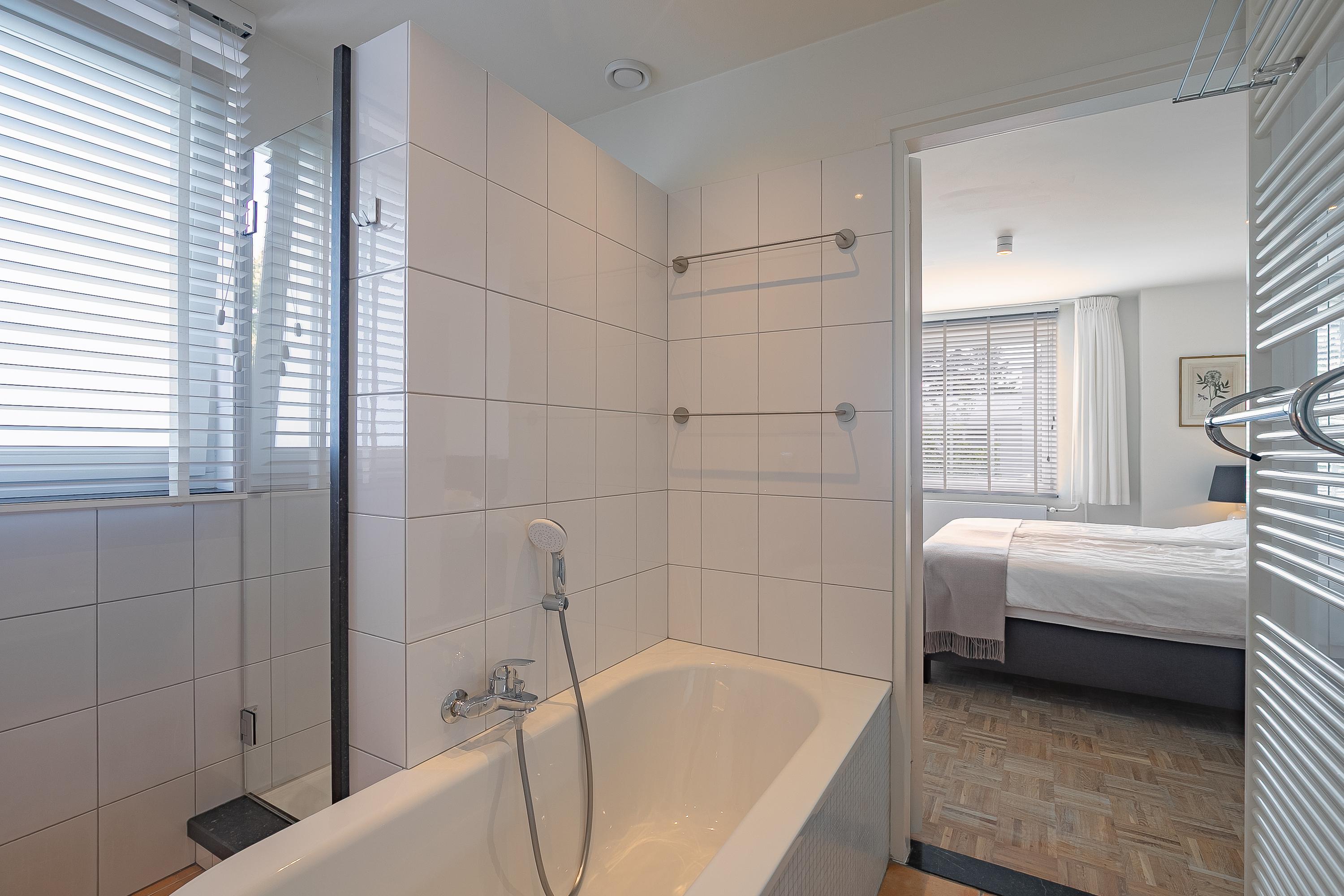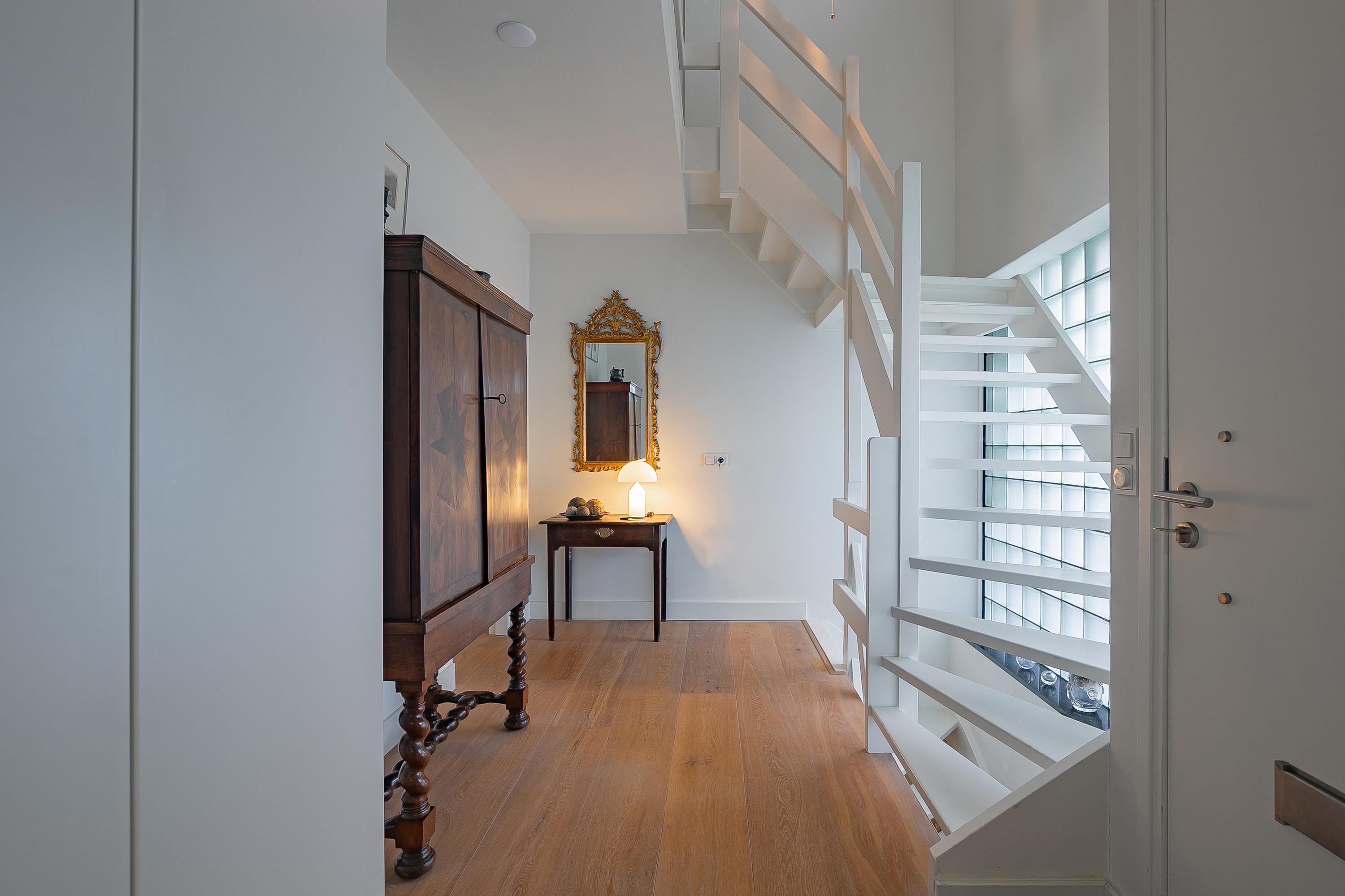 En la planta superior, los cuatro dormitorios están acompañados de armarios hechos a medida por Slangen Interieurbouw y suelos de parquet de mosaico. El baño ofrece ducha a ras de suelo y bañera, ventilación mecánica y calefacción por suelo radiante. El dormitorio principal dispone de aire acondicionado; abundan las soluciones de almacenamiento, como un generoso sótano con garaje de 33 m² y cuartos de servicio, además de un altillo para almacenamiento adicional.