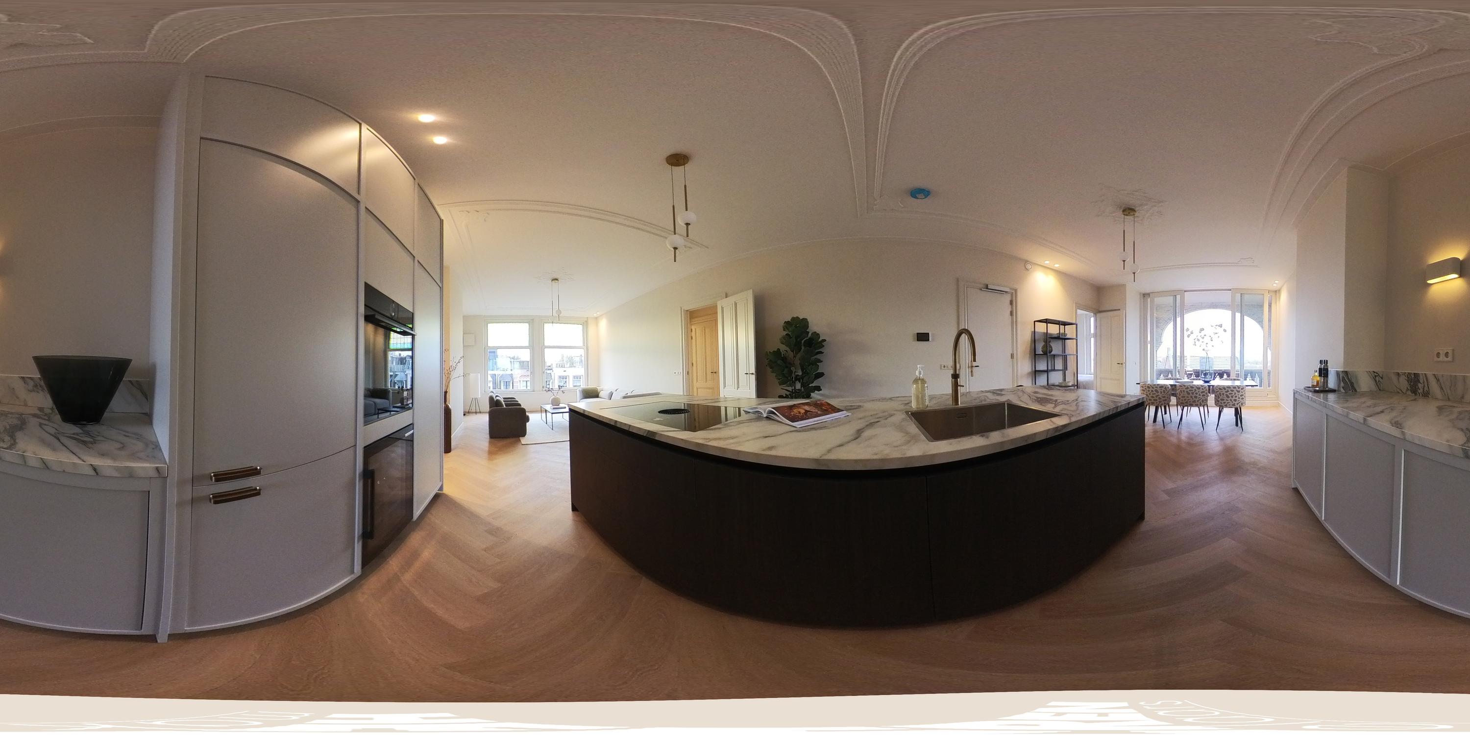 L’espace de vie ouvert se distingue par une lumière naturelle généreuse, grâce aux grandes fenêtres en façade et à l’arrière, soulignée par une hauteur sous plafond d’environ 3,07 mètres. La cuisine haut de gamme constitue le cœur convivial de l’appartement, avec un îlot spacieux doté de plaques à induction, d’un robinet Quooker, d’électroménagers intégrés et d’un espace bar propice aux conversations détendues. Deux chambres et deux salles de bains offrent intimité et confort ; la suite principale dispose d’armoires encastrées et d’une salle d’eau privative avec douche à l’italienne. La seconde salle de bains a été pensée pour accueillir famille et invités.