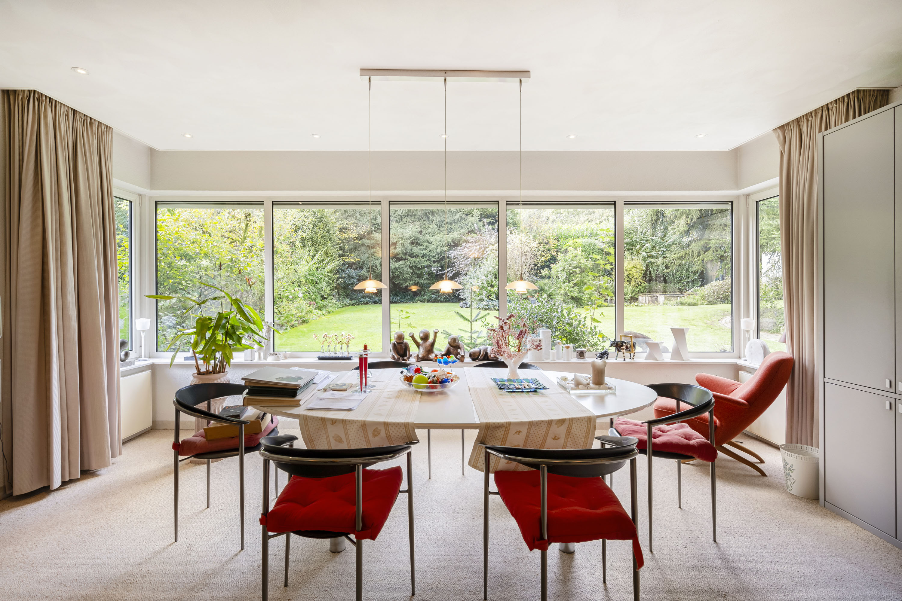 La Villa Velp avec piscine intérieure se trouve en lisière de la réserve naturelle du Posbank, offrant 350 m² habitables et une intimité totale au cœur d’un jardin paysager mature de 1 911 m². Cette villa de quatre chambres allie confort et architecture, donnant la part belle à la lumière naturelle et à une conception moderne, fluide et élégante. Les vastes pièces de vie s’ouvrent par de larges façades vitrées sur un jardin en légère pente, assurant une continuité élégante entre intérieur et extérieur.