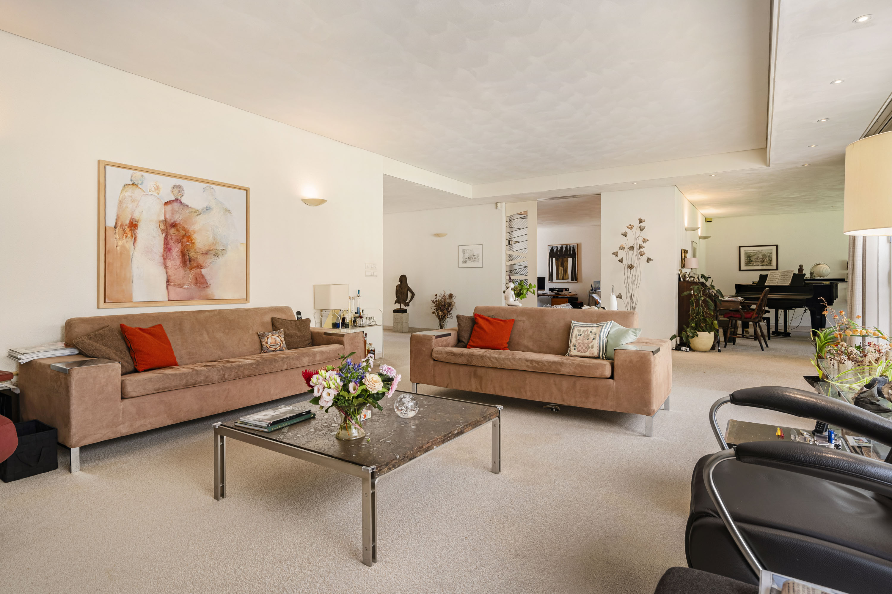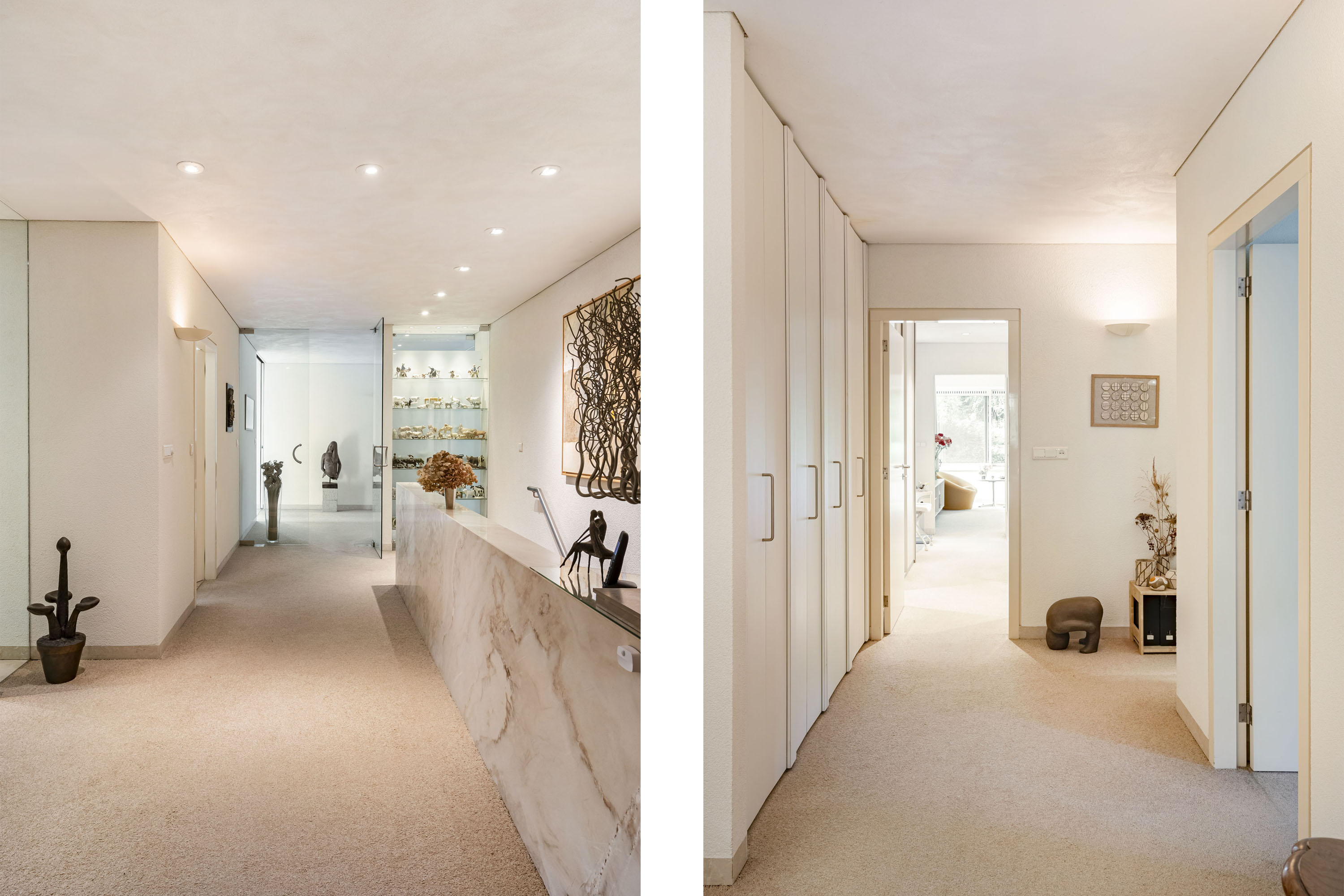 La disposition intelligente comprend un grand salon, une salle à manger tournée vers le jardin, un bureau ainsi qu’une cuisine ouverte attenante à une buanderie équipée d’un monte-plat discret. De belles portes coulissantes permettent l’équilibre idéal entre ouverture et intimité. La piscine intérieure, dotée d’un système de nage à contre-courant et de portes vitrées donnant accès au jardin, incarne le bien-être à domicile. La suite parentale dispose de la climatisation et d’un accès direct au jardin, tandis que deux salles de bains sont équipées d’une baignoire et d’une douche.