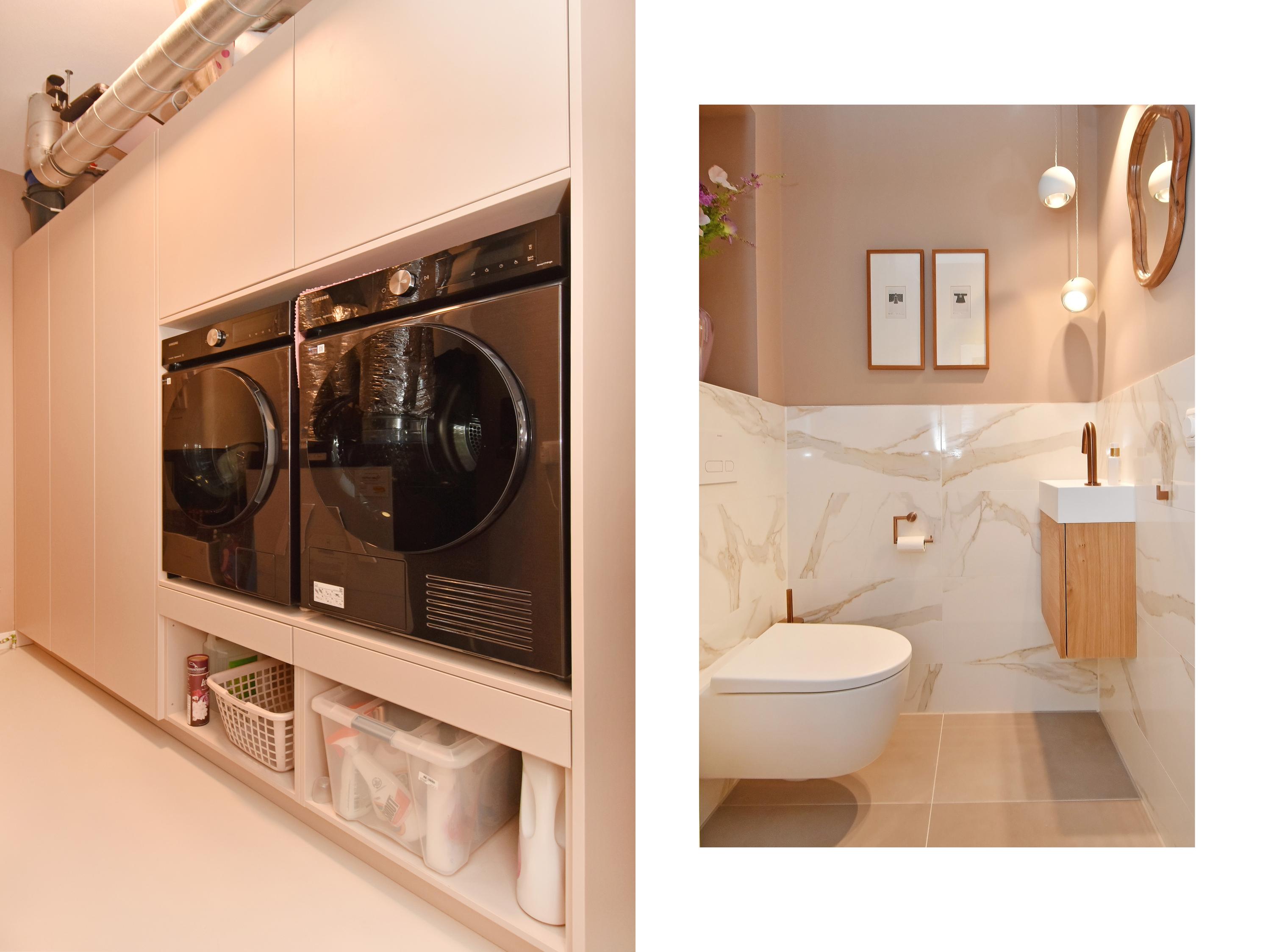 De moderne badkamer is ingericht volgens de laatste trends en voorzien van een inloopdouche, stijlvol wastafelmeubel en ligbad. Daarnaast is er een separaat toilet en een praktische berging met op maat gemaakte kast voor wasmachine en droger. Verder bevinden zich hier de WTW-unit en warmtepomp.