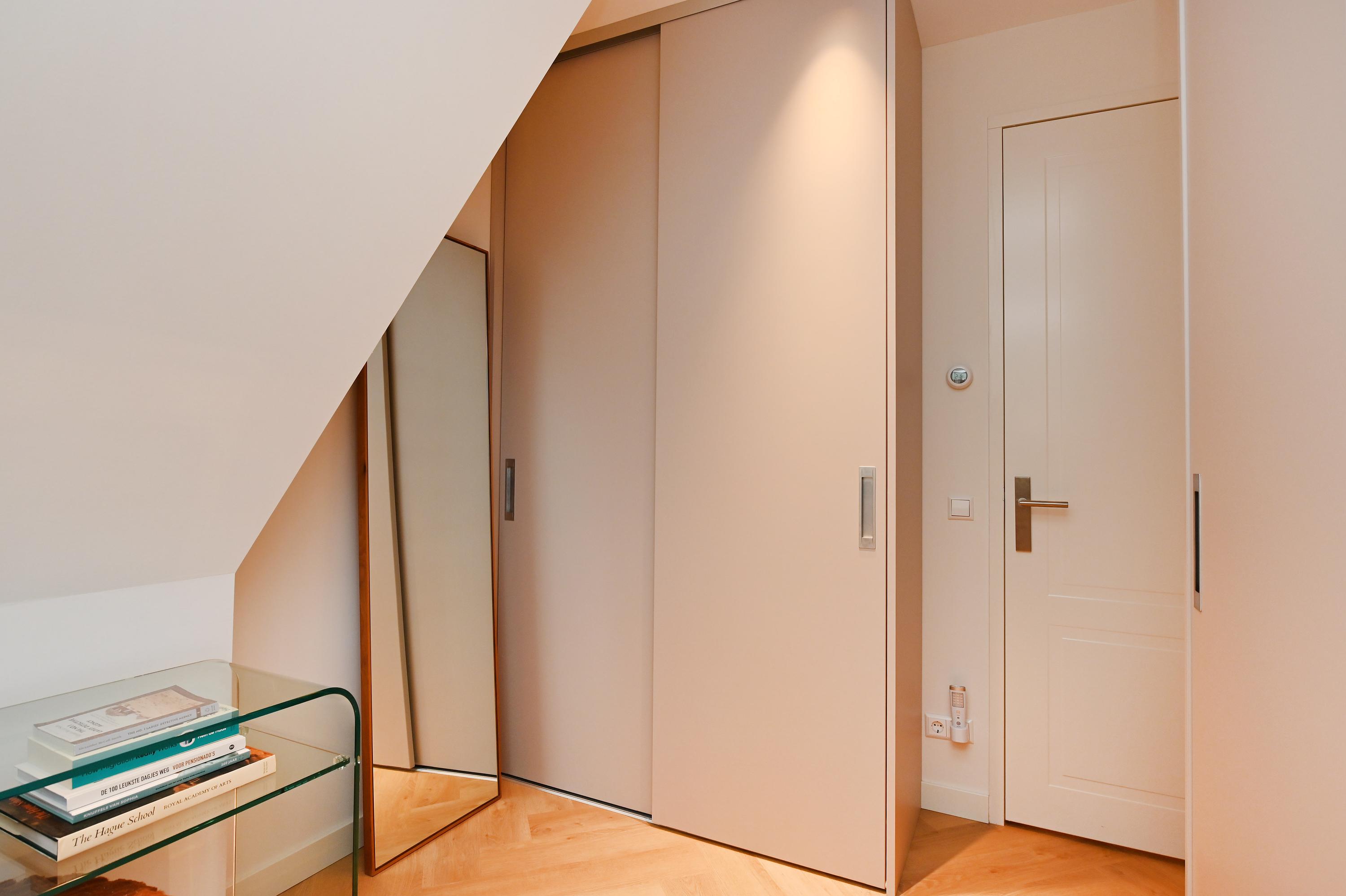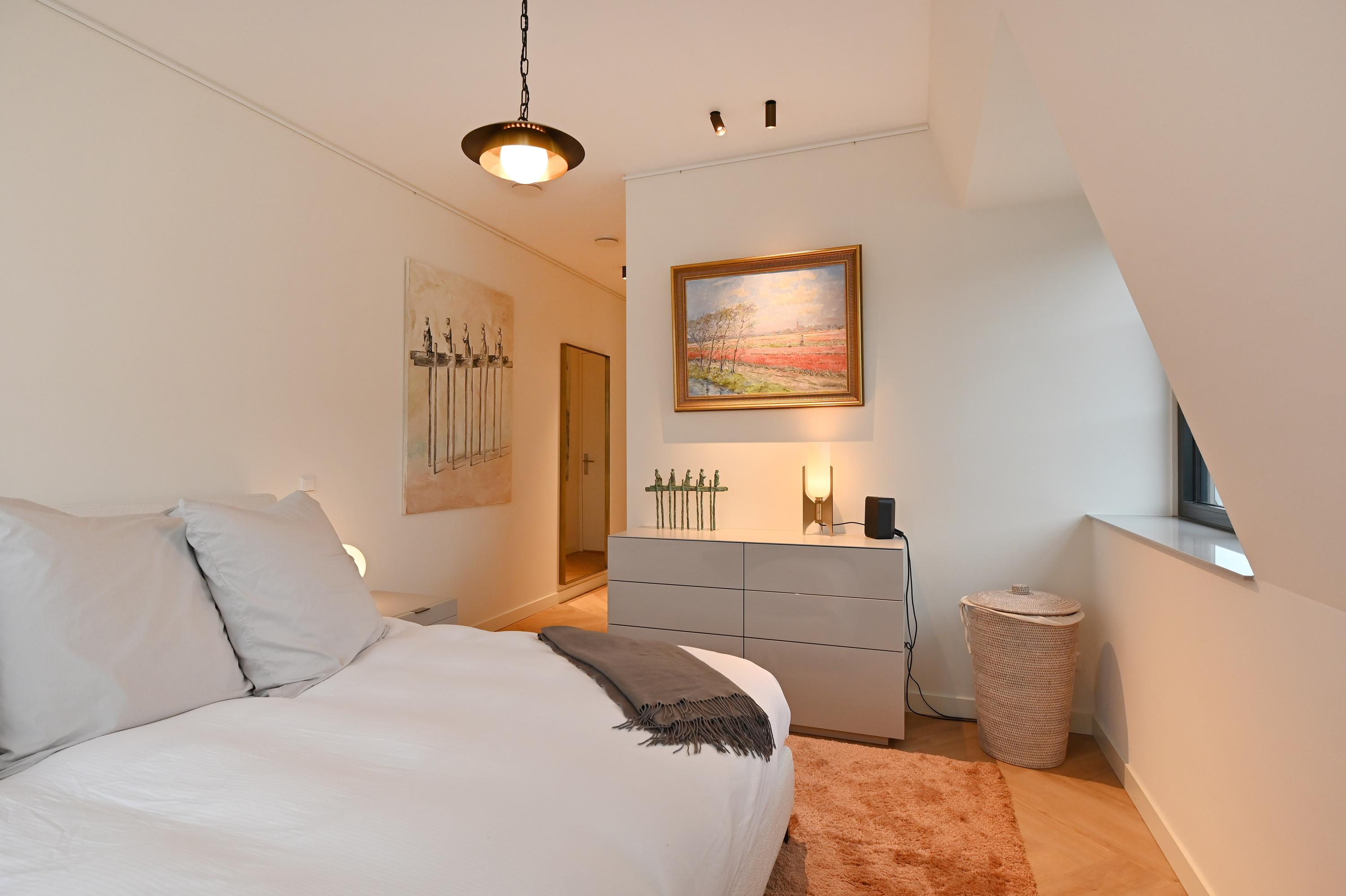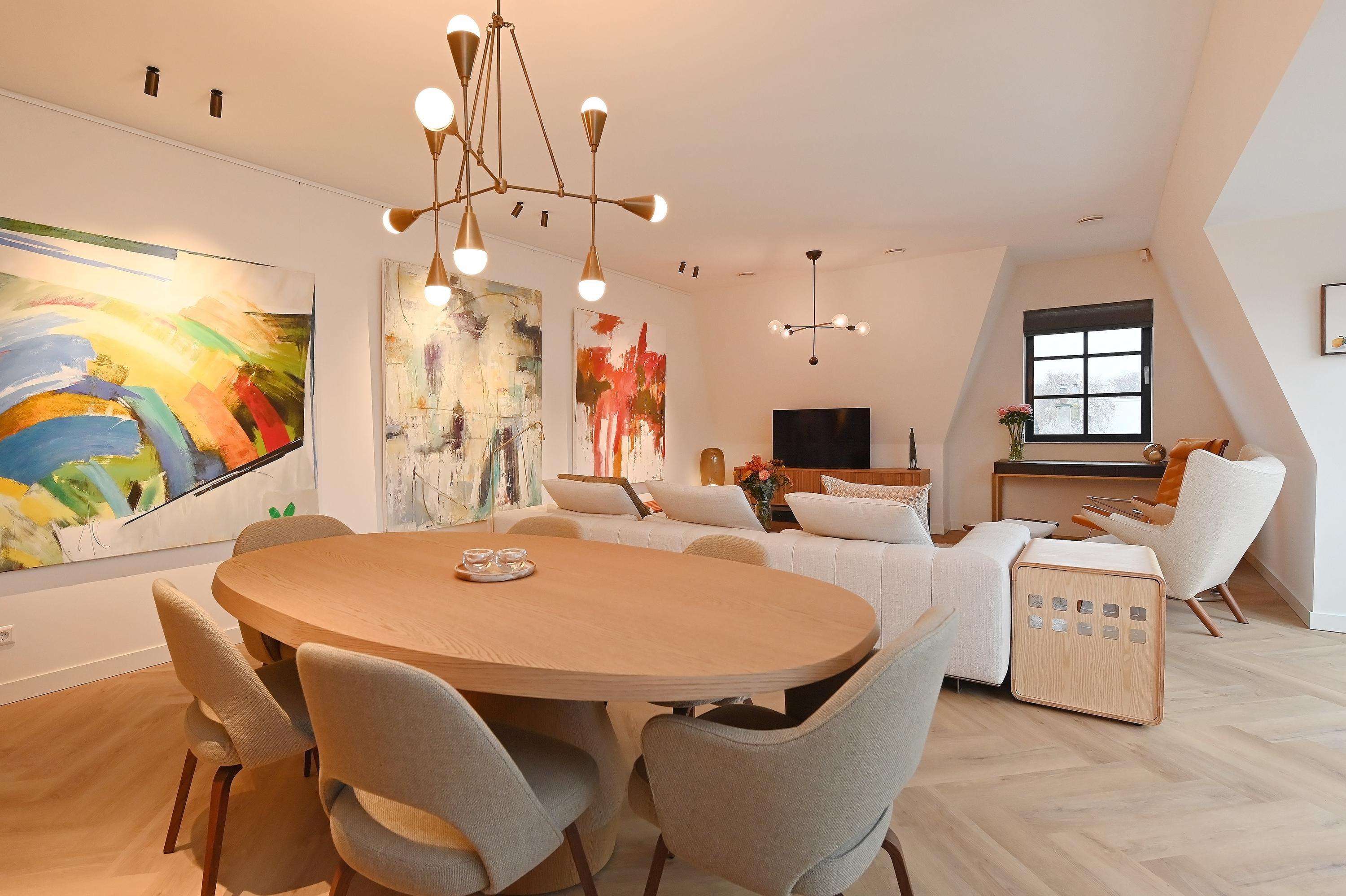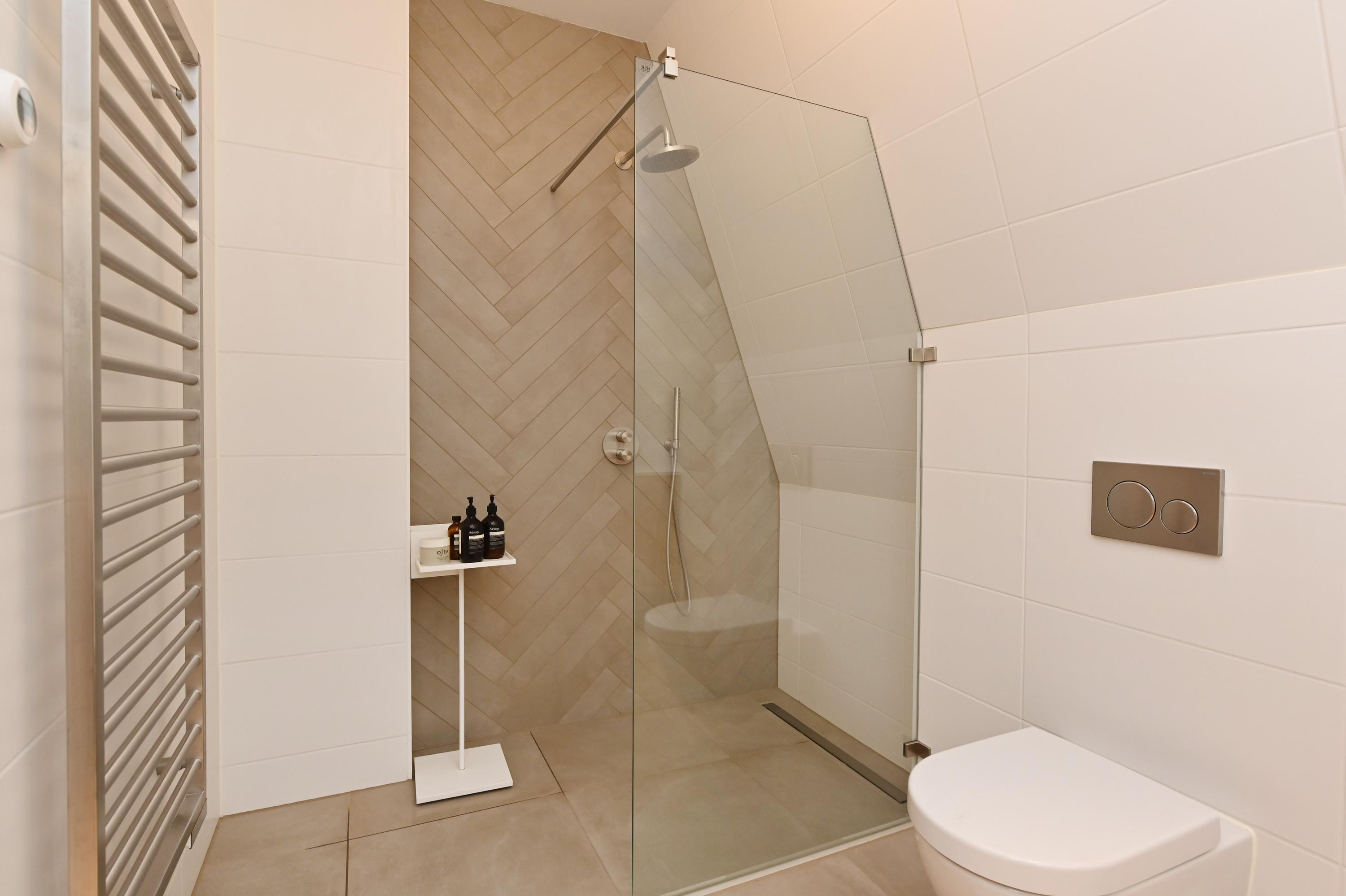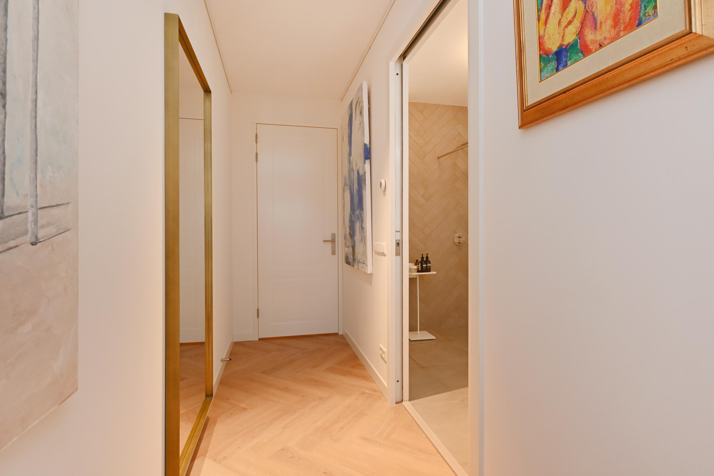 Trappenhuis met lift, centrale hal, ruime en lichte woonkamer met L-vormige Poggenpohl keuken met moderne ingebouwde keukenapparatuur (zoals een inductiekookplaat, oven en Quooker) en een aangrenzend zit-barretje. Middels een dubbele schuifdeur verleent de woonkamer toegang tot het ruime terras (ca. 13,5 m2) met middag en avondzon, vrij uitzicht en moderne afwerkingen. Ruime hoofdslaapkamer met badkamer die beschikt over een regendouche, toilet en dubbele wastafel. 2e ruime slaapkamer met ingebouwde kast en 3e slaapkamer met ingebouwde kasten. Deze beide slaapkamers zijn ook te gebruiken als kantoor- of hobbyruimten. Moderne en ruime badkamer met regendouche, dubbele wastafels en spiegelverlichting. Apart toilet in de hal.