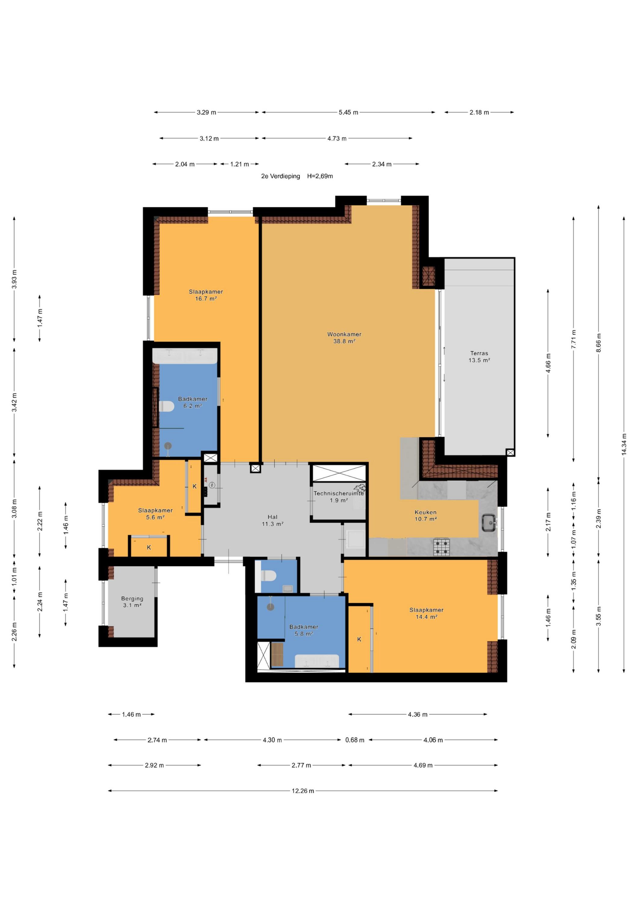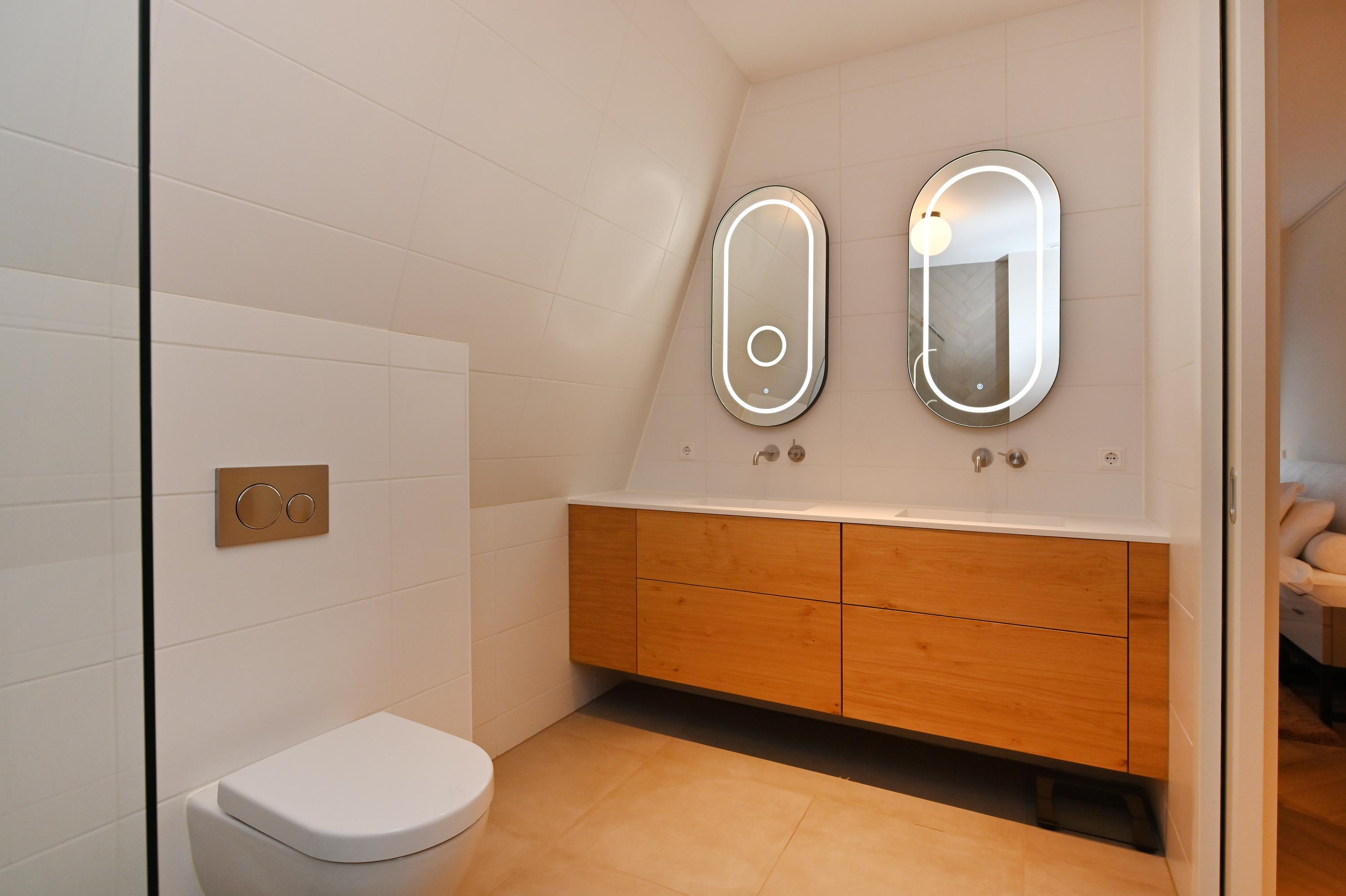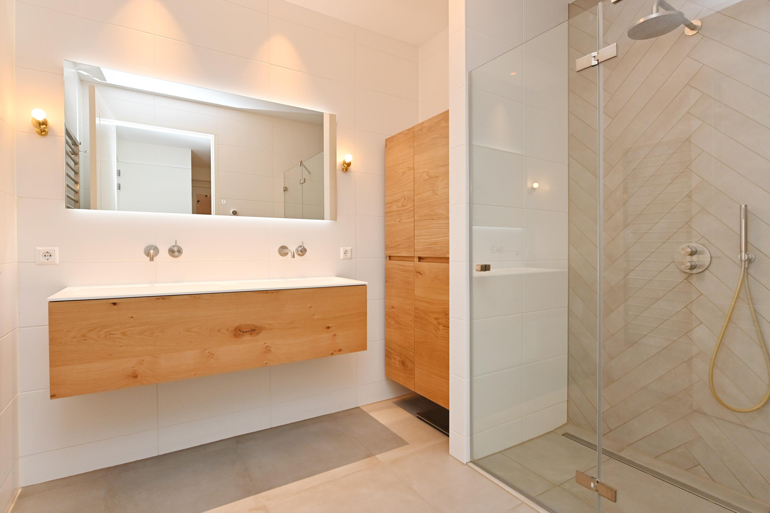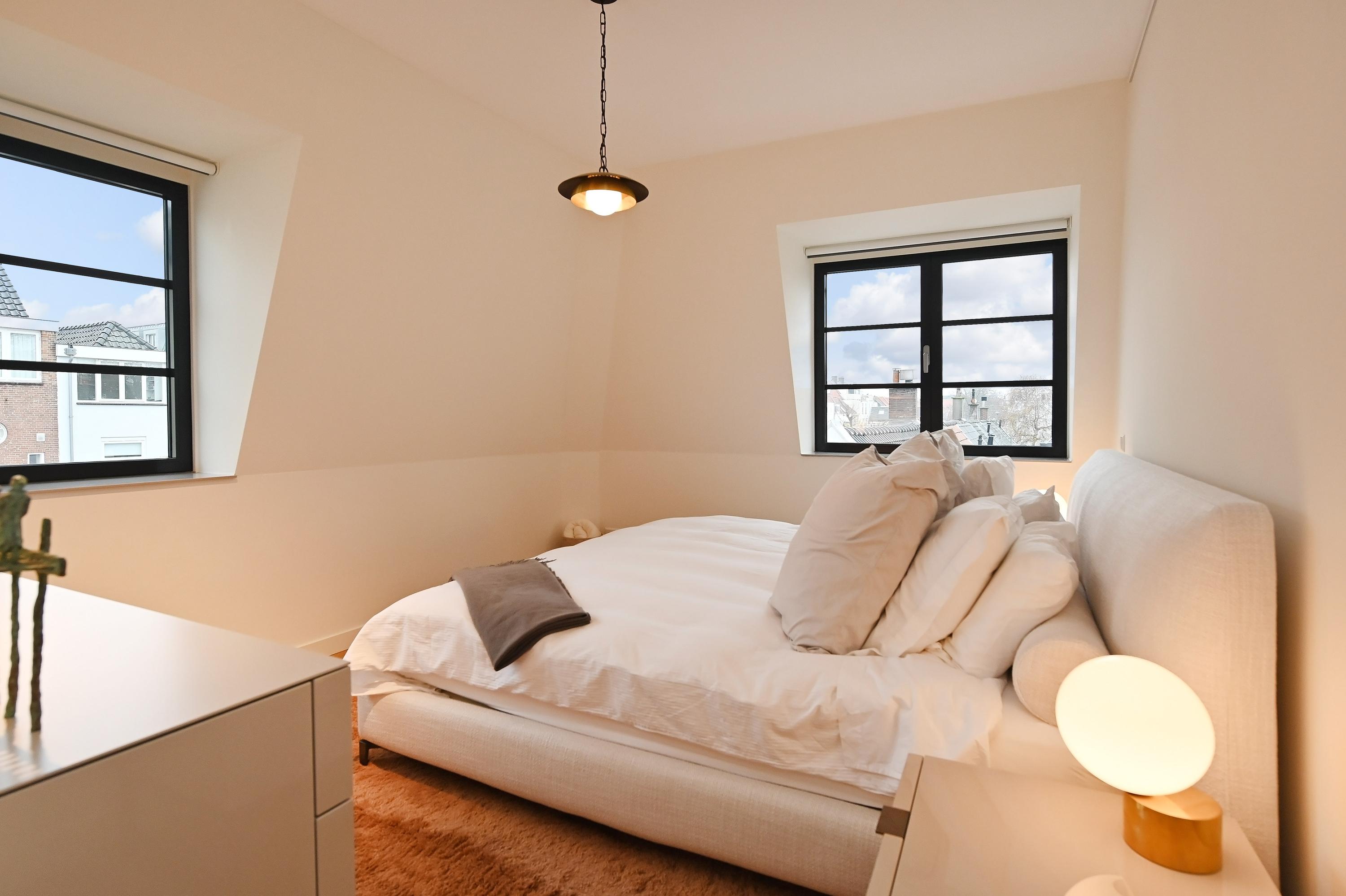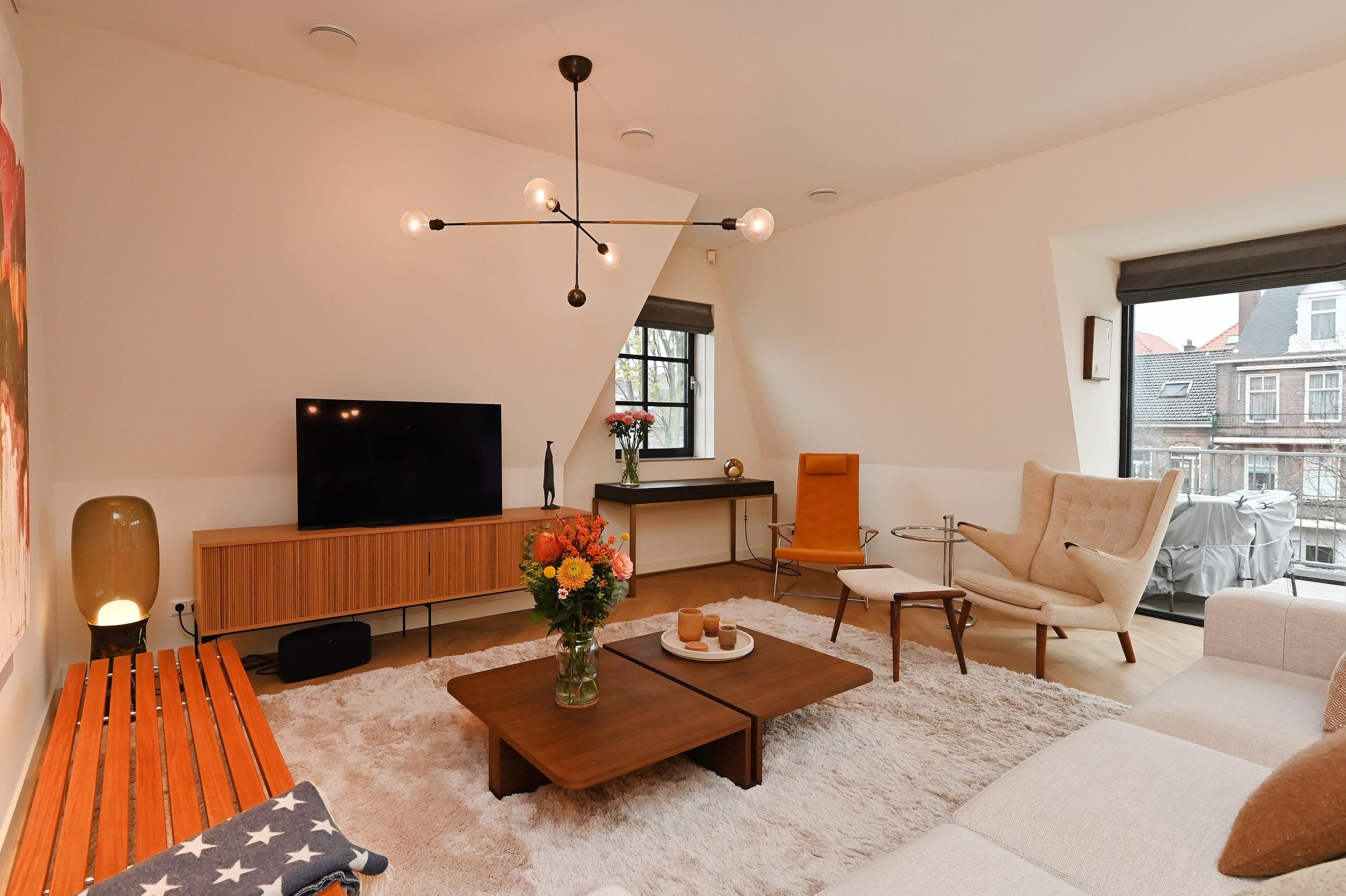 Trappenhuis met lift, centrale hal, ruime en lichte woonkamer met L-vormige Poggenpohl keuken met moderne ingebouwde keukenapparatuur (zoals een inductiekookplaat, oven en Quooker) en een aangrenzend zit-barretje. Middels een dubbele schuifdeur verleent de woonkamer toegang tot het ruime terras (ca. 13,5 m2) met middag en avondzon, vrij uitzicht en moderne afwerkingen. Ruime hoofdslaapkamer met badkamer die beschikt over een regendouche, toilet en dubbele wastafel. 2e ruime slaapkamer met ingebouwde kast en 3e slaapkamer met ingebouwde kasten. Deze beide slaapkamers zijn ook te gebruiken als kantoor- of hobbyruimten. Moderne en ruime badkamer met regendouche, dubbele wastafels en spiegelverlichting. Apart toilet in de hal.
