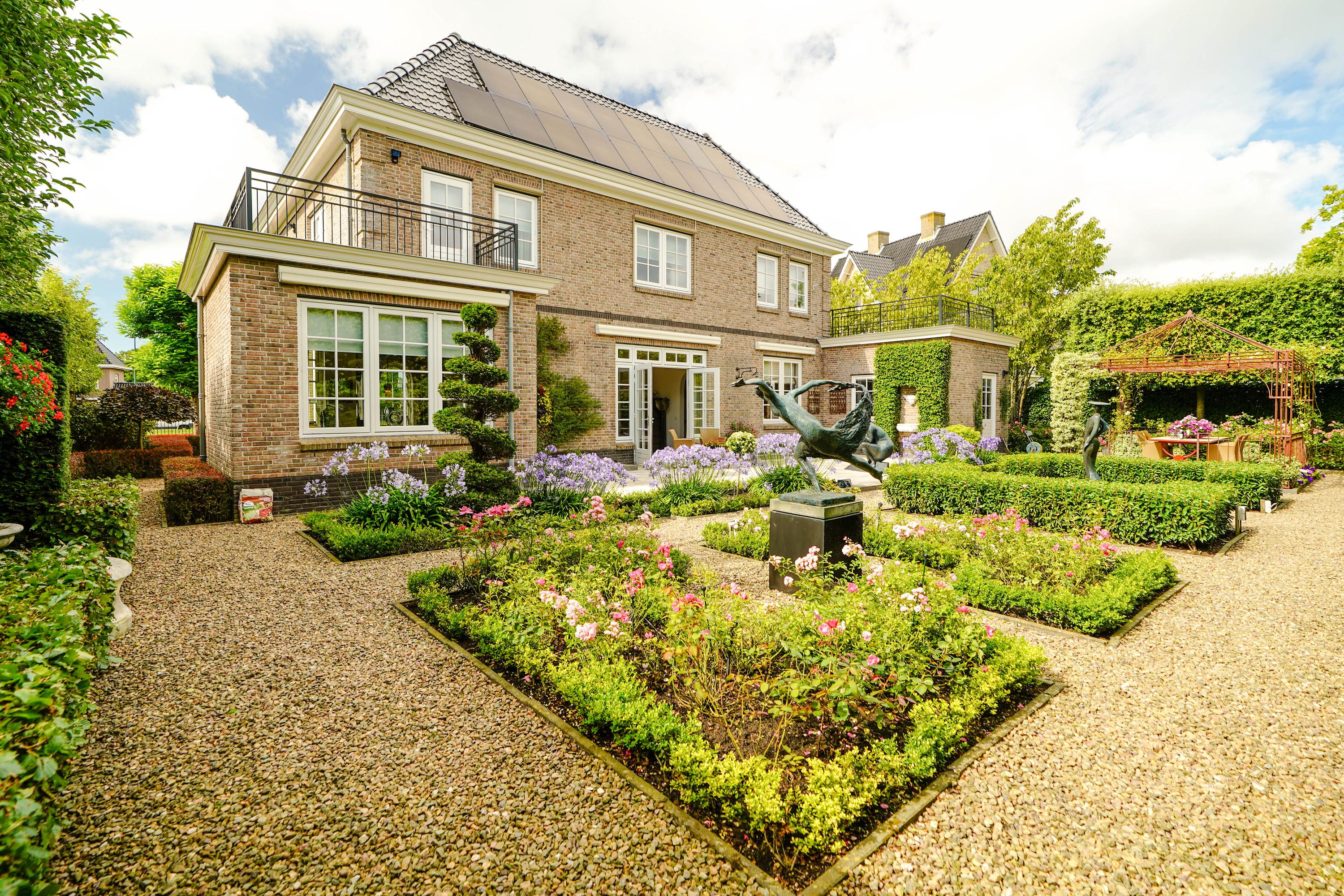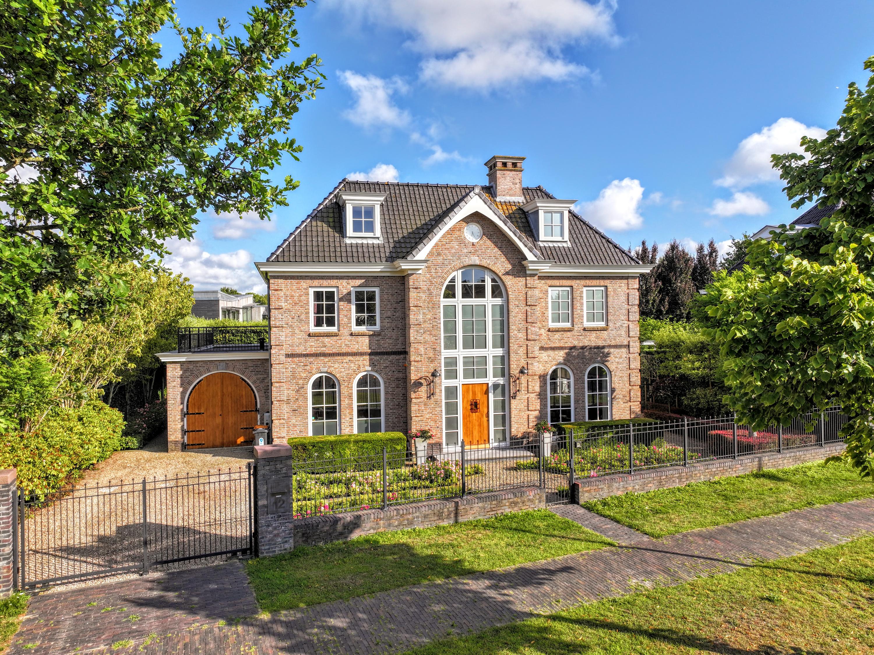 This villa is far from a standard design. Its uniqueness is immediately apparent from the four arched floor-to-ceiling windows and the curved glass facade of the central bay. This bespoke, country-style home is filled with exclusive details: brick cornerstones, a robust oak front door with custom wrought iron hardware, heavy arched "stable doors" on the garage, and elegant chimney and fascia detailing. The hand-formed brickwork and ceramic roof tiles were carefully selected. A satellite-controlled clock on the front gable automatically switches between summer and winter time.